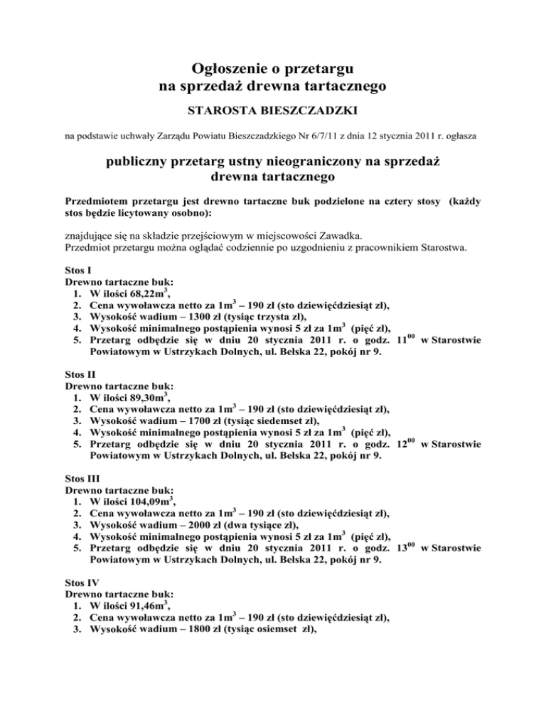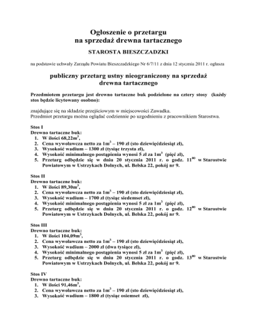 Ogłoszenie o przetargu na sprzedaż drewna tartacznego STAROSTA BIESZCZADZKI na podstawie uchwały Zarządu Powiatu Bieszczadzkiego Nr 6/7/11 z dnia 12 stycznia 2011 r. ogłasza publiczny przetarg ustny nieograniczony na sprzedaż drewna tartacznego Przedmiotem przetargu jest drewno tartaczne buk podzielone na cztery stosy (każdy stos będzie licytowany osobno): znajdujące się na składzie przejściowym w miejscowości Zawadka. Przedmiot przetargu można oglądać codziennie po uzgodnieniu z pracownikiem Starostwa. Stos I Drewno tartaczne buk: 1. W ilości 68,22m3, 2. Cena wywoławcza netto za 1m3 – 190 zł (sto dziewięćdziesiąt zł), 3. Wysokość wadium – 1300 zł (tysiąc trzysta zł), 4. Wysokość minimalnego postąpienia wynosi 5 zł za 1m3 (pięć zł), 5. Przetarg odbędzie się w dniu 20 stycznia 2011 r. o godz. 1100 w Starostwie Powiatowym w Ustrzykach Dolnych, ul. Bełska 22, pokój nr 9. Stos II Drewno tartaczne buk: 1. W ilości 89,30m3, 2. Cena wywoławcza netto za 1m3 – 190 zł (sto dziewięćdziesiąt zł), 3. Wysokość wadium – 1700 zł (tysiąc siedemset zł), 4. Wysokość minimalnego postąpienia wynosi 5 zł za 1m3 (pięć zł), 5. Przetarg odbędzie się w dniu 20 stycznia 2011 r. o godz. 1200 w Starostwie Powiatowym w Ustrzykach Dolnych, ul. Bełska 22, pokój nr 9. Stos III Drewno tartaczne buk: 1. W ilości 104,09m3, 2. Cena wywoławcza netto za 1m3 – 190 zł (sto dziewięćdziesiąt zł), 3. Wysokość wadium – 2000 zł (dwa tysiące zł), 4. Wysokość minimalnego postąpienia wynosi 5 zł za 1m3 (pięć zł), 5. Przetarg odbędzie się w dniu 20 stycznia 2011 r. o godz. 1300 w Starostwie Powiatowym w Ustrzykach Dolnych, ul. Bełska 22, pokój nr 9. Stos IV Drewno tartaczne buk: 1. W ilości 91,46m3, 2. Cena wywoławcza netto za 1m3 – 190 zł (sto dziewięćdziesiąt zł), 3. Wysokość wadium – 1800 zł (tysiąc osiemset zł), 4. Wysokość minimalnego postąpienia wynosi 5 zł za 1m3 (pięć zł), 5. Przetarg odbędzie się w dniu 20 stycznia 2011 r. o godz. 1400 w Starostwie Powiatowym w Ustrzykach Dolnych, ul. Bełska 22, pokój nr 9. Warunki przetargu: W przetargu mogą brać udział osoby fizyczne i prawne. Warunkiem udziału w przetargu jest wniesienie wadium w terminie do 19 stycznia 2011 r. gotówką w kasie urzędu lub przelewem na konto: BIESZCZADZKI BANK SPÓŁDZIELCZY W USTRZYKACH DOLNYCH nr konta: 72 8621 0007 2001 0006 3249 0003 Określony termin oznacza datę wpływu na konto Starostwa Powiatowego w Ustrzykach Dolnych. Przetarg jest ważny bez względu na liczbę uczestników, jeżeli chociaż jeden uczestnik zaoferował, co najmniej jedno postąpienie powyżej ceny wywoławczej. Wygrywający uczestnik przetargu zobowiązany będzie do kupienia całego stosu drewna. Wartość sprzedanego drewna (cena osiągnięta w wyniku przetargu) stanowić będzie iloczyn wylicytowanej ceny jednostkowej i ilości drewna w m3 powiększonej o podatek VAT. Wadium zwraca się niezwłocznie po odwołaniu lub zamknięciu przetargu. Wadium wpłacone przez uczestnika przetargu, który przetarg wygrał zalicza się w poczet ceny nabycia drewna. Wadium przepada jeżeli: - żaden z uczestników przetargu nie zgłosi co najmniej jednego postąpienia ponad cenę wywoławczą, - osoba która przetarg wygrała nie uiści ceny osiągniętej w przetargu w terminie podanym w ogłoszeniu. Zwrot wadium dla osób, które nie wygrały przetargu, nastąpi niezwłocznie po przetargu. Przetarg może być odwołany lub unieważniony bez podania przyczyny. Cenę osiągniętą w wyniku przetargu należy uiścić w kasie Starostwa Powiatowego w Ustrzykach Dolnych lub na rachunek bankowy Starostwa Powiatowego BIESZCZADZKI BANK SPÓŁDZIELCZY W USTRZYKACH DOLNYCH nr konta: 29 8621 0007 2001 0006 3249 0001 w terminie do 7 dni od dnia przetargu. Jeżeli wyłoniony nabywca nie dokona wpłaty należności za przedmiot przetargu w terminie do 7 dni od dnia rozstrzygnięcia, traci prawo do jego nabycia na rzecz kolejnego uczestnika przetargu, który wylicytował najwyższą cenę. Podpisanie umowy następuje niezwłocznie po zakończeniu przetargu. Wydanie przedmiotu przetargu nastąpi po uiszczeniu ceny nabycia. Nabywca zobowiązany jest do zabrania wylicytowanego drewna z miejsca składowania w terminie do 14 dni od dnia przeprowadzenia przetargu. Niniejsze ogłoszenie umieszcza się na stronie internetowej Starostwa Powiatowego w Ustrzykach Dolnych (www.bieszczadzki.pl) oraz wywiesza się na tablicy ogłoszeń. Osobą do kontaktu w sprawie przetargu jest Pan Marcin Sobas pracownik Wydziału Budownictwa i Ochrony Środowiska, ul. Pionierska 10, 38-700 Ustrzyki Dolne Tel: (13) 471 16 71, (13) 471 10 80 fax: (13) 471 10 73 w godzinach pracy urzędu. Starosta Bieszczadzki