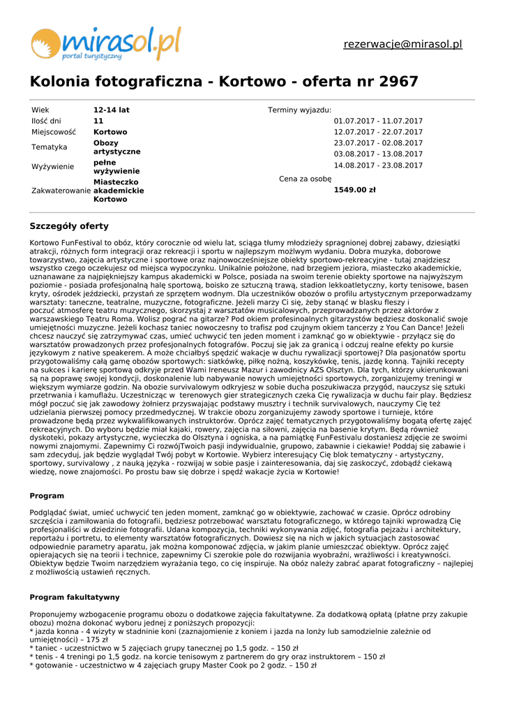 [email protected] Kolonia fotograficzna - Kortowo - oferta nr 2967 Wiek 12-14 lat Ilość dni 11 01.07.2017 - 11.07.2017 Miejscowość Kortowo 12.07.2017 - 22.07.2017 Tematyka Obozy artystyczne 23.07.2017 - 02.08.2017 Wyżywienie pełne wyżywienie 14.08.2017 - 23.08.2017 Miasteczko Zakwaterowanie akademickie Kortowo Terminy wyjazdu: 03.08.2017 - 13.08.2017 Cena za osobę 1549.00 zł Szczegóły oferty Kortowo FunFestival to obóz, który corocznie od wielu lat, sciąga tłumy młodzieży spragnionej dobrej zabawy, dziesiątki atrakcji, różnych form integracji oraz rekreacji i sportu w najlepszym możlwym wydaniu. Dobra muzyka, doborowe towarzystwo, zajęcia artystyczne i sportowe oraz najnowocześniejsze obiekty sportowo-rekreacyjne - tutaj znajdziesz wszystko czego oczekujesz od miejsca wypoczynku. Unikalnie położone, nad brzegiem jeziora, miasteczko akademickie, uznanawane za najpiękniejszy kampus akademicki w Polsce, posiada na swoim terenie obiekty sportowe na najwyższym poziomie - posiada profesjonalną halę sportową, boisko ze sztuczną trawą, stadion lekkoatletyczny, korty tenisowe, basen kryty, ośrodek jeździecki, przystań ze sprzętem wodnym. Dla uczestników obozów o profilu artystycznym przeporwadzamy warsztaty: taneczne, teatralne, muzyczne, fotograficzne. Jeżeli marzy Ci się, żeby stanąć w blasku fleszy i poczuć atmosferę teatru muzycznego, skorzystaj z warsztatów musicalowych, przeprowadzanych przez aktorów z warszawskiego Teatru Roma. Wolisz pograć na gitarze? Pod okiem profesinoalnych gitarzystów będziesz doskonalić swoje umiejętności muzyczne. Jeżeli kochasz taniec nowoczesny to trafisz pod czujnym okiem tancerzy z You Can Dance! Jeżeli chcesz nauczyć się zatrzymywać czas, umieć uchwycić ten jeden moment i zamknąć go w obiektywie - przyłącz się do warsztatów prowadzonych przez profesjonalnych fotografów. Poczuj się jak za granicą i odczuj realne efekty po kursie językowym z native speakerem. A może chciałbyś spędzić wakacje w duchu rywalizacji sportowej? Dla pasjonatów sportu przygotowaliśmy całą gamę obozów sportowych: siatkówkę, piłkę nożną, koszykówkę, tenis, jazdę konną. Tajniki recepty na sukces i karierę sportową odkryje przed Wami Ireneusz Mazur i zawodnicy AZS Olsztyn. Dla tych, którzy ukierunkowani są na poprawę swojej kondycji, doskonalenie lub nabywanie nowych umiejętności sportowych, zorganizujemy treningi w większym wymiarze godzin. Na obozie survivalowym odkryjesz w sobie ducha poszukiwacza przygód, nauczysz się sztuki przetrwania i kamuflażu. Uczestnicząc w terenowych gier strategicznych czeka Cię rywalizacja w duchu fair play. Będziesz mógł poczuć się jak zawodowy żołnierz przyswajając podstawy musztry i technik survivalowych, nauczymy Cię też udzielania pierwszej pomocy przedmedycznej. W trakcie obozu zorganizujemy zawody sportowe i turnieje, które prowadzone będą przez wykwalifikowanych instruktorów. Oprócz zajęć tematycznych przygotowaliśmy bogatą ofertę zajęć rekreacyjnych. Do wyboru będzie miał kajaki, rowery, zajęcia na siłowni, zajęcia na basenie krytym. Będą również dyskoteki, pokazy artystyczne, wycieczka do Olsztyna i ogniska, a na pamiątkę FunFestivalu dostaniesz zdjęcie ze swoimi nowymi znajomymi. Zapewnimy Ci rozwójTwoich pasji indywidualnie, grupowo, zabawnie i ciekawie! Poddaj się zabawie i sam zdecyduj, jak będzie wyglądał Twój pobyt w Kortowie. Wybierz interesujący Cię blok tematyczny - artystyczny, sportowy, survivalowy , z nauką języka - rozwijaj w sobie pasje i zainteresowania, daj się zaskoczyć, zdobądź ciekawą wiedzę, nowe znajomości. Po prostu baw się dobrze i spędź wakacje życia w Kortowie! Program Podglądać świat, umieć uchwycić ten jeden moment, zamknąć go w obiektywie, zachować w czasie. Oprócz odrobiny szczęścia i zamiłowania do fotografii, będziesz potrzebować warsztatu fotograficznego, w którego tajniki wprowadzą Cię profesjonaliści w dziedzinie fotografii. Udana kompozycja, techniki wykonywania zdjęć, fotografia pejzażu i architektury, reportażu i portretu, to elementy warsztatów fotograficznych. Dowiesz się na nich w jakich sytuacjach zastosować odpowiednie parametry aparatu, jak można komponować zdjęcia, w jakim planie umieszczać obiektyw. Oprócz zajęć opierających się na teorii i technice, zapewnimy Ci szerokie pole do rozwijania wyobraźni, wrażliwości i kreatywności. Obiektyw będzie Twoim narzędziem wyrażania tego, co cię inspiruje. Na obóz należy zabrać aparat fotograficzny – najlepiej z możliwością ustawień ręcznych. Program fakultatywny Proponujemy wzbogacenie programu obozu o dodatkowe zajęcia fakultatywne. Za dodatkową opłatą (płatne przy zakupie obozu) można dokonać wyboru jednej z poniższych propozycji: * jazda konna - 4 wizyty w stadninie koni (zaznajomienie z koniem i jazda na lonży lub samodzielnie zależnie od umiejętności) – 175 zł * taniec - uczestnictwo w 5 zajęciach grupy tanecznej po 1,5 godz. – 150 zł * tenis - 4 treningi po 1,5 godz. na korcie tenisowym z partnerem do gry oraz instruktorem – 150 zł * gotowanie - uczestnictwo w 4 zajęciach grupy Master Cook po 2 godz. – 150 zł Zakwaterowanie Dom studencki, pokoje 2 osobowe z łazienkami. W akademiku znajduje się świetlica, sala TV, całodobowa recepcja. Miasteczko akademickie Kortowo należy do Uniwersytetu Warmińsko-Mazurskiego w Olsztynie, położone jest poza miastem nad jeziorem Kortowskim, w otoczeniu lasów i parków. Na terenie miasteczka znajdują się akademiki, budynki uczelni i różnorodne obiekty sportowo-rekreacyjne: boiska ze sztuczną nawierzchnią do piłki nożnej, koszykówki i siatkówki, korty tenisowe, kryta pływalnia, przystań wodna ze sprzętem pływającym, kąpielisko strzeżone, hala sportowa, ośrodek jeździecki, dyskoteki. Świadczenia Zakwaterowanie: 10 noclegów (PPOK0814 - 9 noclegów) Wyżywienie: Całodzien