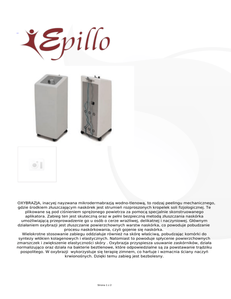 OXYBRAZJA, inacyej nayzwana mikrodermabrazją wodno-tlenową, to rodzaj peelingu mechanicznego, gdzie środkiem złuszczającym naskórek jest strumień rozproszonych kropelek soli fizjologicznej. Te plikowane są pod ciśnieniem sprężonego powietrza za pomocą specjalnie skonstruowanego aplikatora. Zabieg ten jest skuteczną oraz w pełni bezpieczną metodą złuszczania naskórka umożliwiającą przeprowadzenie go u osób o cerze wrażliwej, delikatnej i naczyniowej. Głównym działaniem oxybrazji jest złuszczanie powierzchownych warstw naskórka, co powoduje pobudzanie procesu naskórkowania, czyli gojenie się naskórka. Wielokrotne stosowanie zabiegu oddziałuje również na skórę właściwą, pobudzając komórki do syntezy włókien kolagenowych i elastycznych. Natomiast to powoduje spłycenie powierzchownych zmarszczek i zwiększenie elastyczności skóry . Oxybrazja przyspiesza usuwanie zaskórników, działa normalizująco oraz działa na bakterie beztlenowe, które odpowiedzialne są za powstawanie trądziku pospolitego. W oxybrazji wykorzystuje się terapię zimnem, co hartuje i wzmacnia ściany naczyń krwionośnych. Dzięki temu zabieg jest bezbolesny. Strona 1 z 2 Po przeanalizowaniu wyników badań, stwierdzono następujące działanie Oxybrazji: : Nawilża i dotlenia skórę Oczyszcza i dezynfekuje skórę (peeling płytki i głęboki) Łagodzi objawy trądziku (eliminuje bakterie beztlenowe) ogranicza łojotok (stabilizuje pracę gruczołów łojowych) Zmniejsza blizny potrądzikowe oraz przebarwienia Wzmacnia i hartuje ściany naczyń krwionośnych Wspomaga leczenie trądziku różowatego Łagodzi stany zapalne skóry Zmniejsza cellulit i rozstępy (hydrodynamiczny zimny masaż) Poprawia koloryt skóry Spłyca zmarszczki Rewitalizuje, czyli ożywia skórę Wskazania do zabiegu: - brak nawilżenia, odżywienia skóry - brak jędrności skóry - skóra z zaskórnikami, wymagająca oczyszczenia - nadmierne wydzielanie sebum - zmarszczki - rozstępy - cellulit - blizny Przeciwwskazania do zabiegu: - terapia przeciwtrądzikowa retinoidami (należy odczekać ok. pół roku po zakończeniu leczenia) - wykonany zabieg kwasami (odczekać min. tydzień) - infekcje skóry (wirusowe, bakteryjne, grzybicze) - łuszczyca w fazie aktywnej - uszkodzenia naskórka (również po wykonanej depilacji) - zmiany ropne w obrębie skóry (należy omijać aby nie doszło do nadkażenia zdrowej skóry) - ciężkie choroby ogólnoustrojowe - stany zapalne skóry - świeże blizny (należy odczekać aż rana się całkowicie zagoi a blizna nie będzie już bolesna - nadciśnienie Strona 2 z 2