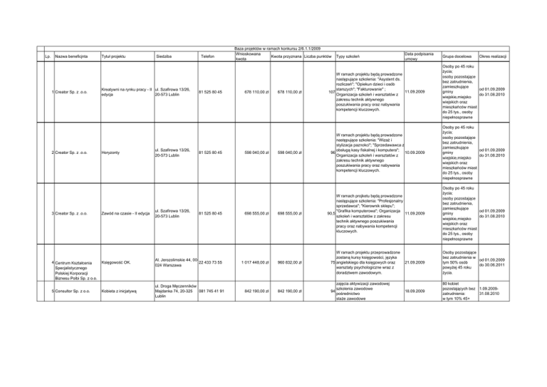 Lp. Nazwa beneficjnta 1 Creator Sp. z .o.o. 2 Creator Sp. z .o.o. Tytuł projektu Siedziba Kreatywni na rynku pracy - II ul. Szafirowa 13/26, edycja 20-573 Lublin Horyzonty ul. Szafirowa 13/26, 20-573 Lublin Telefon 81 525 80 45 81 525 80 45 Zawód na czasie - II edycja ul. Szafirowa 13/26, 20-573 Lublin 4 Centrum Kształcenia Specjalistycznego Polskiej Korporacji Biznesu Polbi Sp. z o.o. Księgowość OK. Al. Jerozolimskie 44, 0022 433 73 55 024 Warszawa 5 Consultor Sp. z o.o. Kobieta z inicjatywą ul. Droga Męczenników Majdanka 74, 20-325 081 745 41 91 Lublin 3 Creator Sp. z .o.o. 81 525 80 45 Baza projektów w ramach konkursu 2/6.1.1/2009 Wnioskowana Kwota przyznana Liczba punktów kwota 678 110,00 zł 598 040,00 zł 698 555,00 zł Typy szkoleń Data podpisania umowy Grupa docelowa Okres realizacji 678 110,00 zł W ramach projektu będą prowadzone następujące szkolenia: "Asystent ds. rozliczeń"; "Opiekun dzieci i osób starszych"; "Fakturowanie" ; 11.09.2009 107 Organizacja szkoleń i warsztatów z zakresu technik aktywnego poszukiwania pracy oraz nabywania kompetencji kluczowych. Osoby po 45 roku życia; osoby pozostające bez zatrudnienia, zamieszkujące od 01.09.2009 gminy do 31.08.2010 wiejskie,miejsko wiejskich oraz mieszkańców miast do 25 tys., osoby niepełnosprawne 598 040,00 zł W ramach projektu będą prowadzone następujące szkolenia: "Wizaż i stylizacja paznokci"; "Sprzedawawca z obsługą kasy fiskalnej i komputera"; 96 10.09.2009 Organizacja szkoleń i warsztatów z zakresu technik aktywnego poszukiwania pracy oraz nabywania kompetencji kluczowych. Osoby po 45 roku życia; osoby pozostające bez zatrudnienia, zamieszkujące od 01.09.2009 gminy do 31.08.2010 wiejskie,miejsko wiejskich oraz mieszkańców miast do 25 tys., osoby niepełnosprawne 698 555,00 zł W ramach projketu będą prowadzone następujące szkolenia: "Profesjonalny sprzedawca"; "Kierownik sklepu"; "Grafika komputerowa"; Organizacja 11.09.2009 90,5 szkoleń i warsztatów z zakresu technik aktywnego poszukiwania pracy oraz nabywania kompetencji kluczowych. Osoby po 45 roku życia; osoby pozostające bez zatrudnienia, zamieszkujące od 01.09.2009 gminy do 31.08.2010 wiejskie,miejsko wiejskich oraz mieszkańców miast do 25 tys., osoby niepełnosprawne 1 017 448,00 zł 960 832,00 zł W ramach projektu przeprowadzone zostaną kursy księgowości, języka 75 angielskiego dla księgowych oraz warsztaty psychologiczne wraz z doradztwem zawodowym. 842 190,00 zł 842 190,00 zł 94 zajęcia aktywizacji zawodowej szkolenia zawodowe pośrednictwo staże zawodowe 21.09.2009 Osoby pozostające bez zatrudnienia w od 01.09.2009 tym 50% osób do 30.06.2011 powyżej 45 roku życia. 18.09.2009 80 kobiet pozostających bez zatrudnienia: w tym 10% 45+ 1.09.200931.08.2010