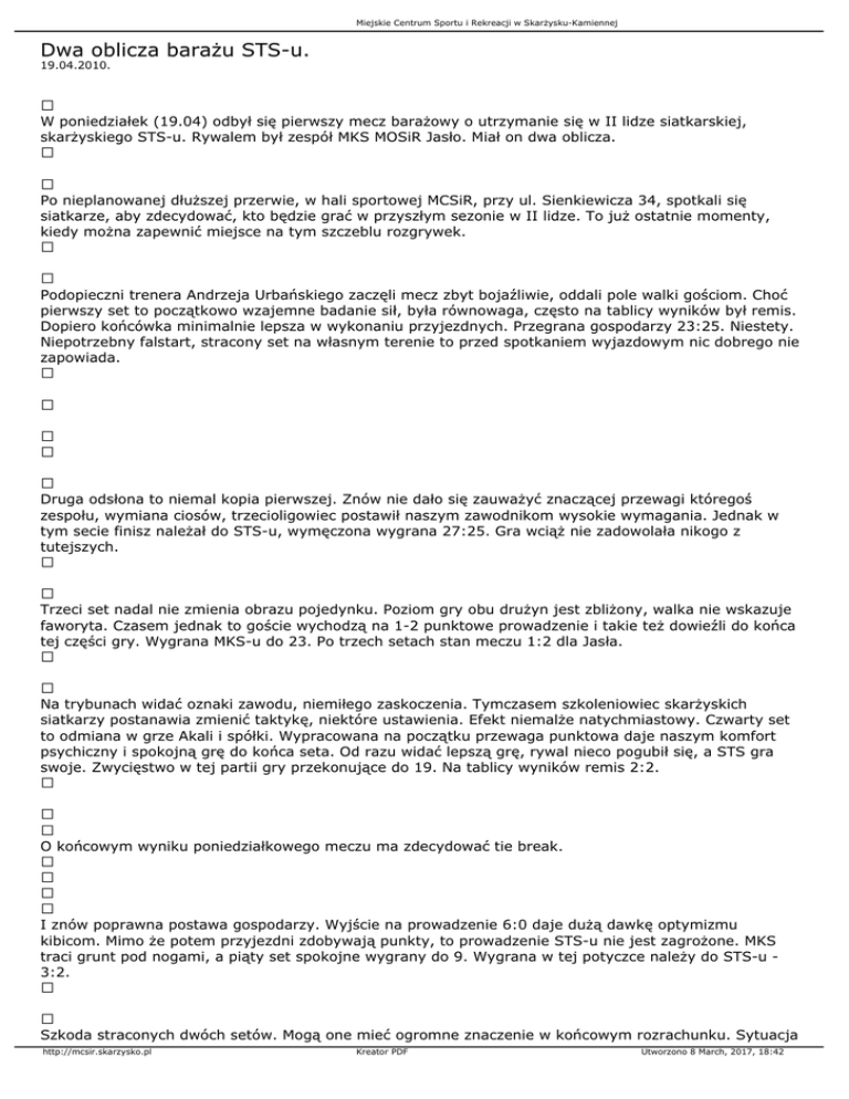 Miejskie Centrum Sportu i Rekreacji w Skarżysku-Kamiennej Dwa oblicza barażu STS-u. 19.04.2010. W poniedziałek (19.04) odbył się pierwszy mecz barażowy o utrzymanie się w II lidze siatkarskiej, skarżyskiego STS-u. Rywalem był zespół MKS MOSiR Jasło. Miał on dwa oblicza. Po nieplanowanej dłuższej przerwie, w hali sportowej MCSiR, przy ul. Sienkiewicza 34, spotkali się siatkarze, aby zdecydować, kto będzie grać w przyszłym sezonie w II lidze. To już ostatnie momenty, kiedy można zapewnić miejsce na tym szczeblu rozgrywek. Podopieczni trenera Andrzeja Urbańskiego zaczęli mecz zbyt bojaźliwie, oddali pole walki gościom. Choć pierwszy set to początkowo wzajemne badanie sił, była równowaga, często na tablicy wyników był remis. Dopiero końcówka minimalnie lepsza w wykonaniu przyjezdnych. Przegrana gospodarzy 23:25. Niestety. Niepotrzebny falstart, stracony set na własnym terenie to przed spotkaniem wyjazdowym nic dobrego nie zapowiada. Druga odsłona to niemal kopia pierwszej. Znów nie dało się zauważyć znaczącej przewagi któregoś zespołu, wymiana ciosów, trzecioligowiec postawił naszym zawodnikom wysokie wymagania. Jednak w tym secie finisz należał do STS-u, wymęczona wygrana 27:25. Gra wciąż nie zadowolała nikogo z tutejszych. Trzeci set nadal nie zmienia obrazu pojedynku. Poziom gry obu drużyn jest zbliżony, walka nie wskazuje faworyta. Czasem jednak to goście wychodzą na 1-2 punktowe prowadzenie i takie też dowieźli do końca tej części gry. Wygrana MKS-u do 23. Po trzech setach stan meczu 1:2 dla Jasła. Na trybunach widać oznaki zawodu, niemiłego zaskoczenia. Tymczasem szkoleniowiec skarżyskich siatkarzy postanawia zmienić taktykę, niektóre ustawienia. Efekt niemalże natychmiastowy. Czwarty set to odmiana w grze Akali i spółki. Wypracowana na początku przewaga punktowa daje naszym komfort psychiczny i spokojną grę do końca seta. Od razu widać lepszą grę, rywal nieco pogubił się, a STS gra swoje. Zwycięstwo w tej partii gry przekonujące do 19. Na tablicy wyników remis 2:2. O końcowym wyniku poniedziałkowego meczu ma zdecydować tie break. I znów poprawna postawa gospodarzy. Wyjście na prowadzenie 6:0 daje dużą dawkę optymizmu kibicom. Mimo że potem przyjezdni zdobywają punkty, to prowadzenie STS-u nie jest zagrożone. MKS traci grunt pod nogami, a piąty set spokojne wygrany do 9. Wygrana w tej potyczce należy do STS-u 3:2. Szkoda straconych dwóch setów. Mogą one mieć ogromne znaczenie w końcowym rozrachunku. Sytuacja http://mcsir.skarzysko.pl Kreator PDF Utworzono 8 March, 2017, 18:42 Miejskie Centrum Sportu i Rekreacji w Skarżysku-Kamiennej jest poważna. STS nie może w Jaśle przegrać, a w przypadku 3:2 dla MKS-u będą się liczyć małe punkty. Już nawet przegrana 3:1 powoduje degradację skarżyskiej drużyny... Rewanż, ostatnie być albo nie być w II lidze w sobotę (24.04) w Jaśle, o godz. 17.00. - STS Skarżysko-Kamienna : MKS MOSiR Jasło 3:2 (23:25, 27:25, 23:25, 25:19, 15:9) STS Skarżysko: Brodawka, Brojek,Akala, Krzyształowicz, Szataniak, Lisowski, Marcin Szumielewicz, Waligóra, Golonka, Michał Szumielewicz. Trener: Andrzej Urbański MKS MOSiR Jasło: Kumor, Cabaj, Gliwa, Wietecha, Janik, Łaba, Wrzosek, Zabawa, Cynkiel, Pawlik, Dedo Trener: Marcin Ciosek http://mcsir.skarzysko.pl Kreator PDF Utworzono 8 March, 2017, 18:42