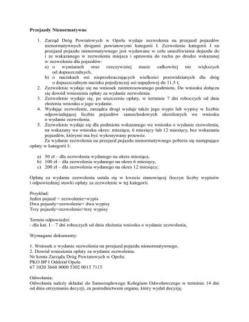 Przejazdy Nienormatywne 1. Zarząd Dróg Powiatowych w Opolu wydaje zezwolenia na przejazd pojazdów nienormatywnych drogami powiatowymi kategorii I. Zezwolenie kategorii I na przejazd pojazdu nienormatywnego jest wydawane w celu umożliwienia dojazdu do i ze wskazanego w zezwoleniu miejsca i uprawnia do ruchu po drodze wskazanej w zezwoleniu dla pojazdów: a) o wymiarach oraz rzeczywistej masie całkowitej nie większych od dopuszczalnych, b) o naciskach osi nieprzekraczających wielkości przewidzianych dla dróg o dopuszczalnym nacisku pojedynczej osi napędowej do 11,5 t; 2. Zezwolenie wydaje się na wniosek zainteresowanego podmiotu. Do wniosku dołącza się dowód wniesienia opłaty za wydanie zezwolenia. 3. Zezwolenie wydaje się, po uiszczeniu opłaty, w terminie 7 dni roboczych od dnia złożenia wniosku o jego wydanie. 4. Wydając zezwolenie, zarządca drogi wydaje także jego wypis lub wypisy w liczbie odpowiadającej liczbie pojazdów samochodowych określonych we wniosku o wydanie zezwolenia. 5. Zezwolenie wydaje się dla podmiotu wskazanego we wniosku o wydanie zezwolenia, na wskazany we wniosku okres: miesiąca, 6 miesięcy lub 12 miesięcy, bez wskazania pojazdów, którymi ma być wykonywany przewóz. Za wydanie zezwolenia na przejazd pojazdu nienormatywnego pobiera się następujące opłaty w kategorii I: a) 50 zł – dla zezwolenia wydanego na okres miesiąca, b) 100 zł – dla zezwolenia wydanego na okres 6 miesięcy, c) 200 zł – dla zezwolenia wydanego na okres 12 miesięcy; Opłatę za wydanie zezwolenia ustala się w kwocie stanowiącej iloczyn liczby wypisów i odpowiedniej stawki opłaty za zezwolenie w tej kategorii. Przykład: Jeden pojazd = zezwolenie+wypis Dwa pojazdy=zezwolenie+ dwa wypisy Trzy pojazdy=zezwolenie+trzy wypisy Termin odpowiedzi: - dla kat. I – 7 dni roboczych od dnia złożenia wniosku o wydanie zezwolenia, Wymagane dokumenty: 1. Wniosek o wydanie zezwolenia na przejazd pojazdu nienormatywnego, 2. Dowód wniesienia opłaty za wydanie zezwolenia. Nr konta Zarządu Dróg Powiatowych w Opolu: PKO BP I Oddział Opole 67 1020 3668 0000 5302 0015 7115 Odwołania: Odwołania należy składać do Samorządowego Kolegium Odwoławczego w terminie 14 dni od dnia otrzymania decyzji, za pośrednictwem organu, który wydał decyzję. Podstawa prawna: 1. Ustawa z dnia 20 czerwca 1997 r. Prawo o ruchu drogowym (Dz. U. z 2005 r. Nr 108, poz.908, z późn. zm.). 2. Rozporządzenie Ministra Transportu, Budownictwa i Gospodarki Morskiej z dnia 28 marca 2012 r. w sprawie wysokości opłat za wydanie zezwolenia na przejazd pojazdu nienormatywnego (Dz. U. z 2012 r., poz. 366). 3. Rozporządzenie Ministra Transportu, Budownictwa i Gospodarki Morskiej z dnia 23 maja 2012 r. w sprawie pilotowania pojazdów nienormatywnych (Dz. U. z 2012 r., poz. 629). 4. Rozporządzenie Ministra Transportu, Budownictwa i Gospodarki Morskiej z dnia 22 czerwca 2012 r. w sprawie zezwoleń na przejazd pojazdów nienormatywnych (Dz. U. z 2012 r., poz. 764). 5. Ustawa z dnia 14 czerwca 1960 r. Kodeks postępowania administracyjnego (Dz. U. z 2000 r. Nr 98, poz. 1071, z późn. zm.).6. Ustawa z dnia 21 marca 1985 r. o drogach publicznych (Dz. U. z 2007 r. Nr 19, poz. 115, z późn. zm.).