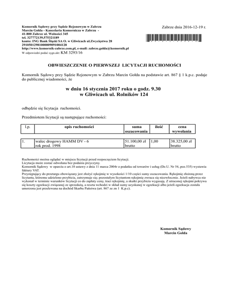 Komornik Sądowy przy Sądzie Rejonowym w Zabrzu Marcin Gołda - Kancelaria Komornicza w Zabrzu 41-800 Zabrze ul. Wolności 345 tel. 327772139,575321189 konto: ING Bank Śląski SA O. w Gliwicach ul.Zwycięstwa 28 29105012981000009091004128 http://www.komornik-zabrze.com.pl, e-mail: [email protected] W odpowiedzi podać sygn.akt: KM Zabrze dnia 2016-12-19 r. *8016121900616* 3293/16 OBWIESZCZENIE O PIERWSZEJ LICYTACJI RUCHOMOŚCI Komornik Sądowy przy Sądzie Rejonowym w Zabrzu Marcin Gołda na podstawie art. 867 § 1 k.p.c. podaje do publicznej wiadomości, że w dniu 16 stycznia 2017 roku o godz. 9.30 w Gliwicach ul. Rolników 124 odbędzie się licytacja ruchomości. Przedmiotem licytacji są następujące ruchomości: l.p. 1. opis ruchomości walec drogowy HAMM DV - 6 rok prod. 1998 suma oszacowania 51.100,00 zł brutto ilość 1,00 cena wywołania 38.325,00 zł brutto Ruchomości można oglądać w miejscu licytacji przed rozpoczęciem licytacji. Licytacja może zostać odwołana bez podania przyczyny. Komornik Sądowy w oparciu o art.18 ustawy z dnia 11 marca 2004r o podatku od towarów i usług (Dz.U. Nr 54, poz.535) wystawia faktury VAT. Przystępujący do przetargu obowiązany jest złożyć rękojmię w wysokości 1/10 części sumy oszacowania. Rękojmię złożoną przez licytanta, któremu udzielono przybicia, zatrzymuje się; pozostałym licytantom rękojmię zwraca się niezwłocznie. Jeżeli nabywca nie wykonał w terminie warunków licytacji co do zapłaty ceny, traci rękojmię, a skutki przybicia wygasają. Z utraconej rękojmi pokrywa się koszty egzekucji związanej ze sprzedażą, a reszta wchodzi w skład sumy uzyskanej w egzekucji albo jeżeli egzekucja została umorzona jest przelewana na dochód Skarbu Państwa (art. 867 ze zn 1 K.p.c). Komornik Sądowy Marcin Gołda