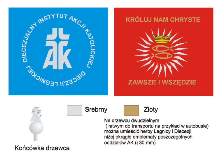 KRÓLUJ NAM CHRYSTE LICKIE J ATO D IK DIECEZJAL J N IE TYTUT AK S CJ IN Y IE CE Z J I L E GN I C K Srebrny Końcówka drzewca Złoty Na drzewcu dwudzielnym ( łatwym do transportu na przykład w autobusie) można umieścić herby Legnicy i Diecezji niżej okrągłe emblematy poszczególnych oddziałów AK (φ 30 mm)
