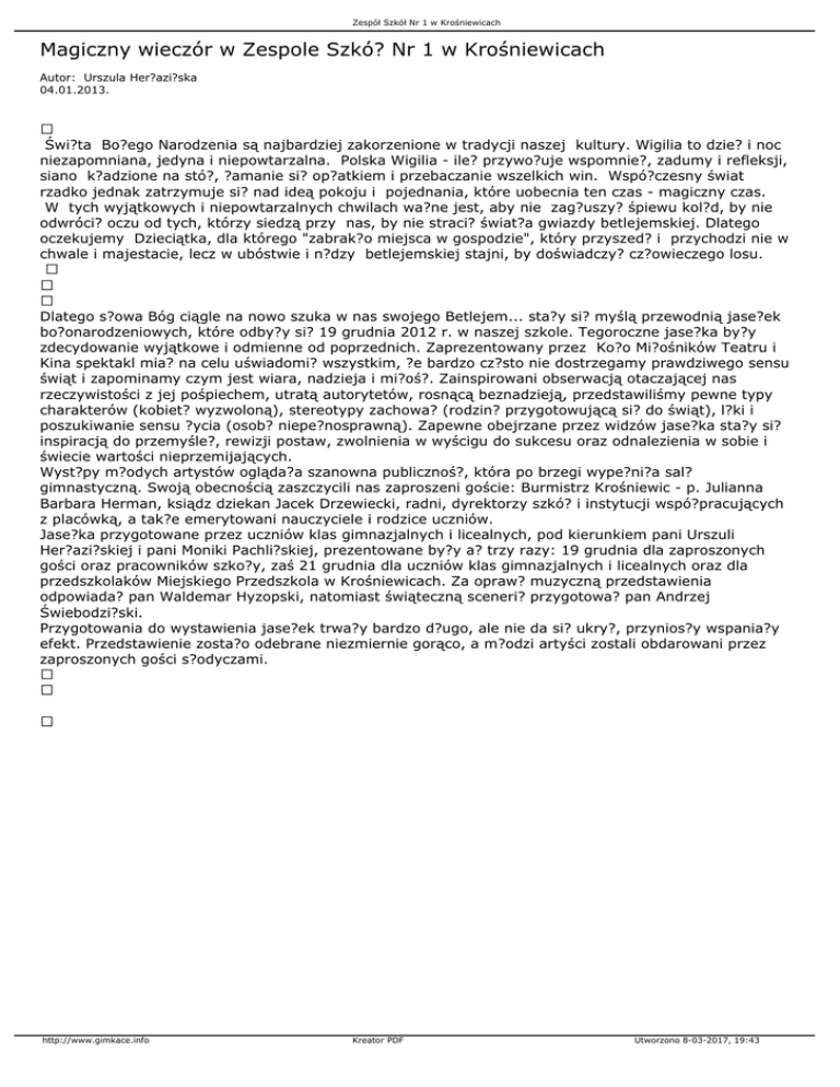 Zespół Szkół Nr 1 w Krośniewicach Magiczny wieczór w Zespole Szkó? Nr 1 w Krośniewicach Autor: Urszula Her?azi?ska 04.01.2013. Świ?ta Bo?ego Narodzenia są najbardziej zakorzenione w tradycji naszej kultury. Wigilia to dzie? i noc niezapomniana, jedyna i niepowtarzalna. Polska Wigilia - ile? przywo?uje wspomnie?, zadumy i refleksji, siano k?adzione na stó?, ?amanie si? op?atkiem i przebaczanie wszelkich win. Wspó?czesny świat rzadko jednak zatrzymuje si? nad ideą pokoju i pojednania, które uobecnia ten czas - magiczny czas. W tych wyjątkowych i niepowtarzalnych chwilach wa?ne jest, aby nie zag?uszy? śpiewu kol?d, by nie odwróci? oczu od tych, którzy siedzą przy nas, by nie straci? świat?a gwiazdy betlejemskiej. Dlatego oczekujemy Dzieciątka, dla którego "zabrak?o miejsca w gospodzie", który przyszed? i przychodzi nie w chwale i majestacie, lecz w ubóstwie i n?dzy betlejemskiej stajni, by doświadczy? cz?owieczego losu. Dlatego s?owa Bóg ciągle na nowo szuka w nas swojego Betlejem... sta?y si? myślą przewodnią jase?ek bo?onarodzeniowych, które odby?y si? 19 grudnia 2012 r. w naszej szkole. Tegoroczne jase?ka by?y zdecydowanie wyjątkowe i odmienne od poprzednich. Zaprezentowany przez Ko?o Mi?ośników Teatru i Kina spektakl mia? na celu uświadomi? wszystkim, ?e bardzo cz?sto nie dostrzegamy prawdziwego sensu świąt i zapominamy czym jest wiara, nadzieja i mi?oś?. Zainspirowani obserwacją otaczającej nas rzeczywistości z jej pośpiechem, utratą autorytetów, rosnącą beznadzieją, przedstawiliśmy pewne typy charakterów (kobiet? wyzwoloną), stereotypy zachowa? (rodzin? przygotowującą si? do świąt), l?ki i poszukiwanie sensu ?ycia (osob? niepe?nosprawną). Zapewne obejrzane przez widzów jase?ka sta?y si? inspiracją do przemyśle?, rewizji postaw, zwolnienia w wyścigu do sukcesu oraz odnalezienia w sobie i świecie wartości nieprzemijających. Wyst?py m?odych artystów ogląda?a szanowna publicznoś?, która po brzegi wype?ni?a sal? gimnastyczną. Swoją obecnością zaszczycili nas zaproszeni goście: Burmistrz Krośniewic - p. Julianna Barbara Herman, ksiądz dziekan Jacek Drzewiecki, radni, dyrektorzy szkó? i instytucji wspó?pracujących z placówką, a tak?e emerytowani nauczyciele i rodzice uczniów. Jase?ka przygotowane przez uczniów klas gimnazjalnych i licealnych, pod kierunkiem pani Urszuli Her?azi?skiej i pani Moniki Pachli?skiej, prezentowane by?y a? trzy razy: 19 grudnia dla zaproszonych gości oraz pracowników szko?y, zaś 21 grudnia dla uczniów klas gimnazjalnych i licealnych oraz dla przedszkolaków Miejskiego Przedszkola w Krośniewicach. Za opraw? muzyczną przedstawienia odpowiada? pan Waldemar Hyzopski, natomiast świąteczną sceneri? przygotowa? pan Andrzej Świebodzi?ski. Przygotowania do wystawienia jase?ek trwa?y bardzo d?ugo, ale nie da si? ukry?, przynios?y wspania?y efekt. Przedstawienie zosta?o odebrane niezmiernie gorąco, a m?odzi artyści zostali obdarowani przez zaproszonych gości s?odyczami. http://www.gimkace.info Kreator PDF Utworzono 8-03-2017, 19:43