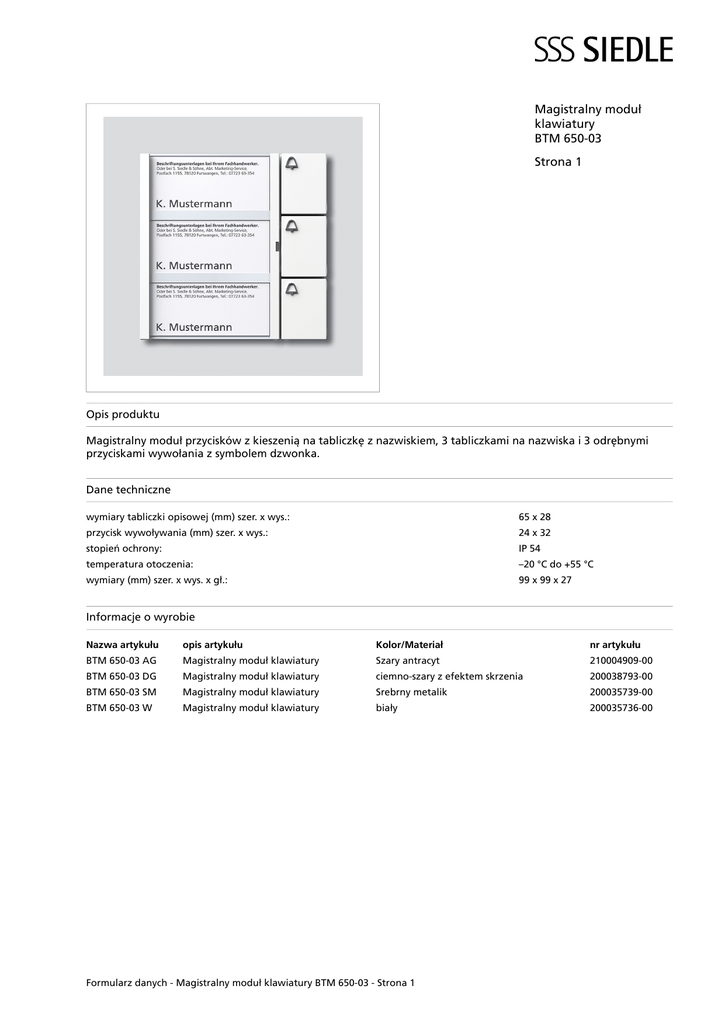 Magistralny moduł klawiatury BTM 650-03 Strona 1 Opis produktu Magistralny moduł przycisków z kieszenią na tabliczkę z nazwiskiem, 3 tabliczkami na nazwiska i 3 odrębnymi przyciskami wywołania z symbolem dzwonka. Dane techniczne wymiary tabliczki opisowej (mm) szer. x wys.: 65 x 28 przycisk wywoływania (mm) szer. x wys.: 24 x 32 stopień ochrony: IP 54 temperatura otoczenia: –20 °C do +55 °C wymiary (mm) szer. x wys. x gł.: 99 x 99 x 27 Informacje o wyrobie Nazwa�artykułu opis�artykułu Kolor/Materiał nr�artykułu BTM 650-03 AG Magistralny moduł klawiatury Szary antracyt 210004909-00 BTM 650-03 DG Magistralny moduł klawiatury ciemno-szary z efektem skrzenia 200038793-00 BTM 650-03 SM Magistralny moduł klawiatury Srebrny metalik 200035739-00 BTM 650-03 W Magistralny moduł klawiatury biały 200035736-00 Formularz danych - Magistralny moduł klawiatury BTM 650-03 - Strona 1 Magistralny moduł klawiatury BTM 650-03 Strona 2 Osprzęt Nazwa�artykułu opis�artykułu Kolor/Materiał nr�artykułu Vario 611 AG Lakier naprawczy Szary antracyt 210005171-00 Vario 611 DG Lakier naprawczy ciemno-szary z efektem skrzenia 200039946-01 Vario 611 SM Lakier naprawczy Srebrny metalik 200039937-01 Vario 611 W Lakier naprawczy biały 200039936-01 Części zamienne Nazwa�artykułu opis�artykułu Kolor/Materiał nr�artykułu TM 612-3/BTM 650-03 DG Przycisk dzwonka z symbolem dzwonka ciemno-szary z efektem skrzenia 200029943-00 TM 612-3/BTM 650-03 DG Tabliczka na nazwisko kpl. ciemno-szary z efektem skrzenia 200029959-00 TM 612-3/BTM 650-03 SM Przycisk dzwonka z symbolem dzwonka Srebrny metalik 200029804-00 TM 612-3/BTM 650-03 SM Tabliczka na nazwisko kpl. Srebrny metalik 200029792-00 TM 612-3/BTM 650-03 W Przycisk dzwonka z symbolem dzwonka biały 200029806-00 TM 612-3/BTM 650-03 W Tabliczka na nazwisko kpl. biały 200029794-00 Formularz danych - Magistralny moduł klawiatury BTM 650-03 - Strona 2 Magistralny moduł klawiatury BTM 650-03 Strona 3 Formularz danych - Magistralny moduł klawiatury BTM 650-03 - Strona 3 Magistralny moduł klawiatury BTM 650-03 Strona 4 Informacja o produktach 1,1 MB Pobieranie Deklaracja Zgodności 1,2 MB Pobieranie Napisy 1,9 MB Pobieranie Formularz danych - Magistralny moduł klawiatury BTM 650-03 - Strona 4