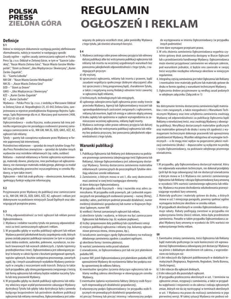 REGULAMIN OGŁOSZEŃ I REKLAM Definicje §1 Ilekroć w niniejszym dokumencie występują poniżej zdefiniowane sformułowania, należy je rozumieć w następujący sposób: Zasady ogólne – ogólne zasady zamieszczania ogłoszeń w Polska Press Sp. z o.o. Oddział w Zielonej Górze, w tym w "Gazecie Lubuskiej”, "Nasze Miasto Zielona Góra”, "Nasze Miasto Gorzów Wielkopolski”, "Dzień za Dniem”, „Głos Międzyrzecza i Skwierzyny”, „Kurier Żarsko-Żagański”, GL - "Gazeta Lubuska” NM GW - "Nasze Miasto Gorzów Wielkopolski” NM ZG – „Nasze Miasto Zielona Góra” DZD – " Dzień za Dniem” GMiS – „Głos Międzyrzecza i Skwierzyny” KŻŻ – „Kurier Żarsko-Żagański” KZ – „Kurier Zachodni” Wydawca – Polska Press Sp. z o.o. z siedzibą w Warszawie Oddział w Zielonej Górze al. Niepodległości 25, 65-042 Zielona Góra, zarejestrowana w rejestrze przedsiębiorców Krajowego Rejestru Sądowego, Sądu Rejonowego dla m.st. Warszawy pod numerem 2408, NIP 522-01-03-609 Ogłoszeniodawca – osoba fizyczna, osoba prawna lub inna jednostka organizacyjna nie posiadająca osobowości prawnej zamawiająca zamieszczenie w GL, NM GW, NM ZG, DZD, GMiS, KŻŻ, KZ, ogłoszeń lub reklamy; Tytuły – gazety lub czasopisma wydawane przez Wydawcę w formie papierowej lub internetowej. Pośrednictwo reklamowe – sprzedaż do innych tytułów Grupy Polska Press Pośrednictwo zewnętrzne – sprzedaż do tytułów innych wydawców oraz nośników reklamowych (np. radio, outdoor) Reklama – materiał reklamowy w formie ogłoszenia wymiarowego, materiały słowne, plastyczne, inne pochodzące od ogłoszeniodawcy, nie stanowiące materiału redakcyjnego, płatnego za moduł lub inną jednostkę powierzchni wyszczególnioną w cenniku Wydawcy, w tym także insert; Ogłoszenie – tekst lub znak graficzny – obwieszczenie, komunikat, spełniający funkcje wyłącznie informacyjną §2 Przyjmowanie przez Wydawcę do publikacji oraz zamieszczanie w GL, NM GW, NM ZG, DZD, GMiS, KŻŻ, KZ, ogłoszeń i reklam jest dokonywane na podstawie niniejszych Zasad Ogólnych oraz obowiązujących przepisów prawa. §3 1. Pełną odpowiedzialność za treść ogłoszeń lub reklam ponosi Ogłoszeniodawca. 2. Wydawca i redaktor naczelny tytułu nie ponoszą odpowiedzialności za treść zamieszczonych ogłoszeń i reklam. 3. W przypadku gdyby w wyniku publikacji ogłoszeń lub reklam Wydawca poniósł jakiekolwiek koszty zaspokojenia osób, których prawa zostały poprzez publikacje naruszone (w tym w szczególności dobra osobiste, autorskie, pokrewne, wynalazcze, na znakach towarowych lub wzorach zdobniczych, z tytułu tajemnicy przedsiębiorstwa i inne), Ogłoszeniodawca jest zobowiązany pokryć te koszty w całości łącznie z kosztami postępowań spornych, wpisów sądowych, kosztów zastępstwa procesowego, zawartych ugód, itp. i innych uzasadnionych wydatków Wydawcy poniesionych w związku z roszczeniami osób trzecich. Dotyczy to także tych przypadków, gdy stroną postępowania związanego z treścią lub formą ogłoszenia lub reklamy będzie redaktor naczelny Tytułu lub inny pracownik Wydawcy. 4. W przypadku gdyby na skutek publikacji ogłoszenia lub reklamy właściwy organ wydał postanowienie zakazujące Wydawcy dystrybucji Tytułu lub gdyby taka dystrybucja była z powodu będącego bezpośrednim lub pośrednim skutkiem publikacji ogłoszenia lub reklamy niemożliwa, Ogłoszeniodawca jest zobo- wiązany do pokrycia wszelkich strat, jakie poniósłby Wydawca z tego tytułu, jak również utraconych korzyści. §4 1. Wydawca zastrzega sobie prawo odmowy przyjęcia lub odmowy dalszej publikacji albo też wstrzymania publikacji ogłoszenia lub reklamy lub insertu na wcześniej uzgodnionych warunkach bez ponoszenia jakiejkolwiek odpowiedzialności z tego tytułu, z następujących przyczyn: a) siły wyższej, b) sprzeczności ogłoszenia, reklamy lub insertu z prawem, bądź zasadami współżycia społecznego (dobrymi obyczajami) albo też sprzeczności z linią programową bądź, charakterem Tytułu, a także z negatywną oceną Redakcji odnośnie treści zawartej w ogłoszeniu bądź reklamie, c) technicznych, technologicznych lub emisyjnych, d) sądowego zabezpieczenia bądź zgłoszenia przez osoby trzecie przeciwko Wydawcy, Agencji lub Ogłoszeniodawcy roszczeń lub uprawdopodobnionych zastrzeżeń związanych z ogłoszeniem, reklamą lub insertem, bądź ich emisją w zakresie objętą umową e) braku zapłaty lub opóźnienia w zapłacie wynagrodzenia za zamieszczone wcześniej ogłoszenia, reklamy bądź inserty. 2. Wydawca zastrzega sobie prawo odmowy przyjęcia lub dalszej publikacji albo też wstrzymania publikacji ogłoszenia lub reklamy bez podania przyczyny, bez ponoszenia jakiejkolwiek odpowiedzialności z tego tytułu. Warunki publikacji §5 1. Publikacja Ogłoszenia lub Reklamy jest dokonywana na podstawie pisemnego zamówienia (obejmującego treść Ogłoszenia lub Reklamy), którego Ogłoszeniodawca jest zobowiązany dostarczyć Wydawcy. Terminy dostarczenia zamówienia materiałów reklamowych i promocyjnych do poszczególnych Tytułów określają właściwe cenniki reklamowe. 2. Zamówienie, o którym mowa w ust.1, dla swej skuteczności musi zawierać w swej treści następujące elementy: a) dane dotyczące Ogłoszeniodawcy. W przypadku osób fizycznych – imię i nazwisko oraz adres zamieszkania. W przypadku osób prawnych, jak i jednostek organizacyjnych nie posiadających osobowości prawnej – nazwę (firmę), siedzibę i adres, pod którym podmiot prowadzi działalność, numer ewidencji działalności gospodarczej lub numer w Krajowym Rejestrze Sądowym, numer NIP. b) wielkość i format zamawianych ogłoszeń lub reklam, c) określenie tytułu i wydania, w którym ma być zamieszczone Ogłoszenie lub Reklama (np. GL wydanie piątkowe), d) liczbę i proponowane daty publikacji lub częstotliwości emisji e) miejsce publikacji ogło