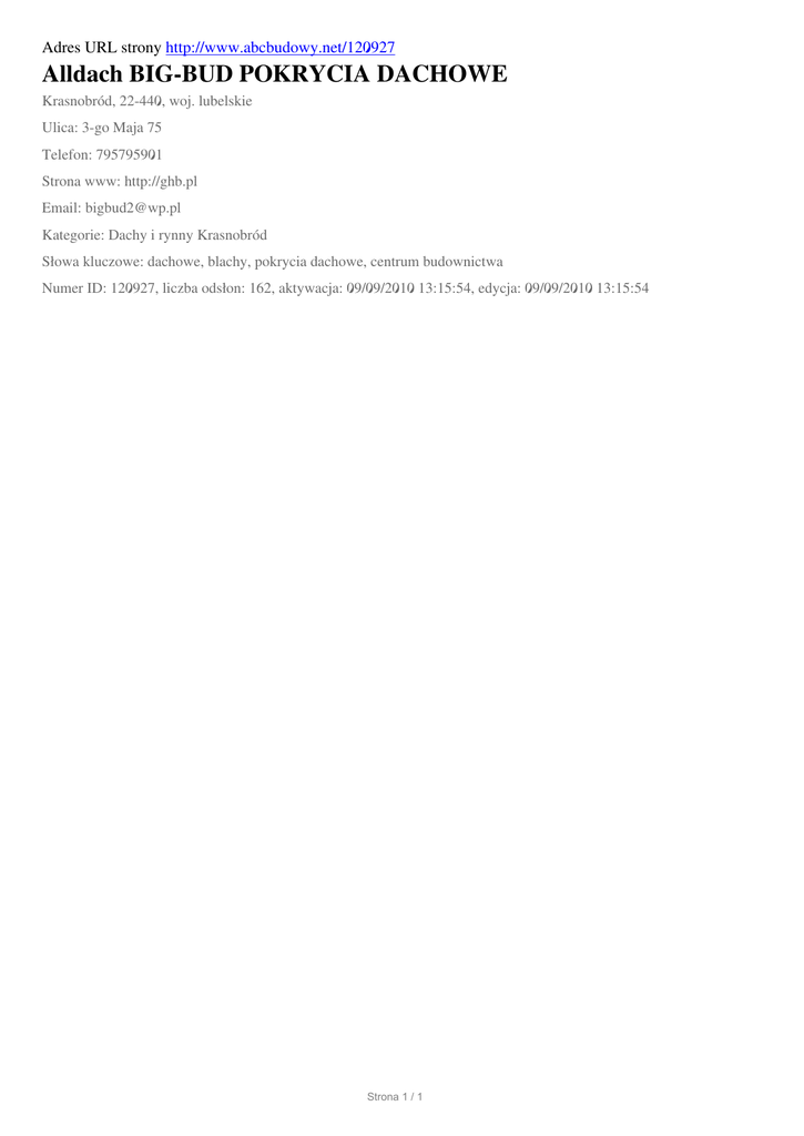 Adres URL strony http://www.abcbudowy.net/120927 Alldach BIG-BUD POKRYCIA DACHOWE Krasnobród, 22-440, woj. lubelskie Ulica: 3-go Maja 75 Telefon: 795795901 Strona www: http://ghb.pl Email: [email protected] Kategorie: Dachy i rynny Krasnobród Słowa kluczowe: dachowe, blachy, pokrycia dachowe, centrum budownictwa Numer ID: 120927, liczba odsłon: 162, aktywacja: 09/09/2010 13:15:54, edycja: 09/09/2010 13:15:54 Strona 1 / 1
