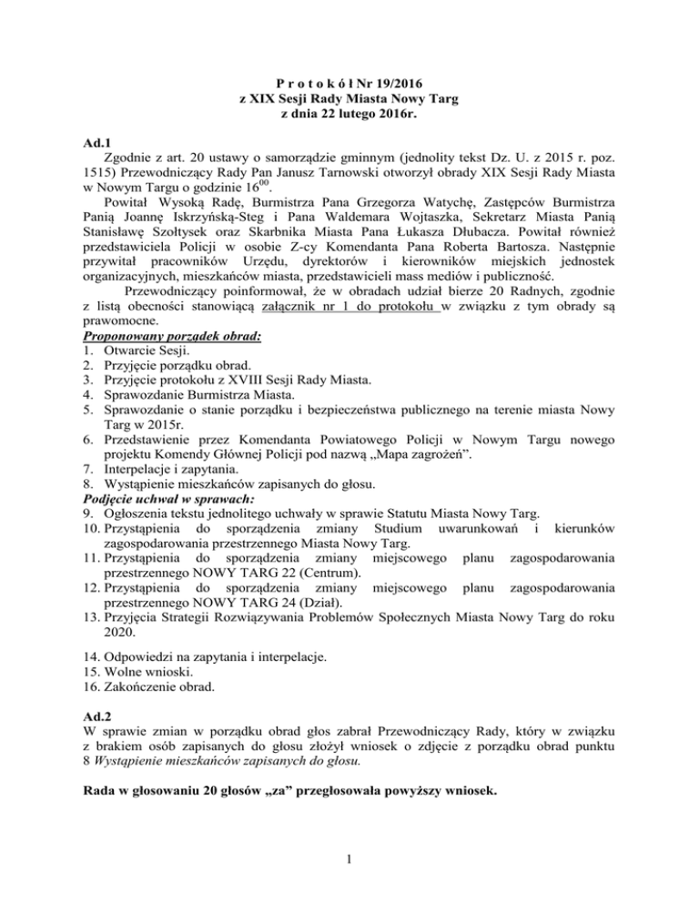 P r o t o k ó ł Nr 19/2016 z XIX Sesji Rady Miasta Nowy Targ z dnia 22 lutego 2016r. Ad.1 Zgodnie z art. 20 ustawy o samorządzie gminnym (jednolity tekst Dz. U. z 2015 r. poz. 1515) Przewodniczący Rady Pan Janusz Tarnowski otworzył obrady XIX Sesji Rady Miasta w Nowym Targu o godzinie 1600. Powitał Wysoką Radę, Burmistrza Pana Grzegorza Watychę, Zastępców Burmistrza Panią Joannę Iskrzyńską-Steg i Pana Waldemara Wojtaszka, Sekretarz Miasta Panią Stanisławę Szołtysek oraz Skarbnika Miasta Pana Łukasza Dłubacza. Powitał również przedstawiciela Policji w osobie Z-cy Komendanta Pana Roberta Bartosza. Następnie przywitał pracowników Urzędu, dyrektorów i kierowników miejskich jednostek organizacyjnych, mieszkańców miasta, przedstawicieli mass mediów i publiczność. Przewodniczący poinformował, że w obradach udział bierze 20 Radnych, zgodnie z listą obecności stanowiącą załącznik nr 1 do protokołu w związku z tym obrady są prawomocne. Proponowany porządek obrad: 1. Otwarcie Sesji. 2. Przyjęcie porządku obrad. 3. Przyjęcie protokołu z XVIII Sesji Rady Miasta. 4. Sprawozdanie Burmistrza Miasta. 5. Sprawozdanie o stanie porządku i bezpieczeństwa publicznego na terenie miasta Nowy Targ w 2015r. 6. Przedstawienie przez Komendanta Powiatowego Policji w Nowym Targu nowego projektu Komendy Głównej Policji pod nazwą „Mapa zagrożeń”. 7. Interpelacje i zapytania. 8. Wystąpienie mieszkańców zapisanych do głosu. Podjęcie uchwał w sprawach: 9. Ogłoszenia tekstu jednolitego uchwały w sprawie Statutu Miasta Nowy Targ. 10. Przystąpienia do sporządzenia zmiany Studium uwarunkowań i kierunków zagospodarowania przestrzennego Miasta Nowy Targ. 11. Przystąpienia do sporządzenia zmiany miejscowego planu zagospodarowania przestrzennego NOWY TARG 22 (Centrum). 12. Przystąpienia do sporządzenia zmiany miejscowego planu zagospodarowania przestrzennego NOWY TARG 24 (Dział). 13. Przyjęcia Strategii Rozwiązywania Problemów Społecznych Miasta Nowy Targ do roku 2020. 14. Odpowiedzi na zapytania i interpelacje. 15. Wolne wnioski. 16. Zakończenie obrad. Ad.2 W sprawie zmian w porządku obrad głos zabrał Przewodniczący Rady, który w związku z brakiem osób zapisanych do głosu złożył wniosek o zdjęcie z porządku obrad punktu 8 Wystąpienie mieszkańców zapisanych do głosu. Rada w głosowaniu 20 głosów „za” przegłosowała powyższy wniosek. 1 Porządek obrad po przegłosowanej zmianie: 1. Otwarcie Sesji. 2. Przyjęcie porządku obrad. 3. Przyjęcie protokołu z XVIII Sesji Rady Miasta. 4. Sprawozdanie Burmistrza Miasta. 5. Sprawozdanie o stanie porządku i bezpieczeństwa publicznego na terenie miasta Nowy Targ w 2015r. 6. Przedstawienie przez Komendanta Powiatowego Policji w Nowym Targu nowego projektu Komendy Głównej Policji pod nazwą „Mapa zagrożeń”. 7. Interpelacje i zapytania. Podjęcie uchwał w sprawach: 8. Ogłoszenia tekstu jednolitego uchwały w sprawie Statutu Miasta Nowy Targ. 9. Przystąpienia do sporządzenia zmiany Studium uwarunkowań i kierunków zagospodarowania przestrzennego Miasta Nowy Targ. 10. Przystąpienia do sporządzenia zmiany miejscowego planu zagospodarowania przestrzennego NOWY TARG 22 (Centrum). 11. Przystąpienia do sporządzenia zmiany miejscowego planu zagospodarowania przestrzennego NOWY TARG 24 (Dział). 12. Przyjęcia Strategii Rozwiązywania Problemów Społecznych Miasta Nowy Targ do roku 2020. 13. Odpowiedzi na zapytania i interpelacje. 14. Wolne wnioski. 15. Zakończenie obrad. Rada w głosowaniu 20 głosów „za” przegłosowała powyższy porządek obrad z uwzględnioną zmianą. Ad.3 Rada w głosowaniu 20 głosów „za” przyjęła protokół z XVIII Sesji Rady Miasta. Ad.4 Sprawozdanie z działalności Burmistrza za okres od 26 stycznia 2016 r. do 22 lutego 2016r. w brzmieniu jak w załączniku nr 2 do protokołu przedłożył Burmistrz Pan Grzegorz Watycha. W ramach pytań głos zabrali: Radny Lesław Mikołajski odnośnie planów zmiany systemu ogrzewania prawie połowy miasta i odnośnie wspomnianej w sprawozdaniu geotermii przypomniał, że w październiku 2015r. Rada Miasta uchwaliła plan ciepłowniczy, który dyskutowany był dwa razy na posiedzeniach Komisji Komunalnej. Wówczas uzyskano obszerne informacje o stanie technicznym i ekonomicznym MPEC-u i Komisja wtedy przyjęła konkluzję, że skoro MPEC posiada jeszcze na 10 lat certyfikaty na użytkowanie tej kotłowni i wszystkie wymogi i parametry ekologiczne są spełnione to temat geotermii zostaje odłożony na długo. Dlatego pyta co się teraz stało, że dokonuje się takiego nagłego zwrotu i bez debaty i konsultacji z radnymi podejmuje się ten temat? Następnie zwrócił uwagę, że skoro przy kapitale założycielskim 9 mln zł MPEC zainwestował w ciągu 10 lat 13 mln zł to nie można mówić o stagnacji lecz o rozwoju tego zakładu. Te zainwestowane pieniądze to przede wszystkim poprawa ekologii. Stwierdził, że z tym tematem wiążą się też zmiany personalne w MPEC-u , dotychczasowy prezes został odwołany ze stanowiska. Burmistrz Pan Grzegorz Watycha mówi, że może dla radnego przyłączenie kliku budynków to dynamiczny rozwój, ale dla niego dynamiczny rozwój to przede 2 wszystkim aktywność polegającą na pozyskiwaniu nowych odbiorców, pozyskiwaniu dotacji na rozwój. MPEC realizuje zadania ze swoich środków i dywidend z tytułu posiadanych akcji w Gaspolu. Dodał, że jego oczekiwania są w tym zakresie inne, a plan rozwoju spółki zakończył się na 2014r. Dodał, że oczekuje, że firma będzie aktywnie włączała się w proces walki z niską emisją w mieście. Sieci ciepłownicze biegną wzdłuż ulic, gdzie są zlokalizowane budynki, w tym zakłady usługowe i pozyskując dotacje można je podłączyć. Inne MPEC-e starają się o dotację. Cena gigadżula oferowana przez MPEC nie jest dużo niższa od ceny oferowanej przez Geotermię Podhalańską. Na konferencji w zesz