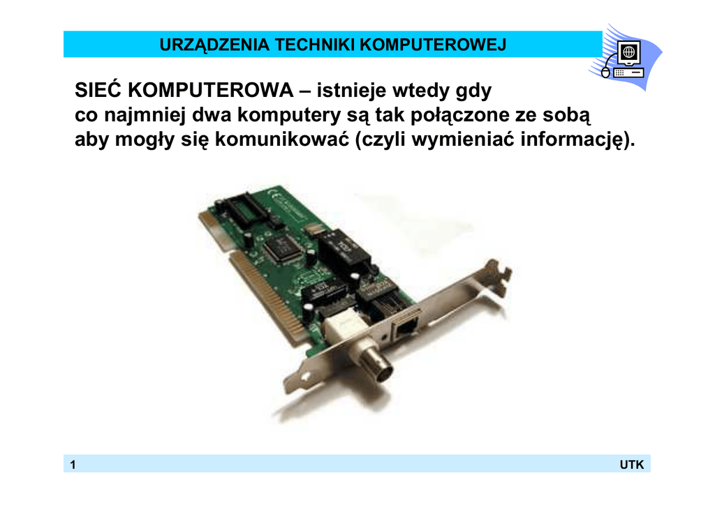 URZĄDZENIA TECHNIKI KOMPUTEROWEJ SIEĆ KOMPUTEROWA – istnieje wtedy gdy co najmniej dwa komputery są tak połączone ze sobą aby mogły się komunikować (czyli wymieniać informację). 1 UTK URZĄDZENIA TECHNIKI KOMPUTEROWEJ 2 UTK URZĄDZENIA TECHNIKI KOMPUTEROWEJ 3 UTK URZĄDZENIA TECHNIKI KOMPUTEROWEJ 4 UTK URZĄDZENIA TECHNIKI KOMPUTEROWEJ 5 UTK URZĄDZENIA TECHNIKI KOMPUTEROWEJ 6 UTK URZĄDZENIA TECHNIKI KOMPUTEROWEJ 7 UTK URZĄDZENIA TECHNIKI KOMPUTEROWEJ 8 UTK URZĄDZENIA TECHNIKI KOMPUTEROWEJ 9 UTK URZĄDZENIA TECHNIKI KOMPUTEROWEJ 10 UTK URZĄDZENIA TECHNIKI KOMPUTEROWEJ 11 UTK URZĄDZENIA TECHNIKI KOMPUTEROWEJ 12 UTK
