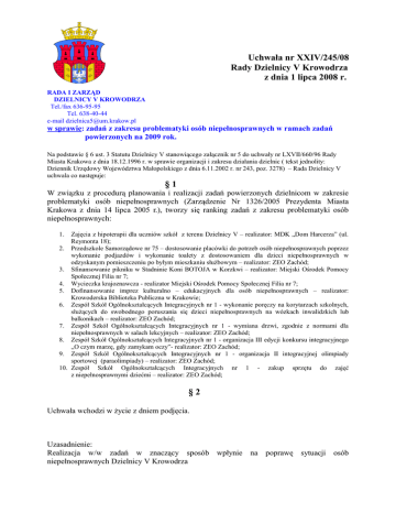 Uchwała nr XXIV/245/08 Rady Dzielnicy V Krowodrza z dnia 1 lipca 2008 r. RADA I ZARZĄD DZIELNICY V KROWODRZA Tel./fax 636-95-95 Tel. 638-40-44 e-mail [email protected] w sprawie: zadań z zakresu problematyki osób niepełnosprawnych w ramach zadań powierzonych na 2009 rok. Na podstawie § 6 ust. 3 Statutu Dzielnicy V stanowiącego załącznik nr 5 do uchwały nr LXVII/660/96 Rady Miasta Krakowa z dnia 18.12.1996 r. w sprawie organizacji i zakresu działania dzielnic ( tekst jednolity: Dziennik Urzędowy Województwa Małopolskiego z dnia 6.11.2002 r. nr 243, poz. 3278) – Rada Dzielnicy V uchwala co następuje: §1 W związku z procedurą planowania i realizacji zadań powierzonych dzielnicom w zakresie problematyki osób niepełnosprawnych (Zarządzenie Nr 1326/2005 Prezydenta Miasta Krakowa z dnia 14 lipca 2005 r.), tworzy się ranking zadań z zakresu problematyki osób niepełnosprawnych: 1. Zajęcia z hipoterapii dla uczniów szkół z terenu Dzielnicy V – realizator: MDK „Dom Harcerza” (ul. Reymonta 18); 2. Przedszkole Samorządowe nr 75 – dostosowanie placówki do potrzeb osób niepełnosprawnych poprzez wykonanie podjazdów i wykonanie toalety z dostosowaniem dla dzieci niepełnosprawnych w odzyskanym pomieszczeniu po byłym mieszkaniu służbowym – realizator: ZEO Zachód; 3. Sfinansowanie pikniku w Stadninie Koni BOTOJA w Korzkwi – realizator: Miejski Ośrodek Pomocy Społecznej Filia nr 7; 4. Wycieczka krajoznawcza - realizator Miejski Ośrodek Pomocy Społecznej Filia nr 7; 5. Dofinansowanie imprez kulturalno – edukacyjnych dla osób niepełnosprawnych – realizator: Krowoderska Biblioteka Publiczna w Krakowie; 6. Zespół Szkół Ogólnokształcących Integracyjnych nr 1 - wykonanie poręczy na korytarzach szkolnych, służących do swobodnego poruszania się dzieci niepełnosprawnych na wózkach inwalidzkich lub balkonikach – realizator: ZEO Zachód; 7. Zespół Szkół Ogólnokształcących Integracyjnych nr 1 - wymiana drzwi, zgodnie z normami dla niepełnosprawnych w salach lekcyjnych – realizator: ZEO Zachód; 8. Zespół Szkół Ogólnokształcących Integracyjnych nr 1 - organizacja III edycji konkursu integracyjnego „O czym marzę, gdy zamykam oczy”- realizator: ZEO Zachód; 9. Zespół Szkół Ogólnokształcących Integracyjnych nr 1 - organizacja II integracyjnej olimpiady sportowej (paraolimpiady) – realizator: ZEO Zachód; 10. Zespół Szkół Ogólnokształcących Integracyjnych nr 1 - zakup sprzętu do zajęć z niepełnosprawnymi dziećmi – realizator: ZEO Zachód; §2 Uchwała wchodzi w życie z dniem podjęcia. Uzasadnienie: Realizacja w/w zadań w znaczący sposób wpłynie na poprawę sytuacji osób niepełnosprawnych Dzielnicy V Krowodrza Uchwała nr XXIV/245/08 Rady Dzielnicy V Krowodrza z dnia 1 lipca 2008 r. RADA I ZARZĄD DZIELNICY V KROWODRZA Tel./fax 636-95-95 Tel. 638-40-44 e-mail [email protected] w sprawie: zadań z zakresu problematyki osób niepełnosprawnych w ramach zadań powierzonych na 2009 rok.