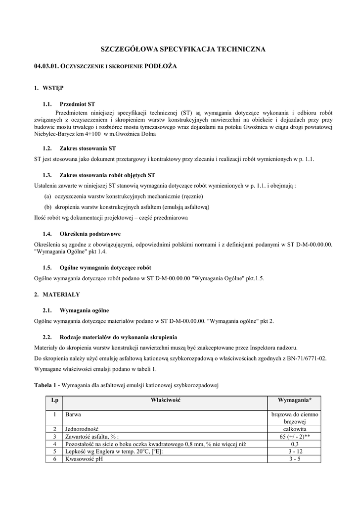 SZCZEGÓŁOWA SPECYFIKACJA TECHNICZNA 04.03.01. OCZYSZCZENIE I SKROPIENIE PODŁOśA 1. WSTĘP 1.1. Przedmiot ST Przedmiotem niniejszej specyfikacji technicznej (ST) są wymagania dotyczące wykonania i odbioru robót związanych z oczyszczeniem i skropieniem warstw konstrukcyjnych nawierzchni na obiekcie i dojazdach przy przy budowie mostu trwałego i rozbiórce mostu tymczasowego wraz dojazdami na potoku Gwoźnica w ciągu drogi powiatowej Niebylec-Barycz km 4+100 w m.Gwoźnica Dolna 1.2. Zakres stosowania ST ST jest stosowana jako dokument przetargowy i kontraktowy przy zlecaniu i realizacji robót wymienionych w p. 1.1. 1.3. Zakres stosowania robót objętych ST Ustalenia zawarte w niniejszej ST stanowią wymagania dotyczące robót wymienionych w p. 1.1. i obejmują : (a) oczyszczenia warstw konstrukcyjnych mechanicznie (ręcznie) (b) skropienia warstw konstrukcyjnych asfaltem (emulsją asfaltową) Ilość robót wg dokumentacji projektowej – część przedmiarowa 1.4. Określenia podstawowe Określenia są zgodne z obowiązującymi, odpowiednimi polskimi normami i z definicjami podanymi w ST D-M-00.00.00. "Wymagania Ogólne" pkt 1.4. 1.5. Ogólne wymagania dotyczące robót Ogólne wymagania dotyczące robót podano w ST D-M-00.00.00 "Wymagania Ogólne" pkt.1.5. 2. MATERIAŁY 2.1. Wymagania ogólne Ogólne wymagania dotyczące materiałów podano w ST D-M-00.00.00. "Wymagania ogólne" pkt 2. 2.2. Rodzaje materiałów do wykonania skropienia Materiały do skropienia warstw konstrukcji nawierzchni muszą być zaakceptowane przez Inspektora nadzoru. Do skropienia naleŜy uŜyć emulsję asfaltową kationową szybkorozpadową o właściwościach zgodnych z BN-71/6771-02. Wymagane właściwości emulsji podano w tabeli 1. Tabela 1 - Wymagania dla asfaltowej emulsji kationowej szybkorozpadowej Lp Właściwość 1 Barwa 2 3 4 5 6 Jednorodność Zawartość asfaltu, % : Pozostałość na sicie o boku oczka kwadratowego 0,8 mm, % nie więcej niŜ Lepkość wg Englera w temp. 20oC, [oE]: Kwasowość pH Wymagania* brązowa do ciemno brązowej całkowita 65 (+/ - 2)** 0,3 3 - 12 3-5 Lp Właściwość 7 8 9 10 11 12 Wymagania* Czas rozpadu, min. poniŜej Przyczepność do kruszywa asfaltu wydzielonego z emulsji, % nie mniej niŜ Trwałość emulsji, miesiące, nie mniej niŜ Odporność na wstrząsy, godz, nie więcej niŜ Odporność na niskie temp. pozostałość na sicie 0,6mm, %, nie więcej niŜ : Rozcieńczalność wodą, dodatek wody nie powodujący rozpadu, % objętościowo 5 70 3 3 0,1 100 * Badania wg. normy BN-71/6771-02 ** Dopuszcza się inne zawartości asfaltu w emulsji po zaakceptowaniu przez Inspektora nadzoru. Orientacyjne zuŜycie emulsji do skropienia warstw konstrukcyjnych nawierzchni wynosi 0,3 – 0,6 kg/m2. Dokładne zuŜycie lepiszczy powinno być ustalone w zaleŜności od rodzaju warstwy i stanu jej powierzchni i zaakceptowane przez Inspektora nadzoru. 2.3. Składowanie lepiszczy Warunki przechowywania nie mogą powodować utraty cech lepiszcza i obniŜenia jego jakości. Lepiszcze naleŜy przechowywać w zbiornikach stalowych wyposaŜonych w urządzenia grzewcze i zabezpieczonych przed dostępem wody i zanieczyszczeniem. Dopuszcza się magazynowanie lepiszczy w zbiornikach murowanych, betonowych lub Ŝelbetowych przy spełnieniu tych samych warunków, jakie podano dla zbiorników stalowych. Przy przechowywaniu emulsji asfaltowej naleŜy zachować następujące warunki: • czas składowania emulsji nie powinien przekraczać 3 miesięcy od daty jej produkcji • temperatura przechowywania emulsji nie powinna być niŜsza niŜ 3o C 3. SPRZĘT 3.1. Wymagania ogólne Ogólne wymagania dotyczące sprzętu podano w ST D-M-00.00.00. "Wymagania ogólne" pkt 3. 3.2. Sprzęt do oczyszczania warstw nawierzchni Do oczyszczania warstw nawierzchni naleŜy uŜywać szczotki mechaniczne. Zaleca się uŜycie urządzeń dwuszczotkowych. Pierwsza ze szczotek powinna być wykonana z twardych elementów czyszczących i słuŜyć do zdrapywania oraz usuwania zanieczyszczeń przylegających do czyszczonej warstwy, Druga szczotka powinna posiadać miękkie elementy czyszczące i słuŜyć do zamiatania. Zaleca się uŜywanie szczotek wyposaŜonych w urządzenia odpylające. Ponadto zastosowanie mają : • spręŜarki • zbiorniki z wodą • szczotki ręczne 3.3. Sprzęt do skrapiania warstw nawierzchni Do skrapiania warstw nawierzchni naleŜy uŜywać skrapiarkę lepiszcza. Skrapiarka powinna być wyposaŜona w urządzenia pomiarowo - kontrolne pozwalające na sprawdzenie i regulowanie następujących parametrów: • • • • • • Zbiornik na lepiszcza. temperatury rozkładanego lepiszcza, ciśnienia lepiszcza w kolektorze, obrotów pompy dozującej lepiszcze, prędkości poruszania się skrapiarki, wysokości i długości kolektora do rozkładania lepiszcza, ilości lepiszcza. lepiszcze skrapiarki powinien być izolowany termicznie, tak aby było moŜliwe zachowanie stałej temperatury Wykonawca powinien posiadać aktualne świadectwo cechowania skrapiarki zawierające zaleŜności pomiędzy wydatkiem lepiszcza a następującymi parametrami: • ciśnieniem lepiszcza, • obrotami pompy, • prędkością jazdy skrapiarki, • temperaturą lepiszcza. Skrapiarka powinna zapewnić rozkładanie lepiszcza z tolerancją +/-10% od ilości załoŜonej. 4. TRANSPORT 4.1. Wymagania ogólne Ogólne wymagania dotyczące transportu podano w ST D-M-00.00.00. "Wymagania ogólne" pkt 4. 4.2. Transport lepiszcza Transport lepiszczy powinien odbywać się zgodnie z warunkami zawartymi w PZJ i powinien odpowiadać wymaganiom norm i przepisów dotyczących poszczególnych rodzajów lepiszczy. Transport emulsji powinien odbywać się w cysternach samochodowych. Dopuszcza się stosowanie beczek lub innych pojemników stalowych. Cysterny przeznaczone do przewozu emulsji powinny być przedzielone przegrodami, dzielącymi je na komory o pojemności nie większej niŜ 1 m3, a kaŜda przegroda powinna mie