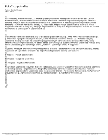 Zespół Szkół Nr 1 w Krośniewicach Poka? co potrafisz Autor: Dorota Klarzak 28.03.2014. W s?oneczny, wiosenny dzie?, 21 marca (piątek) uczniowie naszej szko?y udali si? do sali OSP w Krośniewicach, ?eby uczestniczy? w Szkolnym Konkursie Talentów zorganizowanym przez świetlic? szkolną. O tytu? najwi?kszego talentu walczy?o 6 uczestników w nast?pujących kategoriach: pokaz taneczny - Krystian Markowski z klasy Ic, iluzjonista, magik-Patryk Szadkowski z klasy I b, wokal Angelika Cieśli?ska z klasy IIc, Patrycja Palpuchowska z klasy IIb, Angelika Filipiak z klasy I b i Joanna Paw?owska z Gimnazjum w Dąbrowicach. Uczestników konkursu ocenia?o jury w sk?adzie: przewodnicząca p. Anna Kmie? nauczycielka biologii, p.Waldemar Hyzopski nauczyciel muzyki, Anna Pokorska uczennica klasy I LO. Ponadto wszyscy uczniowie mogli g?osowa? na specjalnie przygotowanych karteczkach na swojego faworyta, który otrzyma? nagrod? publiczności. W czasie obrad jury wystąpi?a Zuzanna O?arek. Uczennica rozwija swój talent ucz?szczając do szkolnego chóru ,,Koliber" i gminnego chóru A`cappella". Wyst?py m?odych artystów by?y profesjonalne, ciekawe i dostarczy?y wiele emocji m?odzie?y, którzy nagrodzili ich gromkimi brawami. Za najwi?ksze tegoroczne talenty jury uzna?o: I miejsce - Patryk Szadkowski, II miejsce - Angelika Cieśli?ska, III miejsce - Krystian Markowski. Nagrodzeni uczniowie otrzymali dyplomy i statuetki, zaś wszyscy uczestnicy konkursu s?odkie upominki od Dyrekcji szko?y i organizatorów. Nagrod? publiczności otrzyma?a Joanna Paw?owska. Konkurs znakomicie poprowadzi?y uczennice klasy IIa Zuzanna O?arek i Ma?gorzata Janiszewska. Ca?ą imprez? przygotowali: p. Agnieszka Kolasi?ska, p. Dorota Klarzak i p. Waldemar Hyzopski. http://www.gimkace.info Kreator PDF Utworzono 8-03-2017, 19:43