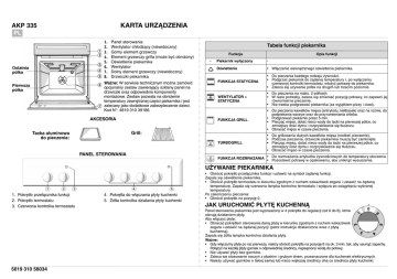 KARTA URZ¥DZENIA AKP 335 PL 1. Panel sterowania 2. Wentylator ch³odz¹cy (niewidoczny) 3. Górny element grzewczy 4. Element grzewczy grilla (mo¿e byæ obni¿ony) 5. Owietlenie piekarnika 6. Wentylator 7. Dolny element grzewczy (niewidoczny) 8. Drzwiczki piekarnika Wa¿ne: W serwisie technicznym mo¿na zamówiæ opcjonalny zestaw zawieraj¹cy szklany panel na drzwiczki oraz odpowiednie komponenty monta¿owe. Zestaw pozwala na obni¿enie temperatury zewnêtrznej czêci piekarnika i jest zalecany jako dodatkowe zabezpieczenie dzieci. Kod N°: 4819 310 39186. Ostatnia pó³ka Pierwsza pó³ka AKCESORIA Tabela funkcji piekarnika Funkcja - Piekarnik wy³¹czony - Owietlenie W³¹czenie wewnêtrznego owietlenia piekarnika. FUNKCJA STATYCZNA Do pieczenia ka¿dego rodzaju ¿ywnoci. Podgrzaæ piekarnik do ¿¹danej temperatury i, po wy³¹czeniu czerwonej kontrolki termostatu, w³o¿yæ potrawê do piekarnika. Zaleca siê u¿ywanie pó³ek na drugim lub trzecim poziomie. WENTYLATOR + STATYCZNA Do pieczenia na maks. 2 pó³kach. W razie potrzeby, zaleca siê zmieniaæ pozycjê potrawy, co zapewni jej równomierne pieczenie. Nie trzeba podgrzewaæ piekarnika (za wyj¹tkiem pizzy i ciast). FUNKCJA GRILL Do pieczenia kawa³ków miêsa (antrykotu, kie³basek) oraz na ro¿nie, do podpiekania warzyw oraz do przyrumieniania chleba. Podgrzewaæ piekarnik przez 5 min. Piecz¹c miêso, dolaæ nieco wody do tacki na pierwszej pó³ce, co zmniejszy iloæ dymu i rozpryskiwanie siê t³uszczu. Obracaæ miêso w czasie pieczenia. TURBOGRILL Do grillowania du¿ych kawa³ków miêsa (rostbef, pieczenie). Podczas pieczenia, drzwiczki piekarnika musz¹ byæ zamkniête. Piecz¹c miêso, dolaæ nieco wody do tacki na pierwszej pó³ce, co zmniejszy iloæ dymu i rozpryskiwanie siê t³uszczu. Obracaæ miêso w czasie pieczenia. Grill: Tacka aluminowa do pieczenia: PANEL STEROWANIA Opis funkcji FUNKCJA ROZMRA¯ANIA Do rozmra¿ania artyku³ów ¿ywnociowych do temperatury otoczenia. Pozostawiæ potrawê w opakowaniu, aby unikn¹æ wysuszenia. U¯YWANIE PIEKARNIKA 1. Pokrêt³o prze³¹cznika funkcji 2. Pokrêt³o termostatu 3. Czerwona kontrolka termostatu 5019 310 56034 4. Pokrêt³a do w³¹czania p³yty kuchenki 5. ¯ó³ta kontrolka dzia³ania p³yty kuchenki Obróciæ pokrêt³o prze³¹cznika funkcji i ustawiæ na symbol ¿¹danej funkcji. Zapala siê owietlenie piekarnika. Obróciæ pokrêt³o termostatu w kierunku zgodnym z ruchem wskazówek zegara i ustawiæ na ¿¹dan¹ temperaturê. Zapala siê czerwona lampka kontrolna termostatu i wy³¹cza po osi¹gniêciu wybranej temperatury. Po zakoñczeniu pieczenia: Obróciæ pokrêt³o na pozycjê 0. JAK URUCHOMIÆ P£YTÊ KUCHENN¥ Panel sterowania piekarnika jest wyposa¿ony w 4 pokrêt³a do regulacji (od 0 do 6), które steruj¹ dzia³aniem p³yty. Aby w³¹czyæ p³ytê: Obracaæ pokrêt³em sterowania dan¹ p³yt¹ w kierunku zgodnym z ruchem wskazówek zegara i ustawiæ na ¿¹danej pozycji (patrz instrukcje dostarczone wraz z p³yt¹ kuchenn¹). Zapala siê ¿ó³ta lampka kontrolna dzia³ania p³yty. Wa¿ne: Gdy w³¹czymy p³ytê po raz pierwszy, nale¿y obróciæ pokrêt³a na pozycjê 6 na ok. 3 min. tak, aby usun¹æ zapachy. Po³¹¿yæ na ka¿dej p³yty garnek o odpowiedniej rednicy, nape¹niony wod¹ do po³owy. Nie u¿ywaæ p³yty bez garnków. Zaleca siê stosowanie naczyñ z p³askim i grubym dnem, przeznaczone dla kuchenek elektrycznych. Nale¿y u¿ywaæ garnków o takiej samej lub nieco wiêkszej rednicy dna co rednica p³yty kuchenki. TABELE PIECZENIA POTRAWY MIÊSO Jagniê, kolê, baranina Funkcja Indyk (3-5 kg) Gê (2 kg) Pó³ka od do³u Temperatura (°C) Czas pieczenia (min) S³one ciasta, ciasta z nadzieniem owocowym, np. ananasem, brzoskwini¹ X 2 200 50 - 60 X 2 190 45 - 55 Lasagne, zapiekanka z ziemniaków, cannelloni, zapiekanki w ciecie X 2 200 40 - 50 X 2 190 40 - 50 X 2 210 30 - 40 X 2 210 30 - 40 X 2 225 15 - 20 X 2 210 20 - 30 X 2 210 20 - 30 X 2 200 30 - 40 X 2 200 40 - 50 X 2 190 50 - 60 Podgrzewanie Pó³ka od do³u Temperatura (°C) Czas pieczenia (min) Pó³ka od do³u Temperatura (°C) Czas pieczenia min POTRAWY X 2 200 90 - 110 X 2 200 100 - 110 X 2 200 90 - 110 Cielêcina, wo³owina, wieprzowina Kurczak, królik, kaczka Podgrzewanie Podgrzewanie X 2 200 90 - 110 X 2 200 70 - 80 X 2 200 70 - 80 X 2 210 160 - 180 X 2 200 170 - 180 X 2 210 100 - 130 X 2 200 100 - 130 Funkcja Chleb Pizza Vol-au-vent Suflet RYBY (1 kg) Dorada, labraks, tuñczyk, ³oso, dorsz X 2 200 60 - 80 X 2 190 60 - 80 RYBY X 2 190 50 - 60 (<1 kg - w kawa³kach) siod³ak, tuñczyk X 2 190 50 - 60 Tosty X 3-4 200-225 10 - 15 WARZYWA X 2 190 50 - 60 Antrykot X 3-4 200-225 30 - 40 X 2 190 50 - 60 Kotlety X 3-4 200-225 30 - 40 X 2 180 40 - 50 Kie³baski X 3 200-225 30 - 40 X 2 180 40 - 50 Kotlety pieczone na ¿arze X 3 200-225 30 - 40 Ryby (w kawa³kach) X 3 200-225 30 - 40 Udka kurczaka X 3 200-225 40 - 50 Ro¿en X 3 200-225 40 - 50 Papryka, pomidory, pieczone ziemniaki S£ODYCZE, CIASTA, ITP. Ciasta dro¿d¿owe Ciasta z nadzieniem serowym POTRAWY Funkcja X 2 190 60 - 90 - 2 180 60 - 90 X 2 190 40 - 50 ¯eberka X 3 200-225 40 - 50 X 2 180 40 - 50 1/2 kurczaka X 3 200-225 40 - 50 1/2 kurczaka - 3 200-225 40 - 50 Kurczak w ca³oci - 2-3 200-225 60 - 70 Pieczeñ wieprzowa, wo³owa - 2-3 200-225 60 - 80 Kaczka - 1-2 200-225 60 - 80 Udziec jagniêcy - 1-2 200-225 80 - 100 Rostbef - 2 200-225 60 - 70 Pieczone ziemniaki - 2-3 200-225 40 - 50 Ryby, np. dorada, pstr¹g - 3 190-200 40 - 50 Tarta X 2 200 50 - 60 X 2 190 50 - 60 X 2 180 20 - 30 X 2 180 30 - 40 X 2 180 35 - 45 X 2 180 35 - 45 Strudel, naleniki Biszkopty, obwarzanki, kruche ciasto TABELE GRILLOWANIA Beza, ciasteczka Uwaga: Wskazane czasy i temperatury pieczenia podane s¹ jedynie informacyjnie.