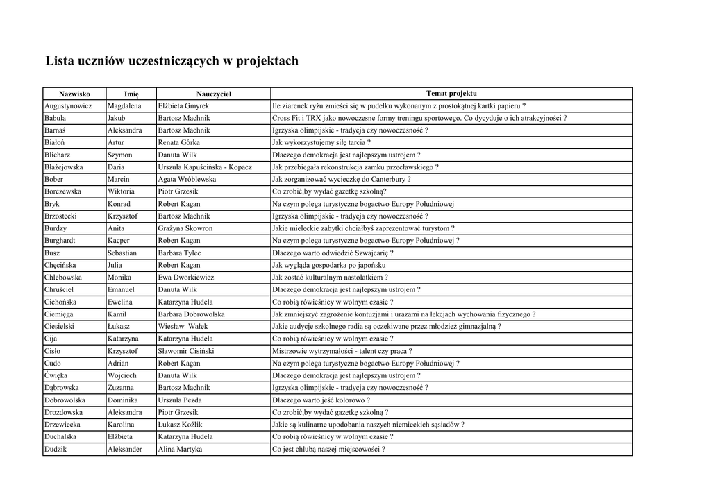 Lista uczniów uczestniczących w projektach Imię Nazwisko Temat projektu Nauczyciel Augustynowicz Magdalena Elżbieta Gmyrek Ile ziarenek ryżu zmieści się w pudełku wykonanym z prostokątnej kartki papieru ? Babula Jakub Bartosz Machnik Cross Fit i TRX jako nowoczesne formy treningu sportowego. Co dycyduje o ich atrakcyjności ? Barnaś Aleksandra Bartosz Machnik Igrzyska olimpijskie - tradycja czy nowoczesność ? Białoń Artur Renata Górka Jak wykorzystujemy siłę tarcia ? Blicharz Szymon Danuta Wilk Dlaczego demokracja jest najlepszym ustrojem ? Błażejowska Daria Urszula Kapuścińska - Kopacz Jak przebiegała rekonstrukcja zamku przecławskiego ? Bober Marcin Agata Wróblewska Jak zorganizować wycieczkę do Canterbury ? Borczewska Wiktoria Piotr Grzesik Co zrobić,by wydać gazetkę szkolną? Bryk Konrad Robert Kagan Na czym polega turystyczne bogactwo Europy Południowej Brzostecki Krzysztof Bartosz Machnik Igrzyska olimpijskie - tradycja czy nowoczesność ? Burdzy Anita Grażyna Skowron Jakie mieleckie zabytki chciałbyś zaprezentować turystom ? Burghardt Kacper Robert Kagan Na czym polega turystyczne bogactwo Europy Południowej ? Busz Sebastian Barbara Tylec Dlaczego warto odwiedzić Szwajcarię ? Chęcińska Julia Robert Kagan Jak wygląda gospodarka po japońsku Chlebowska Monika Ewa Dworkiewicz Jak zostać kulturalnym nastolatkiem ? Chruściel Emanuel Danuta Wilk Dlaczego demokracja jest najlepszym ustrojem ? Cichońska Ewelina Katarzyna Hudela Co robią rówieśnicy w wolnym czasie ? Ciemięga Kamil Barbara Dobrowolska Jak zmniejszyć zagrożenie kontuzjami i urazami na lekcjach wychowania fizycznego ? Ciesielski Łukasz Wiesław Wałek Jakie audycje szkolnego radia są oczekiwane przez młodzież gimnazjalną ? Cija Katarzyna Katarzyna Hudela Co robią rówieśnicy w wolnym czasie ? Cisło Krzysztof Sławomir Cisiński Mistrzowie wytrzymałości - talent czy praca ? Cudo Adrian Robert Kagan Na czym polega turystyczne bogactwo Europy Południowej ? Ćwięka Wojciech Danuta Wilk Dlaczego demokracja jest najlepszym ustrojem ? Dąbrowska Zuzanna Bartosz Machnik Igrzyska olimpijskie - tradycja czy nowoczesność ? Dobrowolska Dominika Urszula Pezda Dlaczego warto jeść kolorowo ? Drozdowska Aleksandra Piotr Grzesik Co zrobić,by wydać gazetkę szkolną ? Drzewiecka Karolina Łukasz Koźlik Jakie są kulinarne upodobania naszych niemieckich sąsiadów ? Duchalska Elżbieta Katarzyna Hudela Co robią rówieśnicy w wolnym czasie ? Dudzik Aleksander Alina Martyka Co jest chlubą naszej miejscowości ? Duszkiewicz Aneta Stanisława Chmielowiec Które wynalazki najbardziej zmieniły świat ? Dworkiewicz Julia Ewa Dworkiewicz Jak przygotować przedstawienie edukacyjne ? Dziekan Aleksandra Ewa Dworkiewicz Jak przygotować przedstawienie edukacyjne ? Filipecka Żaneta Elżbieta Kasza Jakie kwasy i zasady są w moim domu ? Florek Natalia Ewa Dworkiewicz Jak zostać kulturalnym nastolatkiem ? Gadziała Maria Urszula Pezda Dlaczego warto jeść kolorowo ? Gaj Mateusz Łukasz Koźlik Jakie dyscypliny sportowe preferują Niemcy ? Gajek Natalia Barbara Tylec Dlaczego warto odwiedzić Szwajcarię ? Gawron Kinga Alina Martyka Kto patronuje ulicom naszego miasta ? Gibała David Agata Wróblewska Jak zorganizować wycieczkę do Canterbury ? Głaz Kamil Małgorzata Oleksiak Projekt edukacyjny Anglia - Szkocja Godek Alicja Łukasz Koźlik Jakie są kulinarne upodobania naszych niemieckich sąsiadów ? Graniczka Klaudia Alicja Stachura - Malczyńska Jakie są ulubione dyscypliny sportowe Brytyjczyków i Amerykanów ? Grębosz Adrianna Ewa Dworkiewicz Jak przygotować przedstawienie edukacyjne ? Grudziński Olgierd Bartosz Machnik CrossFit i TRX jako nowoczesne formy treningu sportowego. Co decyduje o ich atrakcyjności ? Hajnycz Michał Stanisława Chmielowiec Jakie wynalazki najbardziej zmieniły świat ? Hamala Adrianna Wiesław Wałek Które style muzyki współczesnej są ulubione przez młodzież i dlaczego ? Hardysz Kamila Elżbieta Kasza Jakie kwasy i zasady są w moim domu ? Herba Dominik Agata Wróblewska Jak zorganizować wycieczkę do Canterbury ? Hyjek Maciej Bartosz Machnik CrossFit i TRX jako nowoczesne formy treningu sportowego. Co decyduje o ich atrakcyjności ? Indyk Jan Grażyna Skowron Jakie mieleckie zabytki chciałbyś zaprezentować turystom ? Jabłoński Mateusz Stanisława Chmielowiec W jaki sposób styl życia wpływa na nasze zdrowie ? Jabrzyk Izabella Ewa Dworkiewicz Jak zostać kulturalnym nastolatkiem ? Jackowska Olga Piotr Grzesik Co zrobić,by wydać gazetkę szkolną ? Janeczko Jakub Alina Pieróg Które zjawiska fizyczne występują w sporcie ? Jarosz Bartłomiej Bartosz Machnik Cross Fit i TRX jako nowoczesne formy treningu sportowego. Co dycyduje o ich atrakcyjności ? Jeż Paulina Urszula Pezda Czy warto jeść kolorowo ? Juszczak Natalia Ewelina Betleja Czym różni się niemiecki system szkolnictwa od polskiego ? Kaczmarczyk Michał Bartosz Machnik Igrzyska olimpijskie - tradycja czy nowoczesność ? Kaczmarek Jakub Barbara Dobrowolska Jak zmniejszyć zagrożenie kontuzjami i urazami na lekcjach wychowania fizycznego ? Kafel Przemysław Alina Pieróg Które zjawiska fizyczne występują w sporcie ? Kania Maciej Danuta Wilk Dlaczego demokracja jest najlepszym ustrojem ? Kapinos Olgierd Barbara Dobrowolska Jak zmniejszyć zagrożenie kontuzjami i urazami na lekcjach wychowania fizycznego ? Kapusta Aleksandra Anna Kuczewska Jakie zawody będą poszukiwane na rynku pracy ? Karkosza Roksana Piotr Krempa Dieta bezpieczna czy groźna ? Kierys Milena Barbara Dobrowolska W jaki sposób media rozbudzają w nas potrzebę uczestniczenia w aktywności fizycznej ? Kisiel Michał Agata Wróblewska Jak zorganizować wycieczkę do Canterbury ? Koba Karolina Marzena Czubecka W jakim stopniu adaptacje filmowe mogą zastąpić literaturę ? Kokoszka Mariusz Stanisława Chmielowiec Jakie wynalazki najbardziej zmieniły świat ? Komoński Kamil Elżbieta Czaja Dlaczeg