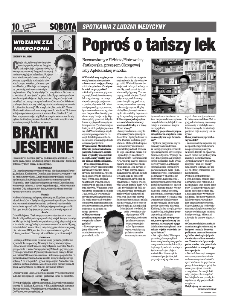 10 28 listopada 2009 r. SOBOTA SPOTKANIA Z LUDŹMI MEDYCYNY www.naszemiasto.pl WIDZIANE ZZA MIKROFONU ZBIGNIEW ZALIŃSKI iągle nic, tylko szybko i szybko, terminy gonią jeden za drugim, a już najlepiej – to jasne – żeby było na przedwczoraj. Przypadkiem spojrzałem onegdaj na kalendarz. Spojrzałem, a tu listopadzik nam się kończy; jeszcze oczywiście andrzejki z obowiązkowym woskiem, ale zaraz potem Barbary, Mikołaja ze skarpetą na prezenty, no i wreszcie święta z sylwestrem. Czy da się zdążyć? – pomyślałem. Dobrze, że chociaż za oknem jesień w pełni i choćby przez to grudniowe obowiązki zdają się ciągle jeszcze odległe. Coś jednak musi być na rzeczy; zaczyna brakować terminów. Właśnie podwoje otwiera nowy hotel, zgrabnie nawiązując w nazwie do „Ziemi obiecanej”. Ma w szyldzie „Borowiecki”. Tolek Studziński niezmordowanie zaprasza do siebie na Złotno na kolejne spotkanie z jazzem, a studenckie „Siódemki” już dzwonią wyznaczając wigilię klubowych weteranów. Ja się pytam: to kiedy szykować choinkę? Na razie lampki oddałem do reperacji. I miałem szczęście. C BRATKI JESIENNE Pan elektryk zlecenie przyjął podkreślając wszakoż: „...i robię to panu, panie Zet, tylko po starej znajomości”. Jakby nie patrzeć, tydzień zaczął się niezgorzej. Poniedziałek Dla teatrów zwyczajowo dzień wolny, ale dla naszego Nowego, imienia Kazimierza Dejmka, czas jeszcze uroczysty – tuż po jubileuszu 60-lecia. Z tej okazji cieszy podjęcie cyklicznych spotkań poświęconych znakomitemu reżyserowi. W gmachu przy Więckowskiego ma przecie Dejmek na zawsze swoje miejsce, a nawet legendarne już... wiadro na niedopałki. Gdy nałogiem był Teatr, wszystkie inne prawdziwym artystom się wybacza. Wtorek Na Barlickim targ, że lepszy niż w piątek. Kupiłem parę doniczek bratków. – Będą kwitły jeszcze długo, długo. Prawdziwie jesienne i nie trzeba za dużo podlewać – zachwalała kwiaciarka sprzed hali. Ludzie pytają o paski na gwiazdki. Też bym kupił. Czy jeszcze pamiętam, jak to się wyplata? Środa Dzień Kolejarza. Zaskakująco sporo na ten temat w mediach. Niby od lat psioczymy na kolej, ale jak święto, to święto. Ma być lepiej. Przede wszystkim szybciej, eleganciej, a za spóźnienia pociągów będą musowo zwracać w kasie. Słyszę, że to też dzień komunikacji miejskiej, głównie tramwajowej, i że patronką MPK jest św. Katarzyna Aleksandryjska. O święty Antoni! Dlaczego akurat Katarzyna i tramwaje? Czwartek Pokazują w telewizorze polarną zorzę (prawda, jak ładnie wyszło?). To na północy Norwegii. Kadry zachwycające. Lektor mówi nawet wręcz o magnetyzmie zjawiska. Na drugiej półkuli, u krańców wysp Nowej Zelandii, płynie gigantyczna góra lodowa. Płynie szybko w stronę brzegu. Gdzie jest dzisiaj? Klimatyczne zmiany – informuje pogodynka Popielarska i zapowiada halny; resztki śniegu z Kasprowego spłyną. A co w Alpach? – pyta z niepokojem Anita Werner. Właśnie się tam wybiera. Moje bratki mają prawie jak w Alpach. Wystawiły się do słońca i kwitną na potęgę. Piątek Otworzyli nam Ikeę! Dopiero się zaczną wycieczki! Sam pojadę. Na najlepszego łososia i gratisową kawę do szarlotki. Sobota W tym pośpiechu byłbym zapomniał. Małysz i reszta znów skaczą. W dalekim Kuusamo w Finlandii ruszyła karuzela Pucharu Świata. Wrócił ciągle nieodgadniony Ahonen. Do Vancouver coraz bliżej... • Poproś o tańszy lek Rozmawiamy z Elżbietą Piotrowską-Rutkowską, prezesem Okręgowej Izby Aptekarskiej w Łodzi. d Wielu lekarzy wypisuje recepty bardzo niewyraźnie, a farmaceuci mają problemy z ich odczytaniem. Co się robi w takim przypadku? – Za każdym razem, gdy mamy wątpliwości co do nazwy leku wypisanego na recepcie, oddajemy ją pacjentowi z prośbą, aby wrócił do lekarza i poprosił go o ponowne, tym razem staranne, wypisanie. Pacjenci bardzo się tym denerwują. I mają rację. Wystarczyłoby przecież, żeby lekarze wypisywali recepty na komputerze. Tym bardziej że każdy z nich podpisując umowę z NFZ zobowiązuje się do czytelnego wypełniania recept. Jeżeli tego nie robi, to nie można winą za jego błędy obarczać pacjentów. d Tymczasem Ministerstwo Zdrowia postanowiło karać pacjenta finansowo. Jeśli lekarz wypisałby nieczytelnie receptę, chory miałby ponosić pełną odpłatność za lek... – Projekt rozporządzenia przygotowany przez ministra zdrowia był bardzo niekorzystny dla pacjenta. Aptekarze postanowili to oprotestować. W tym celu zbierali w aptekach w całym kraju podpisy pod apelem do ministra zdrowia. W naszym województwie podpisało się około 3 tys. osób, ale wstrzymujemy się z wysyłką tego pisma. Na razie prace nad tym irracjonalnym rozporządzeniem zostały wstrzymane, prawdopodobnie na skutek naszego protestu. d Kiedy możemy prosić farmaceutę o wydanie tańszego leku? – Zawsze proponujemy klientowi mniej kosztowny odpowiednik, o ile lekarz nie zrobi na recepcie zastrzeżenia, że nie wolno tego robić. Wielu klientów boi się jednak tańszych substytutów. Są przekonani, że taki lek musi być gorszy. Tłumaczymy, że tak nie jest. Został jedynie wyprodukowany przez inną firmę, pod inną nazwą, ale zawiera tę samą substancję czynną. Gdyby nie był bezpieczny i skuteczny, to nie zostałby dopuszczony do sprzedaży w aptekach. d Dlaczego w jednej aptece ten sam lek refundowany kosztuje złotówkę, a w innej 20 lub więcej? – Naszym zdaniem, ceny leków są zawyżane przez producentów i dystrybutorów leków. Posłużę się takim przykładem. Mała apteka kupuje lek stosowany w chorobie przewlekłej za 55 zł. Dolicza do tego urzędową marżę 8 zł i sprzedaje go za opłatą ryczałtową 3,20. Równocześnie NFZ, według stawek określonych w oficjalnym cenniku refundacji za leki, zwraca jej 55 zł. W tym samym czasie duża sieciowa apteka kupuje ten sam lek z 40-procentowym rabatem, c
