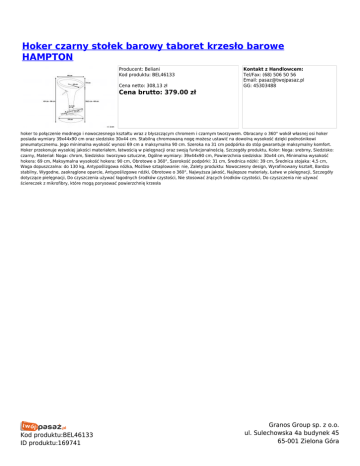 Hoker czarny stołek barowy taboret krzesło barowe HAMPTON Producent: Beliani Kod produktu: BEL46133 Cena netto: 308,13 zł Kontakt z Handlowcem: Tel/Fax: (68) 506 50 56 Email: [email protected] GG: 45303488 Cena brutto: 379.00 zł hoker to połączenie modnego i nowoczesnego kształtu wraz z błyszczącym chromem i czarnym tworzywem. Obracany o 360° wokół własnej osi hoker posiada wymiary 39x44x90 cm oraz siedzisko 30x44 cm. Stabilną chromowaną nogę możesz ustawić na dowolną wysokość dzięki podnośnikowi pneumatycznemu. Jego minimalna wyokość wynosi 69 cm a maksymalna 90 cm. Szeroka na 31 cm podpórka do stóp gwarantuje maksymalny komfort. Hoker przekonuje wysokiej jakości materiałem, łatwością w pielęgnacji oraz swoją funkcjonalnością. Szczegóły produktu, Kolor: Noga: srebrny, Siedzisko: czarny, Materiał: Noga: chrom, Siedzisko: tworzywo sztuczne, Ogólne wymiary: 39x44x90 cm, Powierzchnia siedziska: 30x44 cm, Minimalna wysokość hokera: 69 cm, Maksymalna wysokość hokera: 90 cm, Obrotowe o 360°, Szerokość podpórki: 31 cm, Średnica nóżki: 39 cm, Średnica stojaka: 4,5 cm, Waga dopuszczalna: do 130 kg, Antypoślizgowa nóżka, Możliwe sztaplowanie: nie, Zalety produktu: Nowoczesny design, Wyrafinowany kształt, Bardzo stabilny, Wygodne, zaokrąglone oparcie, Antypoślizgowe nóżki, Obrotowe o 360°, Najwyższa jakość, Najlepsze materiały, Łatwe w pielęgnacji, Szczegóły dotyczące pielęgnacji, Do czyszczenia używać łagodnych środków czystości, Nie stosować żrących środków czystości, Do czyszczenia nie używać ściereczek z mikrofibry, które mogą porysować powierzchnię krzesła Kod produktu:BEL46133 ID produktu:169741 Granos Group sp. z o.o. ul. Sulechowska 4a budynek 45 65-001 Zielona Góra