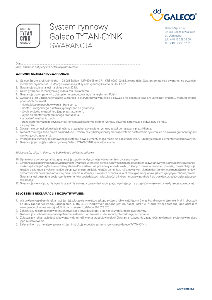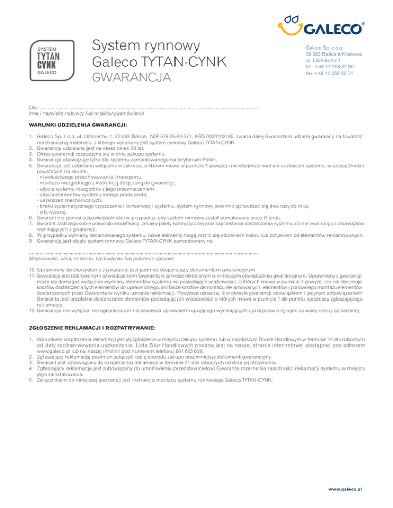 System rynnowy Galeco TYTAN-CYNK GWARANCJA Galeco Sp. z o.o. 32-083 Balice k/Krakowa ul..Uśmiechu 1 tel. +48 12 258 32 00 fax +48 12 258 32 01 Dla: ................................................................................................................................................................... Imię i nazwisko nabywcy lub nr faktury/zamówienia WARUNKI UDZIELENIA GWARANCJI: 1. Galeco Sp. z o.o. ul. Uśmiechu 1, 32-083 Balice, NIP 679-25-94-371, KRS 0000102185, zwana dalej Gwarantem udziela gwarancji na trwałość mechaniczną materiału, z którego wykonany jest system rynnowy Galeco TYTAN-CYNK. 2. Gwarancja udzielana jest na okres okres 30 lat. 3. Okres gwarancji rozpoczyna się w dniu zakupu systemu. 4. Gwarancja obowiązuje tylko dla systemu zamontowanego na terytorium Polski. 5. Gwarancja jest udzielana wyłącznie w zakresie, o którym mowa w punkcie 1 powyżej i nie obejmuje wad ani uszkodzeń systemu, w szczególności powstałych na skutek: - niewłaściwego przechowywania i transportu, - montażu niezgodnego z instrukcją dołączoną do gwarancji, - użycia systemu niezgodnie z jego przeznaczeniem, - użycia elementów systemu innego producenta, - uszkodzeń mechanicznych, - braku systematycznego czyszczenia i konserwacji systemu, system rynnowy powinno sprawdzać się dwa razy do roku, - siły wyższej. 6. Gwarant nie ponosi odpowiedzialności w przypadku, gdy system rynnowy został pomalowany przez Klienta. 7. Gwarant zastrzega sobie prawo do modyfikacji, zmiany palety kolorystycznej oraz zaprzestania dostarczania systemu, co nie zwalnia go z obowiązków wynikających z gwarancji. 8. W przypadku wymiany reklamowanego systemu, nowe elementy mogą różnić się odcieniem koloru lub połyskiem od elementów reklamowanych. 9 . Gwarancją jest objęty system rynnowy Galeco TYTAN-CYNK zamontowany na: .......................................................................................................................................................................... Miejscowość, ulica, nr domu, typ budynku lub położenie opisowe. 10. Uprawniony do skorzystania z gwarancji jest podmiot dysponujący dokumentem gwarancyjnym. 11. Gwarancja jest dobrowolnym oświadczeniem Gwaranta w zakresie określonym w niniejszym oświadczeniu gwarancyjnym. Uprawniony z gwarancji może się domagać wyłącznie wymiany elementów systemu na posiadające właściwości, o których mowa w punkcie 1 powyżej, co nie obejmuje kosztów dostarczenia tych elementów do uprawnionego, ani także kosztów demontażu reklamowanych elementów i ponownego montażu elementów dostarczonych przez Gwaranta w wyniku uznania reklamacji. Powyższe oznacza, iż w okresie gwarancji obowiązkiem i jedynym zobowiązaniem Gwaranta jest bezpłatne dostarczenie elementów posiadających właściwości o których mowa w punkcie 1 do punktu sprzedaży zgłaszającego reklamacje. 12. Gwarancja nie wyłącza, nie ogranicza ani nie zawiesza uprawnień kupującego wynikających z przepisów o rękojmi za wady rzeczy sprzedanej. ZGŁOSZENIE REKLAMACJI I ROZPATRYWANIE: 1. Warunkiem rozpatrzenia reklamacji jest jej zgłoszenie w miejscu zakupu systemu lub w najbliższym Biurze Handlowym w terminie 14 dni roboczych od daty zaobserwowania uszkodzenia. Lista Biur Handlowych podana jest na naszej stronie internetowej dostępnej pod adresem www.galeco.pl lub na naszej infolinii pod numerem telefonu 801 623 626. 2. Zgłaszający reklamację powinien załączyć kopię dowodu zakupu oraz niniejszy dokument gwarancyjny. 3. Gwarant jest zobowiązany do rozpatrzenia reklamacji w terminie 21 dni roboczych od dnia jej otrzymania. 4. Zgłaszający reklamację jest zobowiązany do umożliwienia przedstawicielowi Gwaranta rozeznania zasadności reklamacji systemu w miejscu jego zainstalowania. 5. Załącznikiem do niniejszej gwarancji jest instrukcja montażu systemu rynnowego Galeco TYTAN-CYNK.