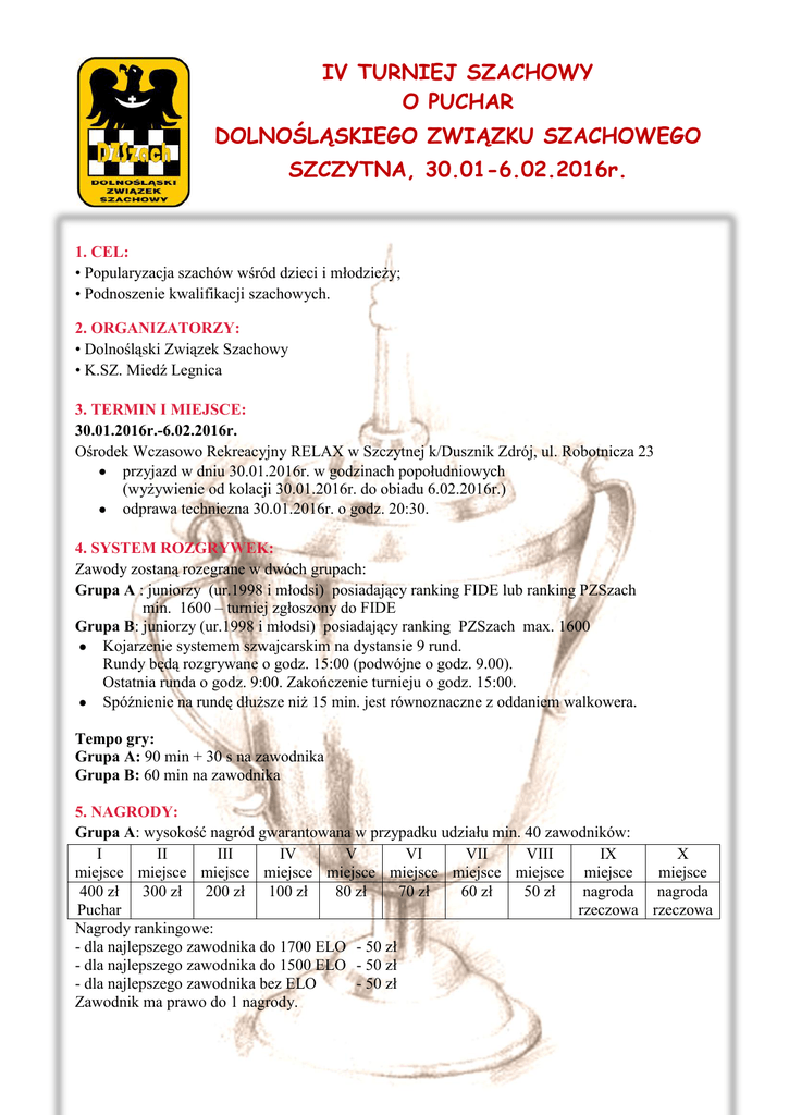 IV TURNIEJ SZACHOWY O PUCHAR DOLNOŚLĄSKIEGO ZWIĄZKU SZACHOWEGO SZCZYTNA, 30.01-6.02.2016r. 1. CEL: • Popularyzacja szachów wśród dzieci i młodzieży; • Podnoszenie kwalifikacji szachowych. 2. ORGANIZATORZY: • Dolnośląski Związek Szachowy • K.SZ. Miedź Legnica 3. TERMIN I MIEJSCE: 30.01.2016r.-6.02.2016r. Ośrodek Wczasowo Rekreacyjny RELAX w Szczytnej k/Dusznik Zdrój, ul. Robotnicza 23 przyjazd w dniu 30.01.2016r. w godzinach popołudniowych (wyżywienie od kolacji 30.01.2016r. do obiadu 6.02.2016r.) odprawa techniczna 30.01.2016r. o godz. 20:30. 4. SYSTEM ROZGRYWEK: Zawody zostaną rozegrane w dwóch grupach: Grupa A : juniorzy (ur.1998 i młodsi) posiadający ranking FIDE lub ranking PZSzach min. 1600 – turniej zgłoszony do FIDE Grupa B: juniorzy (ur.1998 i młodsi) posiadający ranking PZSzach max. 1600 Kojarzenie systemem szwajcarskim na dystansie 9 rund. Rundy będą rozgrywane o godz. 15:00 (podwójne o godz. 9.00). Ostatnia runda o godz. 9:00. Zakończenie turnieju o godz. 15:00. Spóźnienie na rundę dłuższe niż 15 min. jest równoznaczne z oddaniem walkowera. Tempo gry: Grupa A: 90 min + 30 s na zawodnika Grupa B: 60 min na zawodnika 5. NAGRODY: Grupa A: wysokość nagród gwarantowana w przypadku udziału min. 40 zawodników: I II III IV V VI VII VIII IX X miejsce miejsce miejsce miejsce miejsce miejsce miejsce miejsce miejsce miejsce 400 zł 300 zł 200 zł 100 zł 80 zł 70 zł 60 zł 50 zł nagroda nagroda Puchar rzeczowa rzeczowa Nagrody rankingowe: - dla najlepszego zawodnika do 1700 ELO - 50 zł - dla najlepszego zawodnika do 1500 ELO - 50 zł - dla najlepszego zawodnika bez ELO - 50 zł Zawodnik ma prawo do 1 nagrody. Grupa B: I miejsce: Puchar, dyplom oraz nagroda rzeczowa II miejsce: dyplom oraz nagroda rzeczowa III miejsce: dyplom oraz nagroda rzeczowa Wszyscy uczestnicy grupy B otrzymają upominki. 6. DODATKOWE ATRAKCJE: darmowe wejście na kryty basen oraz saunę (co drugi dzień na dwie godziny – wg grafiku podanego na odprawie technicznej); turniej tenisa stołowego; dojazd i powrót autokarem na stoki narciarskie w Zieleńcu (4 razy podczas turnieju) w cenie 10 zł za 1 przejazd (dojazd i powrót) 7. WARUNKI FINANSOWE: Koszt pobytu w OWR Relax z wyżywieniem (3 posiłki dziennie): - 497 zł od osoby (7 dni x 71 zł) – pokoje 2-4 osobowe; - 623 zł od osoby (7 dni x 89 zł) – pokoje jednoosobowe. Wpisowe do turnieju: Open A: 80 zł Open B: 50 zł Wpisowe zawiera opłatę klasyfikacyjno-rankingową. 7. ZGŁOSZENIA: Zgłoszenia do udziału w zawodach oraz rezerwację noclegów należy przesyłać do dnia 10 stycznia 2016r. pocztą e-mail lub telefonicznie do kierownika zawodów Piotra Kowalaka: Kontakt: [email protected] tel.603-033-219 Zgłoszenie powinno zawierać: imię i nazwisko, kategorię, ranking, datę urodzenia (dzień, miesiąc, rok), klub oraz informację odnośnie zakwaterowania. Opłatę za zakwaterowanie oraz wpisowe należy wpłacać do dnia 10 stycznia 2016r. na konto: Dolnośląski Związek Szachowy, ul. Borowska 1-3, 50-529 Wrocław Alior Bank: 51 2490 0005 0000 4530 2174 2296 7. UWAGI KOŃCOWE: Nagrody należy odbierać osobiście podczas zakończenia turnieju; w turnieju obowiązują aktualne przepisy gry FIDE i Kodeksu Szachowego; osoby niepełnoletnie zobowiązane są pozostawać pod opieką osób dorosłych (podczas całego pobytu - wliczając wejścia na basen, saunę i wyjazdy na stoki narciarskie); zawodnicy ubezpieczają się we własnym zakresie; organizator zastrzega sobie prawo do ostatecznej interpretacji i ewentualnych zmian w komunikacie; serwisy turniejowe dostępne będą na stronach internetowych: www.dzszach.pl oraz www.chessarbiter.com