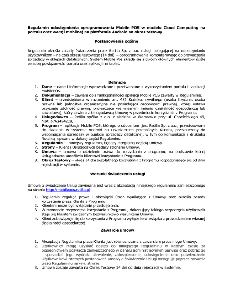 Regulamin udostępnienia oprogramowania Mobile POS w modelu Cloud Computing na portalu oraz wersji mobilnej na platformie Android na okres testowy. Postanowienia ogólne Regulamin określa zasady świadczenia przez Retilia Sp. z o.o. usługi polegającej na udostępnianiu użytkownikom – na czas okresu testowego (14 dni) – oprogramowania komputerowego do prowadzenia sprzedaży w sklepach detalicznych. System Mobile Pos składa się z dwóch głównych elementów ściśle ze sobą powiązanych: portalu oraz aplikacji na tablet. Definicje 1. Dane – dane i informacje wprowadzone i przetwarzane z wykorzystaniem portalu i aplikacji MobilePOS. 2. Dokumentacja – zawiera opis funkcjonalności aplikacji Mobile POS zawarty w Regulaminie. 3. Klient – przedsiębiorca w rozumieniu art. 431 Kodeksu cywilnego (osoba fizyczna, osoba prawna lub jednostka organizacyjna nie posiadająca osobowości prawnej, której ustawa przyznaje zdolność prawną, prowadząca we własnym imieniu działalność gospodarczą lub zawodową), który zawiera z Usługodawcą Umowę w przedmiocie korzystania z Programu, 4. Usługodawca – Retilia spółka z o.o. z siedzibą w Warszawie przy ul. Chrościckiego 49, NIP: 6762454228, 5. Program – aplikacja Mobile POS, którego producentem jest Retilia Sp. z o.o., przystosowany do działania w systemie Android na urządzeniach przenośnych Klienta, przeznaczony do wspomagania sprzedaży w punkcie sprzedaży detalicznej, w tym do komunikacji z drukarką fiskalną opisany w dalszej części Regulaminu. 6. Regulamin – niniejszy regulamin, będący integralną częścią Umowy. 7. Strony – Klient i Usługodawca będący stronami Umowy. 8. Umowa – umowa o udzielenie prawa do korzystania z programu, na podstawie której Usługodawca umożliwia Klientowi korzystanie z Programu. 9. Okres Testowy – okres 14 dni bezpłatnego korzystania z Programu rozpoczynający się od dnia rejestracji w systemie. Warunki świadczenia usługi Umowa o świadczenie Usług zawierana jest wraz z akceptacją niniejszego regulaminu zamieszczonego na stronie http://mobilepos.retilia.pl 1. Regulamin reguluje prawa i obowiązki Stron wynikające z Umowy oraz określa zasady korzystania przez Klienta z Programu. 2. Klientem może być wyłącznie przedsiębiorca. 3. W momencie rozpoczęcia korzystania z Programu, dokonujący takiego rozpoczęcia użytkownik staje się klientem związanym bezwarunkowo warunkami Umowy. 4. Klient zobowiązuje się do korzystania z Programu wyłącznie w związku z prowadzeniem własnej działalności gospodarczej. Zawarcie umowy 1. Akceptacja Regulaminu przez Klienta jest równoznaczna z zawarciem przez niego Umowy. 2. Użytkownicy mogą uzyskać dostęp do niniejszego Regulaminu w każdym czasie za pośrednictwem odsyłacza zamieszczonego w panelu administracyjnym Serwisu oraz pobrać go i sporządzić jego wydruk. Utrwalenie, zabezpieczenie, udostępnienie oraz potwierdzenie Użytkownikowi istotnych postanowień umowy o świadczenie Usługi następuje poprzez zawarcie treści Regulaminu na ww. stronie. 3. Umowa zostaje zawarta na Okres Testowy 14 dni od dnia rejestracji w systemie. 4. Po upływie okresu testowego w celu dalszego korzystania z Programu Klient zobowiązany jest zawrzeć odrębną umowę z Usługodawcą na korzystanie z Programu. Prawa autorskie oraz własność intelektualna 1. Zawarcie i wykonanie Umowy nie oznacza przeniesienia na Klienta praw własności intelektualnej lecz upoważnia go do korzystania z Programu na zasadach opisanych w Regulaminie. Przetwarzanie danych osobowych 1. Klient, jako administrator danych powierza firmie Retilia Sp. z o.o. zgodnie z ustawą o danych osobowych art. 31 Ustawy z dnia 29 sierpnia 1997 r., do przetwarzania danych osobowych, a Retilia przyjmuje zlecenie ich przetwarzania. 2. Zakresem przetwarzania objęte jest przechowywanie danych w Infrastrukturze i ich udostępnianie za pośrednictwem Udostępniania Funkcji Programu. Celem przetwarzania danych przez Retilia jest umożliwienie Klientowi dostępności danych osobowych, które przetwarza Klient w związku z prowadzeniem przedsiębiorstwa. 3. Klient nie udziela Retilii dostępu do zawartości bazy danych w sposób, który umożliwiłby zapoznanie się z danymi osobowymi powierzonymi do przetwarzania. Retilia przetwarza te dane osobowe wyłącznie jako zamknięte struktury danych, zrealizowane w postaci plików systemu operacyjnego. 4. Retilia zapewni wymagane przepisami prawa środki techniczne i organizacyjne zapewniające ochronę przetwarzanych danych osobowych w zakresie objętym Umową. Odpowiedzialność Usługodawcy 1. Wszelkie nieprawidłowości w działaniu Programu Klient powinien niezwłocznie zgłosić Usługodawcy na następujący adres poczty elektronicznej:[email protected]. Zgłoszenie powinno wskazywać konkretne nieprawidłowości oraz NIP Klienta. 2. Usługodawca zobowiązuje się usunąć wszelkie wskazane w zgłoszeniu dokonanym zgodnie z ust. 1 nieprawidłowości bez zbędnej zwłoki, z wyjątkiem przypadków nieprawidłowości zaistniałych z przyczyn leżących po stronie Klienta. Koszty usunięcia nieprawidłowości leżących po stronie Klienta obciążają Klienta. 3. Usługodawca nie odpowiada za nieprawidłowe działanie Programu w przypadku korzystania z Programu przez Klienta niezgodnie z Umową, a także w przypadku: a. ingerencji w Program przez osoby nieuprawnione, b. nieprawidłowego korzystania przez Klientem z Programu, w szczególności w sposób niezgodny z Regulaminem, c. przerw w dostępie do Programu z przyczyn technicznych niezależnych od Usługodawcy (w szczególności brak dostępu do sieci Internet, niewywiązanie się z zobowiązań przez Klienta lub osoby trzecie itp.). Dokumentacja 1. Funkcjonalność aplikacji na tablet: a. b. c. d. e. f. g. h. logowanie do portalu, rejestrowanie tabletu w systemie (przez webservice), parowanie drukarki z tabletem, pobranie kartoteki towarowej z informację o stanie - zapis