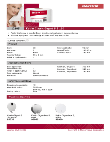 12105 • • Katrin Classic Gigant S 2 150 Papier toaletowy o standardowej jakości, makulaturowy, dwuwarstwowy Wysoka wydajność minimalizująca konieczność wymiany rolek Produkt Gsm: Warstwy: Kolor: Rozmiar listka: Rolek w opakowaniu: 18 2 Biały 95 x 0 mm 1 Szerokość rolki: Długość rolki: Średnica rolki: 95 mm 150.00 m 180 mm Rozmiar / Długość: Rozmiar / Szerokość: Rozmiar / Wysokość: 360 mm 540 mm 190 mm Jednostka handlowa Ilość opakowań konsumenckich: Rolek w opakowaniu: Opis pakowania: Kod EAN: 1 12 Worek 5907730503175 Informacje paletowe Opakowań na palecie: Wysokość palety: Rodzaj palety: 40 2050 mm EUR 800 mm x 1200 mm Wlasciwe dozowniki Katrin Gigant S dispenser 95335 Updated 15/07/2009 Katrin Gigantbox S, steel 98965 Katrin Gigantbox S, white 98950 Copyright © Metsä Tissue Corporation