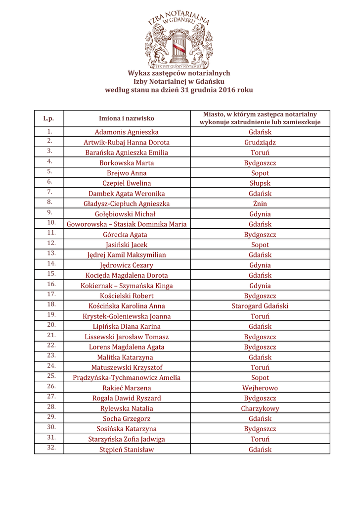 Wykaz zastępców notarialnych Izby Notarialnej w Gdańsku według