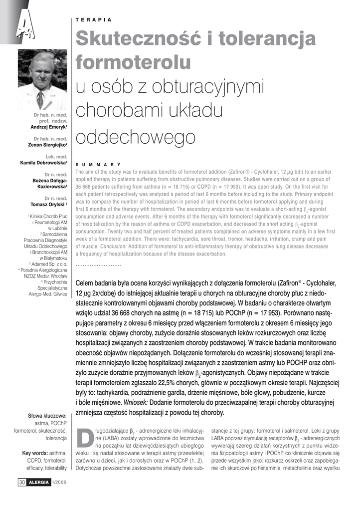 T E R A P I A Dr hab. n. med. prof. nadzw. Andrzej Emeryk1 Dr hab. n. med. Zenon Siergiejko2 Lek. med. Kamila Dobrowolska3 Dr n. med. Bożena DołęgaKozierowska4 Dr n. med. Tomasz Orylski 5 Klinika Chorób Płuc i Reumatologii AM w Lublinie 2 Samodzielna Pracownia Diagnostyki Układu Oddechowego i Bronchoskopii AM w Białymstoku 3 Adamed Sp. z o.o. 4 Poradnia Alergologiczna NZOZ Medar, Wrocław 5 Przychodnia Specjalistyczna Alergo-Med, Gliwice 1 Słowa kluczowe: astma, POChP, formoterol, skuteczność, tolerancja Key words: asthma, COPD, formoterol, efficacy, tolerability 30 ALERGIA 1/2006 Skuteczność i tolerancja formoterolu u osób z obturacyjnymi chorobami układu oddechowego S U M M A R Y The aim of the study was to evaluate benefits of formoterol addition (Zafiron® - Cyclohaler, 12 µg bdi) to an earlier applied therapy in patients suffering from obstructive pulmonary diseases. Studies were carried out on a group of 36 668 patients suffering from asthma (n = 18 715) or COPD (n = 17 953). It was open study. On the first visit for each patient retrospectively was analyzed a period of last 6 months before including to the study. Primary endpoint was to compare the number of hospitalization in period of last 6 months before formoterol applying and during first 6 months of the therapy with formoterol. The secondary endpoints was to evaluate a short-acting β 2-agonist consumption and adverse events. After 6 months of the therapy with formoterol significantly decreased a number of hospitalization by the reason of asthma or COPD exacerbation, and decreased the short acting β 2-agonist consumption. Twenty two and half percent of treated patients complained on adverse symptoms mainly in a few first week of a formoterol addition. There were: tachycardia, sore throat, tremor, headache, irritation, cramp and pain of muscle. Conclusion: Addition of formoterol to anti-inflammatory therapy of obstructive lung disease decreases a frequency of hospitalization because of the disease exacerbation. .......................... Celem badania była ocena korzyści wynikających z dołączenia formoterolu (Zafiron® - Cyclohaler, 12 µg 2x/dobę) do istniejącej aktualnie terapii u chorych na obturacyjne choroby płuc z niedostatecznie kontrolowanymi objawami choroby podstawowej. W badaniu o charakterze otwartym wzięło udział 36 668 chorych na astmę (n = 18 715) lub POChP (n = 17 953). Porównano następujące parametry z okresu 6 miesięcy przed włączeniem formoterolu z okresem 6 miesięcy jego stosowania: objawy choroby, zużycie doraźnie stosowanych leków rozkurczowych oraz liczbę hospitalizacji związanych z zaostrzeniem choroby podstawowej. W trakcie badania monitorowano obecność objawów niepożądanych. Dołączenie formoterolu do wcześniej stosowanej terapii znamiennie zmniejszyło liczbę hospitalizacji związanych z zaostrzeniem astmy lub POCHP oraz obniżyło zużycie doraźnie przyjmowanych leków β2-agonistycznych. Objawy niepożądane w trakcie terapii formoterolem zgłaszało 22,5% chorych, głównie w początkowym okresie terapii. Najczęściej były to: tachykardia, podrażnienie gardła, drżenie mięśniowe, bóle głowy, pobudzenie, kurcze i bóle mięśniowe. Wniosek: Dodanie formoterolu do przeciwzapalnej terapii choroby obturacyjnej zmniejsza częstość hospitalizacji z powodu tej choroby. D ługodziałające β2 - adrenergiczne leki inhalacyjne (LABA) zostały wprowadzone do lecznictwa na początku lat dziewięćdziesiątych ubiegłego wieku i są nadal stosowane w terapii astmy przewlekłej zarówno u dzieci, jak i dorosłych oraz w POChP (1, 2). Dotychczas powszechne zastosowanie znalazły dwie sub- stancje z tej grupy: formoterol i salmeterol. Leki z grupy LABA poprzez stymulację receptorów β2 - adrenergicznych wywierają szereg działań korzystnych z punktu widzenia fizjopatologii astmy i POChP, co klinicznie objawia się przede wszystkim jako: rozkurcz oskrzeli oraz zapobieganie ich skurczowi po histaminie, metacholinie oraz wysiłku T E R A P I A fizycznym (3). Inne, ważne działania obejmują poprawę oczyszczania śluzowo-rzęskowego, zmniejszenie przepuszczalności śródbłonka, zwiększenie sekrecji śluzu i nabłonkowego czynnika relaksacyjnego (EDRF), hamowanie uwalniania niektórych mediatorów reakcji zapalno-alergicznej w drogach oddechowych, poprawę czynności przepony, obniżenie ciśnienia płucnego, zwiększenie frakcji wyrzutowej prawej komory (4, 5, 6). Na rynku dostępne są dwie zasadnicze postacie tych leków: ciśnieniowy inhalator dozujący (pMDI) oraz różne typy inhalatorów suchego proszku (DPIs). Te pierwsze wcześniej oparte były na nośnikach freonowych (CFC), a od kilku lat na substancjach bezfreonowych - hydrofluoroalkanach (HFA). Nie wykazano różnic w skuteczności i tolerancji formoterolu podawanego z HFA-pMDI, CFC-pMDI lub z różnych DPIs u chorych na astmę (7, 8). Większość LABA najczęściej jest podawana z inhalatorów proszkowych, co wydaje się być związane z łatwiejszą, w porównaniu do pMDI techniką inhalacji (1, 9). W Polsce stosowane są następujące inhalatory proszkowe: Aerolizer, Cyclohaler, Dysk, Novolizer i Turbuhaler. Różnią się one między sobą wieloma parametrami, między innymi: cechami fizycznymi, oporem wewnętrznym (własnym), sposobem uwalniania leku, obecnością nośnika, ilością zawartych lub ładowanych dawek leku, złożonością techniki inhalowania i wielkością depozycji płucnej (10, 11). Stosowanie tych leków, oprócz udokumentowanych korzyści może nieść za sobą pewne działania niepożądane. Wynikają one przede wszystkim z pobudzenia receptorów β1-adrenergicznych, co wydaje się szczególnie istotne u dorosłych (12, 13, 14). Celem obecnego badania była ocena skuteczności klinicznej oraz tolerancji proszkowej postaci formoterolu w okresie 6 miesięcznego stosowania tego leku u dzieci i dorosłych celem poprawy kontroli astmy lub POCHP. Materiał i metody 