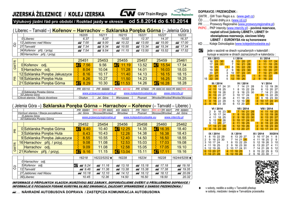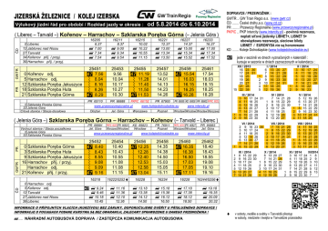 JIZERSKÁ ŽELEZNICE / KOLEJ IZERSKA Výlukový jízdní řád pro období / Rozkład jazdy w okresie : od 5.8.2014 do 6.10.2014 . PR GWTR ČD ( Liberec – Tanvald –) Kořenov – Harrachov – Szklarska Poręba Górna (– Jelenia Góra ) 0 Liberec 12 Jablonec nad Nisou 27 Tanvald 34 Kořenov příj. / przyj. 39 Harrachov příj. / przyj. 0 Kořenov odj. 5 Harrachov odj. 12 Szklarska Poręba Jakuszyce 18 Szklarska Poręba Huta 21 Szklarska Poręba Górna 0 Szklarska Poręba Górna 32 Jelenia Góra Cílová stanice / Stacja docelowa 16205 6.37 7.00 7.34 7.54 16211 8.37 9.00 9.34 9.54 16215 10.02 10.22 10.55 11.15 16221 12.37 13.00 13.34 13.50 16227 14.37 15.00 15.34 15.52 16233 16.37 17.00 17.34 17.52 25451 7.56 8.04 8.16 8.26 8.29 25453 9.56 10.04 10.17 10.27 10.30 25455 11.19 11.28 11.40 11.50 11.53 25457 13.52 14.01 14.13 14.23 14.26 25459 15.54 16.03 16.15 16.25 16.28 25461 17.54 18.03 18.15 18.25 18.28 PR 65110 PR 66888 PKPIC 66152 www.przewozyregionalne.pl Olsztyn Jel. Góra PR 67900 Poznań XII / 2013 16 23 30 17 24 31 18 25 19 26 20 27 21 28 15 22 39 PR GWTR ČD 0 Szklarska Poręba Górna 3 Szklarska Poręba Huta 9 Szklarska Poręba Jakuszyce 16 Harrachov příj. / przyj. Harrachov odj. 21 Kořenov příj. / przyj. 0 Harrachov odj. 5 Kořenov odj. 12 Tanvald 27 Jablonec nad Nisou 39 Liberec PR 66881 Jel. Góra PKPIC 66251 PR 66825 Warszawa Wrocław KD 69823 Wrocław www.przewozyregionalne.pl PR 76911 Poznań www.kolejedolnoslaskie.eu 25456 12.25 12.28 12.40 12.53 12.58 13.04 25458 14.35 14.38 14.50 15.03 15.05 15.11 25460 16.35 16.38 16.50 17.03 17.05 17.11 25462 18.40 18.43 18.55 19.08 19.10 19.16 16218 16222/5252 16228 16234 16228 16244/5256 11.16 11.36 12.10 13.18 13.58 13.38 14.16 14.12 15.18 13.58 15.38 14.16 16.12 17.18 13.58 17.38 14.16 18.12 19.18 19.35 20.09 12.36 14.51 14.50 15.16 14.51 16.50 15.16 14.51 18.50 15.16 20.32 9.24 9.46 10.18 10.45 1 2 3 4 5 6 7 8 VI / 2014 VII / 2014 9 16 23 30 7 14 21 10 17 24 1 8 15 22 11 18 25 2 9 16 23 12 19 26 3 10 17 24 13 20 27 4 11 18 25 14 21 28 5 12 19 26 15 22 29 6 13 20 27 www.intercity.pl 25454 10.40 10.43 10.55 11.08 11.08 11.15 INFORMACE O PŘÍPOJNÝCH VLACÍCH (KURZÍVOU) BEZ ZÁRUKY, DOPORUČUJEME OVĚŘIT U PŘÍSLUŠNÉHO DOPRAVCE ! INFORMACJE O POCIĄGACH PODANE KURSYWĄ SĄ BEZ GWARANCJI, ZALECAMY SPRAWDZENIE U DANEGO PRZEWOŹNIKA ! ….. NÁHRADNÍ AUTOBUSOVÁ DOPRAVA / ZASTĘPCZA KOMUNIKACJA AUTOBUSOWA 1 2 3 4 5 6 7 1 2 II / 2014 3 10 17 4 11 18 5 12 19 6 13 20 7 14 21 8 15 22 9 16 23 1 2 PR 66883 Jel. Góra 25452 8.40 8.43 8.55 9.08 9.09 9.16 27 28 29 30 31 III / 2014 IV / 2014 V / 2014 10 17 24 31 7 14 21 28 5 12 19 11 18 25 1 8 15 22 29 6 13 20 12 19 26 2 9 16 23 30 7 14 21 13 20 27 3 10 17 24 1 8 15 22 14 21 28 4 11 18 25 2 9 16 23 15 22 29 5 12 19 26 3 10 17 24 16 23 30 6 13 20 27 4 11 18 25 www.intercity.pl PKPIC 66151 PR 66827 Warszawa Wrocław 1 2 3 4 5 I / 2014 6 13 20 7 14 21 8 15 22 9 16 23 10 17 24 11 18 25 12 19 26 3 4 5 6 7 8 9 Wrocław Wrocław Wrocław Warszawa ( Jelenia Góra –) Szklarska Poręba Górna – Harrachov – Kořenov (– Tanvald – Liberec ) Výchozí stanice / Stacja początkowa 0 Jelenia Góra 32 Szklarska Poręba Górna jede v sezóně ve dnech vyznačených v kalendáři : kursuje w sezonie w dniach zaznaczonych w kalendarzu : PR 66856 KD 69838 PR 66862 PKPIC 66252 www.kolejedolnoslaskie.eu Warszawa DOPRAVCE / PRZEWOŻNIK : GWTR .. GW Train Regio a.s. (www.gwtr.cz) ČD ..….. České dráhy,a.s. (www.cd.cz) PR ……. Przewozy Regionalne (www.przewozyregionalne.pl) PKPIC .. PKP Intercity (www.intercity.pl) - povinná rezervace, neplatí síťové jízdenky LIBNET+, LIBNET 5+ obowiązkowa rezerwacja, sieciowe bilety LIBNET / EURONYSA nie są honorowane KD ….... Koleje Dolnośląskie (www.kolejedolnoslaskie.eu) IX / 2014 X / 2014 8 15 22 29 6 13 20 9 16 23 30 7 14 21 10 17 24 1 8 15 22 11 18 25 2 9 16 23 12 19 26 3 10 17 24 13 20 27 4 11 18 25 14 21 28 5 12 19 26 27 28 29 30 31 28 29 30 31 VIII / 2014 4 11 18 5 12 19 6 13 20 7 14 21 1 8 15 22 2 9 16 23 3 10 17 24 XI / 2014 3 10 17 4 11 18 5 12 19 6 13 20 7 14 21 1 8 15 22 2 9 16 23 v soboty, neděle a svátky v Tanvaldě přestup w soboty, niedziele i święta w Tanvaldzie przesiadka 24 25 26 27 28 29 30 24 25 26 27 28 26 27 28 29 30 31 25 26 27 28 29 30 31 XII/2014 1 8 2 9 3 10 4 11 5 12 6 13 7 Tarif ve vlacích (Kořenov) – Harrachov – Szklarska Poręba – stav ke dni Taryfa w pociągach (Kořenov) – Harrachov – Szklarska Poręba – stan na V úseku Kořenov-Harrachov platí tarif IDOL. Na území ČR platí tarif dopravce GW TrainRegio a.s.. Na území Polska platí tarif dopravce Przewozy Regionalne. Jízdné v mezinárodních vlacích lze platit za úsek na území České Republiky (dopravce GW Train Regio a.s.) v měně CZK nebo PLN, za úsek na území Polska (dopravce Przewozy Regionalne) pouze v PLN. Nabízené slevy a smluvní podmínky jsou uvedeny na internetových stránkách dopravců, u průvodčích a jejich stručné znění je umístěno ve vozidlech. Při jízdě ve směru z ČR do Polska platí jízdenka vydaná na státní hranici (tj. do tarifního bodu Harrachov st.hr.) až do stanice Szklarska Poręba Jakuszyce. Při jízdě ve směru z Polska do ČR platí jízdenka vydaná na státní hranici (tj. do tarifního bodu Szklarska Poręba Jakuszyce gr.p.) až do stanice Harrachov. Na odcinku Kořenov-Harrachov obowiązuje taryfa IDOL. Na terenie Czech obowiązuje taryfa przewoźnika GW Train Regio. Na terenie Polski obowiązuje taryfa przewoźnika Przewozy Regionalne. Opłat za połączenia międzynarodowe dotyczące odcinka na terenie Czech (przewoźnik GW Train Regio) można dokonywać w walucie CZK lub PLN, natomiast za odcinek znajdujący się na terenie Polski (przewoźnik Przewozy Regionalne) tylko w PLN. Oferowane zniżki i warunki umowy znajdują się na stronach internetowych przewoźników, informacje o nich udzielane są przez konduktorów a krótki opis został umieszczony także w 