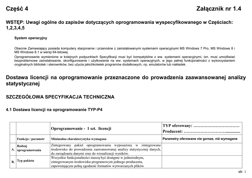 Część 4 Załącznik nr 1.4 WSTĘP: Uwagi ogólne do zapisów dotyczących oprogramowania wyspecyfikowanego w Częściach: 1,2,3,4,5 System operacyjny Obecnie Zamawiający posiada komputery stacjonarne i przenośne z zainstalowanymi systemami operacyjnymi MS Windows 7 Pro, MS Windows 8 i MS Windows 8.1 w wersji 64-bitowej. Oprogramowanie wymienione w kolejnych podpunktach Specyfikacji musi być kompatybilne z ww. systemami operacyjnymi, tzn. musi umożliwiać bezproblemowe zainstalowanie, skonfigurowanie i użytkowanie na ww. systemach operacyjnych, w jego pełnej funkcjonalności z wykorzystaniem oryginalnych bibliotek i sterowników, bez użycia jakichkolwiek programów dodatkowych, np. emulatorów lub nakładek. Dostawa licencji na oprogramowanie przeznaczone do prowadzenia zaawansowanej analizy statystycznej SZCZEGÓŁOWA SPECYFIKACJA TECHNICZNA 4.1 Dostawa licencji na oprogramowanie TYP-P4 Funkcja / parametr Rodzaj A. oprogramowania B. Typ pakietu Oprogramowanie - 1 szt. licencji TYP oferowany: …………………………… Producent: ………………………….............. Minimalna charakterystyka wymagana Parametry oferowane nie gorsze, niż wymagane Zintegrowany pakiet oprogramowania wyposażony w zintegrowane środowisko do prowadzenia zaawansowanej analizy statystycznej danych, do zarządzania danymi oraz do wizualizacji wyników. Wszystkie funkcjonalności muszą być dostępne w jednorodnym, zintegrowanym środowisku programowym jednego producenta, zapewniającym pełną zgodność formatów wytwarzanych plików str. 1 wynikowych obsługiwanych przez poszczególne programy wchodzące w skład pakietu. Zamawiający nie dopuszcza zestawów niezintegrowanych programów pochodzących od różnych producentów. Zasady licencjonowania i subskrypcji: wersja jednostanowiskowa nieograniczona w czasie licencja liczba licencji: 1 (jedna) Sposób i zakres typ licencji : komercyjna C. licencjonowania oraz rodzaj licencji: nowa subskrypcji wersja językowa: polska wersja produktu: wersja 64-bitowa z nośnikiem Roczne (12-miesięczne) wsparcie techniczne producenta z aktualizacjami do najnowszej wersji (Subskrypcja Maintenance) Zamawiający posiada oraz wykorzystuje oprogramowanie Statistica 10 Wymagana zgodność z Pakiet Zaawansowany wraz z projektami wytworzonymi z wykorzystaniem ww. oprogramowania, w związku z czym wymaga pełnej kompatybilności oprogramowaniem D. posiadanym przez oferowanego oprogramowania z posiadanym oprogramowaniem Statistica 10 Pakiet Zaawansowany co najmniej w zakresie zgodności formatów Zamawiającego: plików wynikowych oraz możliwości przetwarzania posiadanych projektów za pomocą oferowanego oprogramowania. Zintegrowany pakiet oprogramowania musi zawierać niżej wymienione funkcje analityczne: Statystyki podstawowe i tabele, Dopasowanie rozkładów, Regresja wieloraka, Analiza wariancji (ANOVA), Statystyki nieparametryczne, Ogólne modele liniowe, Minimalne Uogólnione modele liniowe i nieliniowe, E. wymagania Ogólne modele regresji, funkcjonalne Modele cząstkowych najmniejszych kwadratów, Komponenty wariancyjne, Analiza przeżycia, Estymacja nieliniowa, Linearyzowana regresja nieliniowa, Analiza log-liniowa tabel liczności, Szeregi czasowe i prognozowanie, Modelowanie równań strukturalnych, str. 2 Analiza skupień, Analiza czynnikowa, Składowe główne i klasyfikacja, Algorytm NIPALS dla analizy składowych głównych i metody cząstkowych najmniejszych kwadratów, Analiza kanoniczna, Analiza rzetelności i pozycji, Drzewa klasyfikacyjne, Analiza korespondencji, Skalowanie wielowymiarowe, Analiza dyskryminacyjna, Ogólne modele analizy dyskryminacyjnej, Analiza mocy testów Przykładowym pakietem oprogramowania spełniającym wyżej opisane wymagania Zamawiającego może być np. pakiet oprogramowania STATISTICA Pakiet Zaawansowany lub pakiet oprogramowania równoważny, spełniający wszystkie wyżej opisane wymagania. str. 3