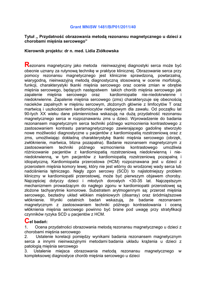 Grant MNiSW 1481/B/P01/2011/40 Tytuł ,, Przydatność obrazowania metodą rezonansu magnetycznego u dzieci z chorobami mięśnia sercowego” Kierownik projektu: dr n. med. Lidia Ziółkowska Rezonans magnetyczny jako metoda nieinwazyjnej diagnostyki serca moŜe być obecnie uznany za rutynową technikę w praktyce klinicznej. Obrazowanie serca przy pomocy rezonansu magnetycznego jest klinicznie sprawdzoną, powtarzalną, wiarygodną, nieinwazyjną metodą diagnostyczną stosowaną w ocenie morfologii, funkcji, charakterystyki tkanki mięśnia sercowego oraz ocenie zmian w obrębie mięśnia sercowego, będących następstwem takich chorób mięśnia sercowego jak zapalenie mięśnia sercowego oraz kardiomiopatie nie-niedokrwienne i niedokrwienne. Zapalenie mięśnia sercowego (zms) charakteryzuje się obecnością nacieków zapalnych w mięśniu sercowym, złoŜonych głównie z limfocytów T oraz martwicą i uszkodzeniem kardiomiocytów nietypowym dla zawału. Od początku lat 90-tych XX wieku dane piśmiennictwa wskazują na duŜą przydatność rezonansu magnetycznego serca w rozpoznawaniu zms u dzieci. Wprowadzenie do badania rezonansem magnetycznym serca techniki późnego wzmocnienia kontrastowego z zastosowaniem kontrastu paramagnetycznego zawierającego gadolinę stworzyło nowe moŜliwości diagnostyczne u pacjentów z kardiomiopatią rozstrzeniową oraz z zms, umoŜliwiając dokładną charakterystykę tkanki mięśnia sercowego (obrzęk, zwłóknienie, martwica, blizna pozapalna). Badanie rezonansem magnetycznym z zastosowaniem techniki późnego wzmocnienia kontrastowego umoŜliwia róŜnicowanie pacjentów z kardiomiopatią rozstrzeniową niedokrwienną i nieniedokrwienną, w tym pacjentów z kardiomiopatią rozstrzeniową pozapalną i idiopatyczną. Kardiomiopatia przerostowa (HCM) rozpoznawana jest u dzieci z przerostem mięśnia komory lewej, który nie jest wtórny do wrodzonej wady serca lub nadciśnienia tętniczego. Nagły zgon sercowy (SCD) to najistotniejszy problem kliniczny w kardiomiopatii przerostowej, moŜe być pierwszym objawem choroby. Najczęściej dotyczy dzieci i młodych dorosłych <30-35 lat. Najczęstszym mechanizmem prowadzącym do nagłego zgonu w kardiomiopatii przerostowej są złoŜone tachyarytmie komorowe. Substratem arytmogennym są: przerost mięśnia sercowego, bezładny układ włókien mięśniowych (disarray) oraz śródmiąŜszowe włóknienie. Wyniki ostatnich badań wskazują, Ŝe badanie rezonansem magnetycznym z zastosowaniem techniki późnego kontrastowania i oceną włóknienia mięśnia sercowego powinno być brane pod uwagę przy stratyfikacji czynników ryzyka SCD u pacjentów z HCM. Cel badań: 1. Ocena przydatności obrazowania metodą rezonansu magnetycznego u dzieci z chorobami mięśnia sercowego 2. Ustalenie korelacji pomiędzy wynikami badania rezonansem magnetycznym serca a innymi nieinwazyjnymi metodami badania układu krąŜenia u dzieci z patologią mięśnia sercowego 3. Ustalenie miejsca obrazowania metodą rezonansu magnetycznego w kompleksowej diagnostyce chorób mięśnia sercowego u dzieci Materiał: Materiał będzie obejmował kolejno hospitalizowanych w Klinice Kardiologii IPCZD pacjentów w wieku od 7 do 18 lat, z rozpoznaniem kardiomiopatii przerostowej, podejrzeniem zapalenia mięśnia sercowego, kardiomiopatią rozstrzeniową o nieustalonej etiologii (róŜnicowanie kardiomiopatii pozapalnej vs kardiomiopatii o innej etiologii tj. idiopatycznej, niedokrwiennej). Planowane jest objęcie badaniami około 60 dzieci z róŜnymi postaciami patologii mięśnia sercowego. Obecnie pod opieką Kliniki Kardiologii IPCZD znajduje się 35 pacjentów z kardiomiopatią przerostową, 7 dzieci z zapaleniem mięśnia sercowego oraz 6 pacjentów z kardiomiopatią rozstrzeniową, u których planowane jest wykonanie badania metodą rezonansu magnetycznego serca. Charakterystyka oczekiwanych wyników badań: 1. Ustalenie kryteriów diagnostycznych w chorobach mięśnia sercowego u dzieci ze szczególnym uwzględnieniem metod obrazowania rezonansem magnetycznym serca. 2. Opracowanie protokołu postępowania diagnostycznego w chorobach mięśnia sercowego u dzieci z uwzględnieniem charakteru zmian, progresji choroby i stratyfikacji czynników ryzyka nagłego zgonu sercowego.