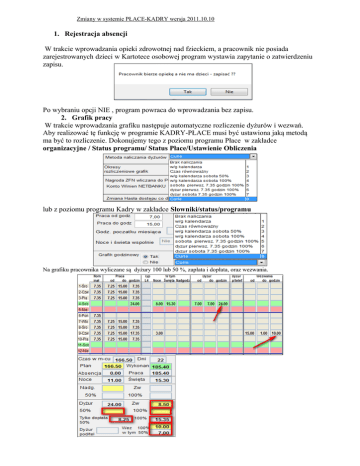 Zmiany w systemie PŁACE-KADRY wersja 2011.10.10 1. Rejestracja absencji W trakcie wprowadzania opieki zdrowotnej nad fzieckiem, a pracownik nie posiada zarejestrowanych dzieci w Kartotece osobowej program wystawia zapytanie o zatwierdzeniu zapisu. Po wybraniu opcji NIE , program powraca do wprowadzania bez zapisu. 2. Grafik pracy W trakcie wprowadzania grafiku następuje automatyczne rozliczenie dyżurów i wezwań. Aby realizować tę funkcję w programie KADRY-PŁACE musi być ustawiona jaką metodą ma być to rozliczenie. Dokonujemy tego z poziomu programu Płace w zakładce organizacyjne / Status programu/ Status Płace/Ustawienie Obliczenia lub z poziomu programu Kadry w zakładce Słowniki/status/programu Na grafiku pracownika wyliczane są dyżury 100 lub 50 %, zapłata i dopłata, oraz wezwania. Poszczególne metody rozliczania dyżurów. 1. wg Kalendarza Za wszystkie dyżury i wezwania zapłata i opłata − − − dzień świąteczny i sobota - zapłata i dopłata 100% Noc - zapłata i dopłata 100% dzień powszedni - zapłata i dopłata 50% 2. czas równoważny - noce - zapłata i dopłata 100 % - Jeżeli w danym dniu występuje praca zaliczana do nominału − występuje - zapłata i dopłata 50% − nie występuje – zapłata i dopłata 100% 3. wg kalendarza sobota 50% − dzień świąteczny - dopłata 100% − Noc – dopłata 100% − dzień powszedni i sobota - dopłata 50% 4. wg kalendarza sobota 100 % − dzień świąteczny i sobota - zapłata i dopłata 100% − Noc - zapłata i dopłata 100% − dzień powszedni - zapłata i dopłata 50% 5. Sobota pierwsze 7.35 godz 100% − dzień świąteczny - zapłata i dopłata 100% − Noc - zapłata i dopłata 100% − sobota pierwsze 7.35 godzin dyżuru - zapłata i dopłata 100% − pozostały dyżur - zapłata i dopłata 50% Pozostałe metody nr 6,7,8 oddzielnie rozliczają zapłatę a oddzielnie dopłatę. Jeżeli wystepuję niewykonanie nominału część godzin dyżurowych jest zaliczana do czasu nominalnego. Zapłata jest tylko za godziny ponadwymiarowe. Dopłaty są za wszystkie godziny dyżurowe 6. Pierwsze 7.35 godzin dyżuru 100% − dzień świąteczny - dopłata 100% − Noc - dopłata 100% − sobota /dzień powszedni - do pełnego etatu danej grupy zawodowej(np dla RTG 5 godz ,lekarze 7.35 godzin ) pracy(dyżur)+nominał – dopłata 100 % - pozostałe godziny , dopłata 50% 7. Pierwsze 7.35 godzin dyżuru 100% − dzień świąteczny - dopłata 100% − Noc - dopłata 100% − sobota /dzień powszedni - do 7.35 godzin pracy(dyżur)+nominał – dopłata 100 %l - pozostałe godziny , dopłata 50% 8.Curie − dzień świąteczny - dopłata 100% − Noc - dopłata 100% − sobota - do pełnego etatu danej grupy zawodowej(np dla RTG 5 godz ,lekarze 7.35 godzin )pracy(dyżur)+nominał – dopłata 100 % - pozostałe godziny , dopłata 50% - dzień powszedni - dopłata 50% Godziny wezwań są także przeliczane wg wybranej metody ------------------------------------------------------------------------------------------Koniec opisu aktualizacji wersji 2011.10.10