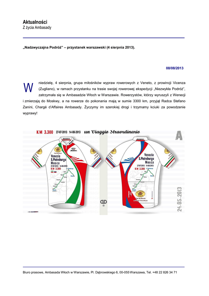 Aktualności Z życia Ambasady „Nadzwyczajna Podróż” – przystanek warszawski (4 sierpnia 2013). 08/08/2013 W niedzielę, 4 sierpnia, grupa miłośników wypraw rowerowych z Veneto, z prowincji Vicenza (Zugliano), w ramach przystanku na trasie swojej rowerowej ekspedycji „Niezwykła Podróż”, zatrzymała się w Ambasadzie Włoch w Warszawie. Rowerzystów, którzy wyruszyli z Wenecji i zmierzają do Moskwy, a na rowerze do pokonania mają w sumie 3300 km, przyjął Radca Stefano Zanini, Chargé d’Affaires Ambasady. Życzymy im szerokiej drogi i trzymamy kciuki za powodzenie wyprawy! Biuro prasowe, Ambasada Włoch w Warszawie, Pl. Dąbrowskiego 6, 00-055 Warszawa, Tel. +48 22 826 34 71 Ufficio Stampa, Ambasciata d’Italia a Varsavia, Pl. Dąbrowskiego 6, 00-055 Warszawa, Tel. +48 22 826 34 71 Ufficio Stampa, Ambasciata d’Italia a Varsavia, Pl. Dąbrowskiego 6, 00-055 Warszawa, Tel. +48 22 826 34 71 Ufficio Stampa, Ambasciata d’Italia a Varsavia, Pl. Dąbrowskiego 6, 00-055 Warszawa, Tel. +48 22 826 34 71