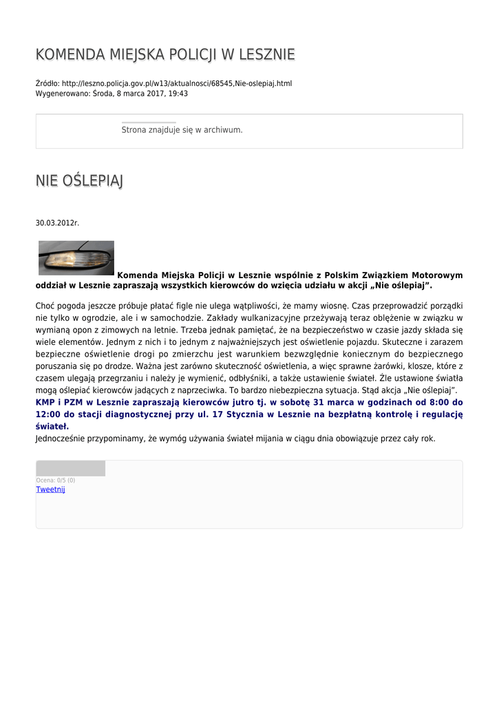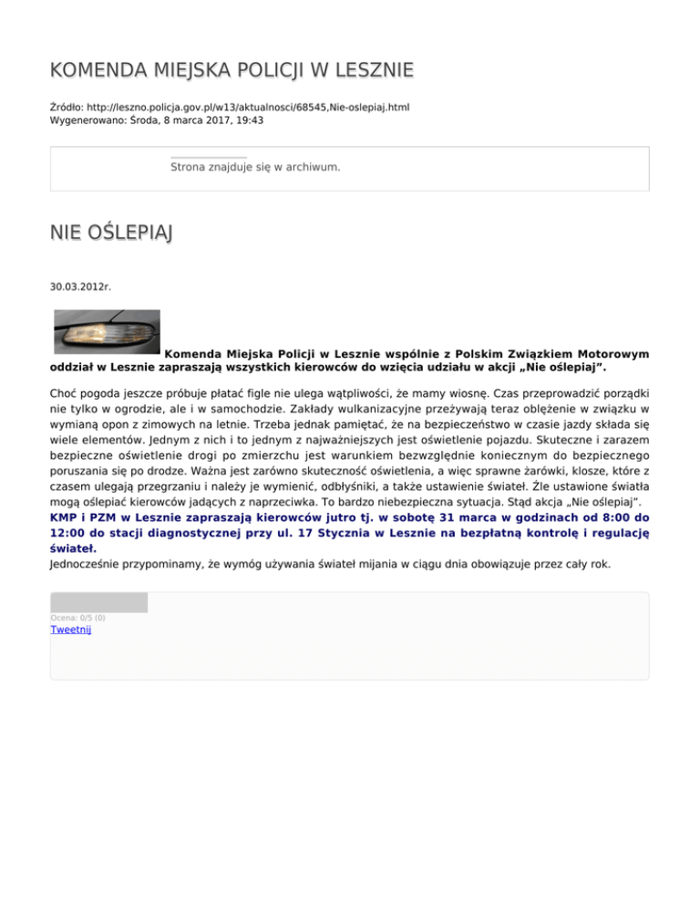 KOMENDA MIEJSKA POLICJI W LESZNIE Źródło: http://leszno.policja.gov.pl/w13/aktualnosci/68545,Nie-oslepiaj.html Wygenerowano: Środa, 8 marca 2017, 19:43 Strona znajduje się w archiwum. NIE OŚLEPIAJ 30.03.2012r. Komenda Miejska Policji w Lesznie wspólnie z Polskim Związkiem Motorowym oddział w Lesznie zapraszają wszystkich kierowców do wzięcia udziału w akcji „Nie oślepiaj”. Choć pogoda jeszcze próbuje płatać figle nie ulega wątpliwości, że mamy wiosnę. Czas przeprowadzić porządki nie tylko w ogrodzie, ale i w samochodzie. Zakłady wulkanizacyjne przeżywają teraz oblężenie w związku w wymianą opon z zimowych na letnie. Trzeba jednak pamiętać, że na bezpieczeństwo w czasie jazdy składa się wiele elementów. Jednym z nich i to jednym z najważniejszych jest oświetlenie pojazdu. Skuteczne i zarazem bezpieczne oświetlenie drogi po zmierzchu jest warunkiem bezwzględnie koniecznym do bezpiecznego poruszania się po drodze. Ważna jest zarówno skuteczność oświetlenia, a więc sprawne żarówki, klosze, które z czasem ulegają przegrzaniu i należy je wymienić, odbłyśniki, a także ustawienie świateł. Źle ustawione światła mogą oślepiać kierowców jadących z naprzeciwka. To bardzo niebezpieczna sytuacja. Stąd akcja „Nie oślepiaj”. KMP i PZM w Lesznie zapraszają kierowców jutro tj. w sobotę 31 marca w godzinach od 8:00 do 12:00 do stacji diagnostycznej przy ul. 17 Stycznia w Lesznie na bezpłatną kontrolę i regulację świateł. Jednocześnie przypominamy, że wymóg używania świateł mijania w ciągu dnia obowiązuje przez cały rok. Ocena: 0/5 (0) Tweetnij