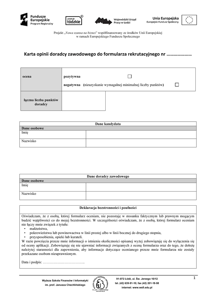Projekt „Nowa szansa na biznes” współfinansowany ze środków Unii Europejskiej w ramach Europejskiego Funduszu Społecznego Karta opinii doradcy zawodowego do formularza rekrutacyjnego nr ………………… ocena pozytywna negatywna (nieuzyskanie wymagalnej minimalnej liczby punktów) łączna liczba punktów doradcy Dane kandydata Dane osobowe Imię Nazwisko Dane doradcy zawodowego Dane osobowe Imię Nazwisko Deklaracja bezstronności i poufności Oświadczam, że z osobą, której formularz oceniam, nie pozostaję w stosunku faktycznym lub prawnym mogącym budzić wątpliwości co do mojej bezstronności. W szczególności oświadczam, że z osobą, której formularz oceniam nie łączy mnie związek z tytułu: • małżeństwa, • pokrewieństwa lub powinowactwa w linii prostej albo w linii bocznej do drugiego stopnia, • przysposobienia, opieki lub kurateli. W razie powzięcia przeze mnie informacji o istnieniu okoliczności opisanej wyżej zobowiązuję się do wyłączenia się od oceny aplikacji. Zobowiązuję się nie ujawniać informacji związanych z oceną formularza oraz do tego, że dołożę należytej staranności dla zapewnienia, aby informacje dotyczące ocenianego przeze mnie formularza nie zostały przekazane osobom nieuprawnionym. Data i podpis: …………………………….. Wyższa Szkoła Finansów i Informatyki im. prof. Janusza Chechlińskiego 91-072 Łódź, ul. Św. Jerzego 10/12 tel. (42) 639-91-10; fax (42) 201-18-58 internet: www.wsfi.edu.pl 1 Projekt „Nowa szansa na biznes” współfinansowany ze środków Unii Europejskiej w ramach Europejskiego Funduszu Społecznego OPINIA DORADCY ZAWODOWEGO a) predyspozycje zawodowe kandydata Ocena (0 – 10 pkt, min. 6 na ocenę pozytywną) …. ….. pkt Uzasadnienie (przynajmniej 5 zdań) b) cechy przedsiębiorcze kandydata Ocena (0 – 20 pkt, min. 12 na ocenę pozytywną) …. ….. pkt Uzasadnienie (przynajmniej 5 zdań) c) motywacja do prowadzenia działalności gospodarczej Ocena (0 – 10 pkt, min. 6na ocenę pozytywną) …. ….. pkt Uzasadnienie (przynajmniej 5 zdań) ______________ data Wyższa Szkoła Finansów i Informatyki im. prof. Janusza Chechlińskiego _______________ podpis 91-072 Łódź, ul. Św. Jerzego 10/12 tel. (42) 639-91-10; fax (42) 201-18-58 internet: www.wsfi.edu.pl 2