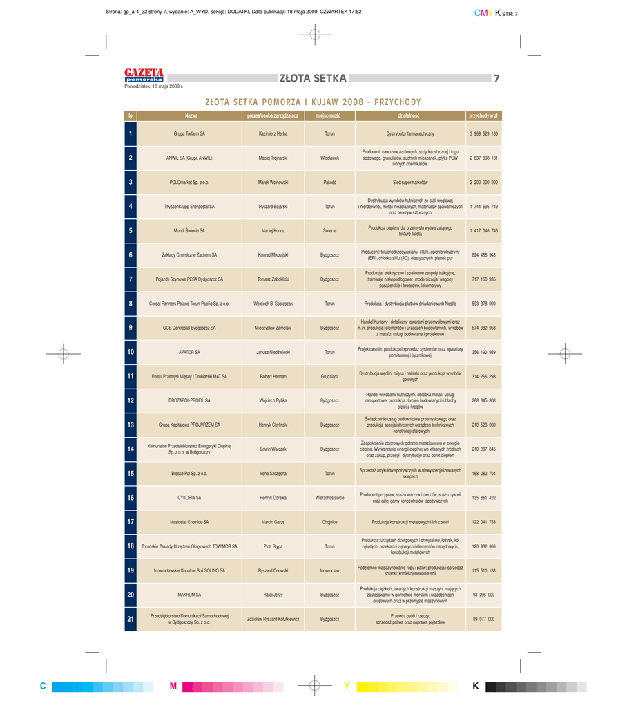 CMY K STR: 7 Strona: gp_a-4_32 strony 7, wydanie: A_WYD, sekcja: DODATKI, Data publikacji: 18 maja 2009, CZWARTEK 17:52 ZdOTA SETKA 7 Poniedzia³ek, 18 maja 2009 r. ZdOTA SETKA POMORZA I KUJAW 2008 - PRZYCH ODY lp C Nazwa prezes/osoba zarz¹dzaj¹ca miejscowośæ dzia³alnośæ przychody w z³ 1 Grupa Torfarm SA Kazimierz Herba Toruñ Dystrybutor farmaceutyczny 3 969 629 186 2 ANWIL SA (Grupa ANWIL) Maciej Trojnarski W³oc³awek Producent: nawozów azotowych, sody kaustycznej i ³ugu sodowego, granulatów, suchych mieszanek, p³yt z PCW i innych chemikaliów. 2 837 898 131 3 POLOmarket Sp. z o.o. Marek Wojnowski Pakośæ Sieæ supermarketów 2 200 000 000 4 ThyssenKrupp Energostal SA Ryszard Bojarski Toruñ Dystrybucja wyrobów hutniczych ze stali wêglowej i nierdzewnej, metali nie¿elaznych, materia³ów spawalniczych oraz tworzyw sztucznych 1 744 695 749 5 Mondi Świecie SA Maciej Kunda Świecie Produkcja papieru dla przemys³u wytwarzaj¹cego tekturê falist¹ 1 417 046 746 6 Zak³ady Chemiczne Zachem SA Konrad Miko³ajski Bydgoszcz Producent: toluenodiizocyjanianu (TDI), epichlorohydryny (EPI), chlorku allilu (AC), elastycznych pianek pur 824 488 948 7 Pojazdy Szynowe PESA Bydgoszcz SA Tomasz Zaboklicki Bydgoszcz Produkcja: elektryczne i spalinowe zespo³y trakcyjne, tramwaje niskopod³ogowe; modernizacja: wagony pasa¿erskie i towarowe, lokomotywy 717 160 935 8 Cereal Partners Poland Torun-Pacific Sp. z o.o. Wojciech B. Sobieszak Toruñ Produkcja i dystrybucja p³atków śniadaniowych Nestle 593 378 000 9 GCB Centrostal Bydgoszcz SA Mieczys³aw Zamelski Bydgoszcz Handel hurtowy i detaliczny towarami przemys³owymi oraz m.in. produkcja: elementów i urz¹dzeñ budowlanych, wyrobów z metalu; us³ugi budowlane i projektowe 574 382 958 10 APATOR SA Janusz Niedźwiecki Toruñ Projektowanie, produkcja i sprzeda¿ systemów oraz aparatury pomiarowej i ³¹cznikowej 356 190 989 11 Polski Przemys³ Miêsny i Drobiarski MAT SA Robert Hetman Grudzi¹dz Dystrybucja wêdlin, miêsa i nabia³u oraz produkcja wyrobów gotowych 314 266 298 12 DROZAPOL-PROFIL SA Wojciech Rybka Bydgoszcz Handel wyrobami hutniczymi, obróbka metali, us³ugi transportowe, produkcja zbrojeñ budowlanych i blachy ciêtej z krêgów 268 345 308 13 Grupa Kapita³owa PROJPRZEM SA Henryk Chyliñski Bydgoszcz Świadczenie us³ug budownictwa przemys³owego oraz produkcja specjalistycznych urz¹dzeñ technicznych i konstrukcji stalowych 210 523 000 14 Komunalne Przedsiêbiorstwo Energetyki Cieplnej Sp. z o.o. w Bydgoszczy Edwin Warczak Bydgoszcz Zaspokojenie zbiorowych potrzeb mieszkanców w energiê ciepln¹. Wytwarzanie energii cieplnej we w³asnych źród³ach oraz zakup, przesy³ i dystrybucje oraz obrót ciep³em 210 387 845 15 Bresse Pol Sp. z o.o. Irena Szczêsna Toruñ Sprzeda¿ artyku³ów spo¿ywczych w niewyspecjalizowanych sklepach 168 082 704 16 CYKORIA SA Henryk Dorawa Wierzchos³awice Producent przypraw, suszu warzyw i owoców, suszu cykorii oraz ca³ej gamy koncentratów spo¿ywczych 135 851 422 17 Mostostal Chojnice SA Marcin Garus Chojnice Produkcja konstrukcji metalowych i ich cześci 122 041 753 18 Toruñskie Zak³ady Urz¹dzeñ Okrêtowych TOWIMOR SA Piotr Stypa Toruñ Produkcja: urz¹dzeñ dźwigowych i chwytaków, ³o¿ysk, kó³ zêbatych, przek³adni zêbatych i elementów napêdowych, konstrukcji metalowych 120 932 966 19 Inowroc³awskie Kopalnie Soli SOLINO SA Ryszard Or³owski Inowroc³aw Podziemne magazynowanie ropy i paliw; produkcja i sprzeda¿ solanki; konfekcjonowanie soli 115 510 188 20 MAKRUM SA Rafa³ Jerzy Bydgoszcz Produkcja ciê¿kich, zwartych konstrukcji maszyn, maj¹cych zastosowanie w górnictwie morskim i urz¹dzeniach okrêtowych oraz w przemyśle maszynowym 93 296 000 21 Przedsiêbiorstwo Komunikacji Samochodowej w Bydgoszczy Sp. z o.o. Zdzis³aw Ryszard Ko³utkiewicz Bydgoszcz Przewóz osób i rzeczy; sprzeda¿ paliwa oraz naprawa pojazdów 89 077 000 M Y K
