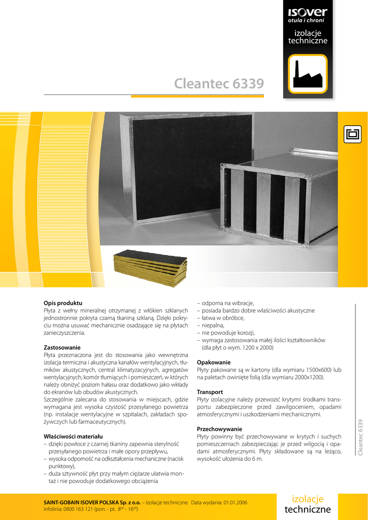 izolacje techniczne Cleantec 6339 Zastosowanie Płyta przeznaczona jest do stosowania jako wewnętrzna izolacja termiczna i akustyczna kanałów wentylacyjnych, tłumików akustycznych, central klimatyzacyjnych, agregatów wentylacyjnych, komór tłumiących i pomieszczeń, w których należy obniżyć poziom hałasu oraz dodatkowo jako wkłady do ekranów lub obudów akustycznych. Szczególnie zalecana do stosowania w miejscach, gdzie wymagana jest wysoka czystość przesyłanego powietrza (np. instalacje wentylacyjne w szpitalach, zakładach spożywczych lub farmaceutycznych). Właściwości materiału –dzięki powłoce z czarnej tkaniny zapewnia sterylność przesyłanego powietrza i małe opory przepływu, –wysoka odporność na odkształcenia mechaniczne (nacisk punktowy), –duża sztywność płyt przy małym ciężarze ułatwia montaż i nie powoduje dodatkowego obciążenia –odporna na wibracje, –posiada bardzo dobre właściwości akustyczne –łatwa w obróbce, –niepalna, –nie powoduje korozji, –wymaga zastosowania małej ilości kształtowników (dla płyt o wym. 1200 x 2000) Opakowanie Płyty pakowane są w kartony (dla wymiaru 1500x600) lub na paletach owinięte folią (dla wymiaru 2000x1200). Transport Płyty izolacyjne należy przewozić krytymi środkami transportu zabezpieczone przed zawilgoceniem, opadami atmosferycznymi i uszkodzeniami mechanicznymi. Przechowywanie Płyty powinny być przechowywane w krytych i suchych pomieszczeniach zabezpieczając je przed wilgocią i opadami atmosferycznymi. Płyty składowane są na leżąco, wysokość ułożenia do 6 m. SAINT-GOBAIN ISOVER POLSKA Sp. z o.o. – Izolacje techniczne. Data wydania: 01.01.2006 Infolinia: 0800 163 121 (pon. - pt. 800 - 1600) izolacje techniczne Cleantec 6339 Opis produktu Płyta z wełny mineralnej otrzymanej z włókien szklanych jednostronnie pokryta czarną tkaniną szklaną. Dzięki pokryciu można usuwać mechanicznie osadzające się na płytach zanieczyszczenia. Cleantec 6339 Dane techniczne Wymiary numer produktu 1043001 1043002 1043003 długość* [mm] 1500 1500 1500 szerokość* [mm] 600 600 600 grubość* [mm] 20 30 50 m2/opak. 18,00 12,60 7,20 1043103 2000 1200 20 1043104 2000 1200 30 1043101 2000 1200 50 1043105 2000 1200 100 Na życzenie klienta, po uzgodnieniu z producentem, dostępne są wyroby o innych wymiarach traktowane jako produkty niestandardowe * - do w/w wymiarów odnoszą się tolerancje wynikające z AT Parametry techniczne Klasyfikacja ogniowa: produkt niepalny Maksymalna temperatura stosowania: tmax = 200°C (od strony wełny) tmax = 60°C (od strony tkaniny) Gęstość objętościowa: 35/45** kg/m3 72,00 96,00 57,60 28,80 Dopuszczenia Aprobata techniczna AT/2006-02-1578 Atest higieniczny PZH: HK/B/0010/03/2006 ** - do w/w gęstości odnoszą się tolerancje wynikające z AT Współczynnik przewodzenia ciepła λ w zależności od średniej temperatury izolacji tśr [oC] λ [W/mK] Cleantec 6339 10 0,033 50 0,038 Cleantec 6339 λ [W/mK] 0.07 100 0,048 200 0,068 0.06 0.05 0.04 0.03 αw 30 50 100 0,6 (H) 0,9 (L) 0,9 (L) Współczynnik pochłaniania dźwięku αp 125 Hz 250 Hz 500 Hz 1000 Hz 2000 Hz 4000 Hz 0,15 0,20 0,65 0,30 0,60 1,00 10 50 αp Właściwości akustyczne Grubość [mm] tśr [oC] 0,70 1,00 1,00 0,80 0,90 0,90 0,85 0,90 0,85 0,85 0,80 0,85 100 150 200 Cleantec 6339 1.0 0.8 0.6 0.4 (grubość 30 mm) (grubość 50 mm) (grubość 100 mm) Hz 0.2 0.0 0 250 1000 125 500 2000 3000 4000 Cleantec 6339 Właściwości areodynamiczne Strata ciśnienia w funkcji objętościowego natężenia przepływu Δpel[Pa] 22 18 14 10 6 2 0 qv[m3/s] 0 1 2 izolacje techniczne 3 4 5 6 SAINT-GOBAIN ISOVER POLSKA Sp. z o.o. – Izolacje techniczne. Data wydania: 01.01.2006 Infolinia: 0800 163 121 (pon. - pt. 800 - 1600)