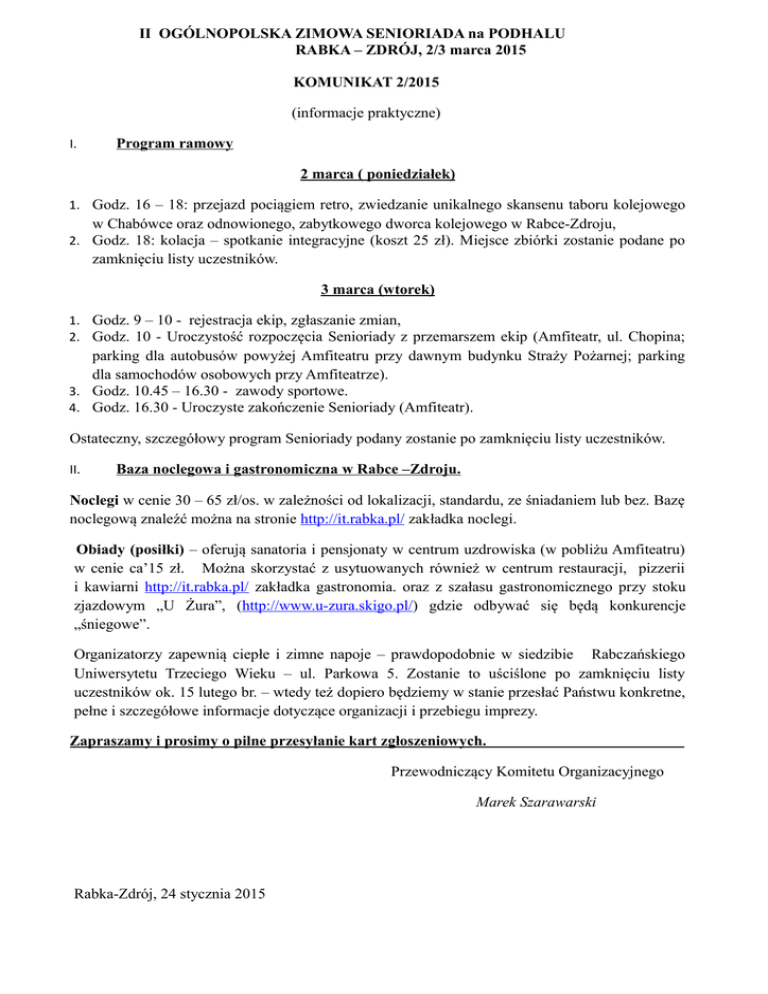 II OGÓLNOPOLSKA ZIMOWA SENIORIADA na PODHALU RABKA – ZDRÓJ, 2/3 marca 2015 KOMUNIKAT 2/2015 (informacje praktyczne) I. Program ramowy 2 marca ( poniedziałek) 1. Godz. 16 – 18: przejazd pociągiem retro, zwiedzanie unikalnego skansenu taboru kolejowego w Chabówce oraz odnowionego, zabytkowego dworca kolejowego w Rabce-Zdroju, 2. Godz. 18: kolacja – spotkanie integracyjne (koszt 25 zł). Miejsce zbiórki zostanie podane po zamknięciu listy uczestników. 3 marca (wtorek) 1. Godz. 9 – 10 - rejestracja ekip, zgłaszanie zmian, 2. Godz. 10 - Uroczystość rozpoczęcia Senioriady z przemarszem ekip (Amfiteatr, ul. Chopina; parking dla autobusów powyżej Amfiteatru przy dawnym budynku Straży Pożarnej; parking dla samochodów osobowych przy Amfiteatrze). 3. Godz. 10.45 – 16.30 - zawody sportowe. 4. Godz. 16.30 - Uroczyste zakończenie Senioriady (Amfiteatr). Ostateczny, szczegółowy program Senioriady podany zostanie po zamknięciu listy uczestników. II. Baza noclegowa i gastronomiczna w Rabce –Zdroju. Noclegi w cenie 30 – 65 zł/os. w zależności od lokalizacji, standardu, ze śniadaniem lub bez. Bazę noclegową znaleźć można na stronie http://it.rabka.pl/ zakładka noclegi. Obiady (posiłki) – oferują sanatoria i pensjonaty w centrum uzdrowiska (w pobliżu Amfiteatru) w cenie ca’15 zł. Można skorzystać z usytuowanych również w centrum restauracji, pizzerii i kawiarni http://it.rabka.pl/ zakładka gastronomia. oraz z szałasu gastronomicznego przy stoku zjazdowym „U Żura”, (http://www.u-zura.skigo.pl/) gdzie odbywać się będą konkurencje „śniegowe”. Organizatorzy zapewnią ciepłe i zimne napoje – prawdopodobnie w siedzibie Rabczańskiego Uniwersytetu Trzeciego Wieku – ul. Parkowa 5. Zostanie to uściślone po zamknięciu listy uczestników ok. 15 lutego br. – wtedy też dopiero będziemy w stanie przesłać Państwu konkretne, pełne i szczegółowe informacje dotyczące organizacji i przebiegu imprezy. Zapraszamy i prosimy o pilne przesyłanie kart zgłoszeniowych. Przewodniczący Komitetu Organizacyjnego Marek Szarawarski Rabka-Zdrój, 24 stycznia 2015