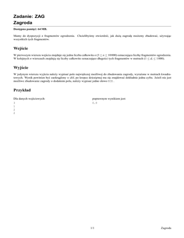 Zadanie: ZAG Zagroda Dost˛epna pami˛eć: 64 MB. Mamy do dyspozycji n fragmentów ogrodzenia. Chcielibyśmy stwierdzić, jak duża˛ zagrod˛e możemy zbudować, używajac ˛ wszystkich tych fragmentów. Wejście W pierwszym wierszu wejścia znajduje si˛e jedna liczba całkowita n (3 ≤ n ≤ 10 000) oznaczajaca ˛ liczb˛e fragmentów ogrodzenia. W kolejnych n wierszach znajduja˛ si˛e liczby całkowite oznaczajace ˛ długości tych fragmentów w metrach (1 ≤ di ≤ 1 000). Wyjście W jedynym wierszu wyjścia należy wypisać pole najwi˛ekszej możliwej do zbudowania zagrody, wyrażone w metrach kwadratowych. Wynik powinien być zaokraglony ˛ w dół, po kropce dziesi˛etnej ma si˛e znajdować dokładnie jedna cyfra. Jeżeli nie jest możliwe zbudowanie zagrody o dodatnim polu, należy wypisać jedno słowo NIE . Przykład Dla danych wejściowych: 3 1 2 2 poprawnym wynikiem jest: 0.9 1/1 Zagroda