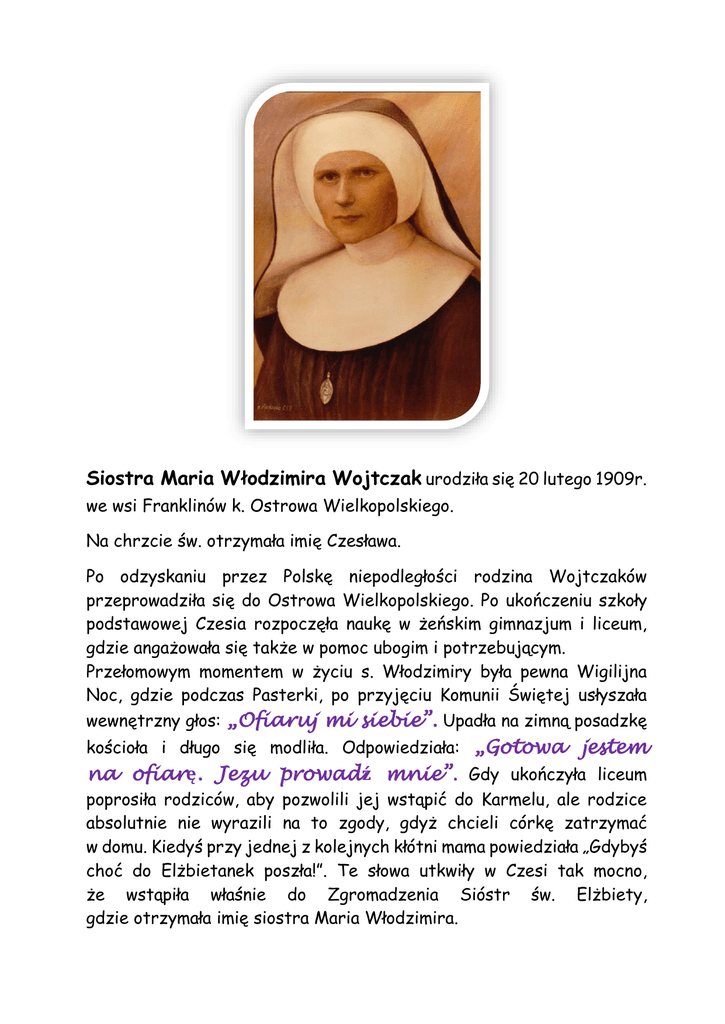 Siostra Maria Włodzimira Wojtczak urodziła się 20 lutego 1909r. we wsi Franklinów k. Ostrowa Wielkopolskiego. Na chrzcie św. otrzymała imię Czesława. Po odzyskaniu przez Polskę niepodległości rodzina Wojtczaków przeprowadziła się do Ostrowa Wielkopolskiego. Po ukończeniu szkoły podstawowej Czesia rozpoczęła naukę w żeńskim gimnazjum i liceum, gdzie angażowała się także w pomoc ubogim i potrzebującym. Przełomowym momentem w życiu s. Włodzimiry była pewna Wigilijna Noc, gdzie podczas Pasterki, po przyjęciu Komunii Świętej usłyszała wewnętrzny głos: „Ofiaruj mi siebie”. Upadła na zimną posadzkę kościoła i długo się modliła. Odpowiedziała: „Gotowa jestem na ofiarę. Jezu prowadź mnie”. Gdy ukończyła liceum poprosiła rodziców, aby pozwolili jej wstąpić do Karmelu, ale rodzice absolutnie nie wyrazili na to zgody, gdyż chcieli córkę zatrzymać w domu. Kiedyś przy jednej z kolejnych kłótni mama powiedziała „Gdybyś choć do Elżbietanek poszła!”. Te słowa utkwiły w Czesi tak mocno, że wstąpiła właśnie do Zgromadzenia Sióstr św. Elżbiety, gdzie otrzymała imię siostra Maria Włodzimira. Wraz z nastaniem wojny Siostry Elżbietanki zostały rozproszone. Część znalazła się w obozach, pozostałe musiały chodzić w ubraniach cywilnych, miały zakaz używania strojów zakonnych. Siostra Włodzimira z coraz bardziej postępującą gruźlicą została oddelegowana do domu. W tej samej kamienicy co Wojtczakowie, mieszkanie zajęła rodzina niemiecka. Gdy dowiedzieli się o chorej, sprawili, że znalazła się w domu starców. To tam spędziła swoje ostatnie chwile życia. Podczas choroby siostra Włodzimira pisała pamiętnik, który niestety zaginął. Pisała go dla swojej mamy, aby nieść jej pociechę, gdy jej już nie będzie. Ze świadectw tych, którzy go czytali wiemy, że był wyznaniem miłości do Jezusa i odsłaniał głębię jej życia wewnętrznego. Znalazły się w nim także słowa, które skierowała do Jezusa w dniu swojej pierwszej profesji zakonnej, by mogła umrzeć zapomniana i wzgardzona tak jak On. I takie właśnie były ostatnie dni jej życia. Krótkie odwiedziny sióstr, obcy ludzie wokół i tylko On – Jezus. Ksiądz Zbigniew Pawlak, chrześniak siostry Włodzimiry, który czytał jej pamiętnik, zapamiętał ostatnie jego zdania umieszczone pod datą 19 lutego 1943r.: „Jutro kończę 34 lata. Jutro pójdę do mojego Jezusa. O jakże bardzo jestem szczęśliwa. Mamo, nie martw się mną. Ja zawsze będę z wami”. I tak też się stało. Zmarła następnego dnia w dniu swoich urodzin 20 lutego 1943r. Ciało Siostry Włodzimiry spoczywa na cmentarzu przy ul. Limanowskiego w Ostrowie Wlkp. Źródło: http://naszdziennik.pl/wiara-kosciol-w-polsce/77721,siostra-o-niezwyklym-sercu.html Kilka zdjęć Siostry Włodzimiry S. Włodzimira jako dziewczynka S. Włodzimira z mamą i siostrą S. Włodzimira jako uczennica gimnazjum