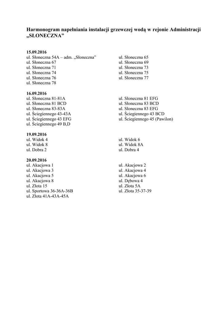 Harmonogram napełniania instalacji grzewczej wodą w rejonie Administracji „SŁONECZNA” 15.09.2016 ul. Słoneczna 54A – adm. „Słoneczna” ul. Słoneczna 67 ul. Słoneczna 71 ul. Słoneczna 74 ul. Słoneczna 76 ul. Słoneczna 78 ul. Słoneczna 65 ul. Słoneczna 69 ul. Słoneczna 73 ul. Słoneczna 75 ul. Słoneczna 77 16.09.2016 ul. Słoneczna 81-81A ul. Słoneczna 81 BCD ul. Słoneczna 83-83A ul. Ściegiennego 43-43A ul. Ściegiennego 43 EFG ul. Ściegiennego 49 B,D ul. Słoneczna 81 EFG ul. Słoneczna 83 BCD ul. Słoneczna 83 EFG ul. Ściegiennego 43 BCD ul. Ściegiennego 45 (Pawilon) 19.09.2016 ul. Widok 4 ul. Widok 8 ul. Dobra 2 20.09.2016 ul. Akacjowa 1 ul. Akacjowa 3 ul. Akacjowa 5 ul. Akacjowa 8 ul. Złota 15 ul. Sportowa 36-36A-36B ul. Złota 41A-43A-45A ul. Widok 6 ul. Widok 8A ul. Dobra 4 ul. Akacjowa 2 ul. Akacjowa 4 ul. Akacjowa 6 ul. Dębowa 4 ul. Złota 5A ul. Złota 35-37-39