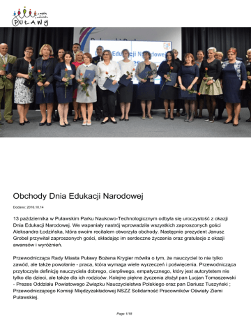 Obchody Dnia Edukacji Narodowej Dodano: 2016.10.14 13 października w Puławskim Parku Naukowo-Technologicznym odbyła się uroczystość z okazji Dnia Edukacji Narodowej. We wspaniały nastrój wprowadziła wszystkich zaproszonych gości Aleksandra Łodzińska, która swoim recitalem otworzyła obchody. Następnie prezydent Janusz Grobel przywitał zaproszonych gości, składając im serdeczne życzenia oraz gratulacje z okazji awansów i wyróżnień. Przewodnicząca Rady Miasta Puławy Bożena Krygier mówiła o tym, że nauczyciel to nie tylko zawód, ale także powołanie - praca, która wymaga wiele wyrzeczeń i poświęcenia. Przewodnicząca przytoczyła definicję nauczyciela dobrego, cierpliwego, empatycznego, który jest autorytetem nie tylko dla dzieci, ale także dla ich rodziców. Kolejne piękne życzenia złożył pan Lucjan Tomaszewski - Prezes Oddziału Powiatowego Związku Nauczycielstwa Polskiego oraz pan Dariusz Tuszyński ; Przewodniczącego Komisji Międzyzakładowej NSZZ Solidarność Pracowników Oświaty Ziemi Puławskiej. Page 1/18 W części oficjalnej uroczystości uhonorowano i wyróżniono nauczycieli pracujących w Puławskich placówkach oświatowych: Nagrodą Prezydenta Miasta Puławy uhonorowanych zostało 25 osób: Pani Agnieszka Czarnota ; nauczyciel matematyki i informatyki w SP nr 10, Pan Zbigniew Dors ; nauczyciel wychowania fizycznego w SP nr 11, Pani Sabina Gorgol ; nauczyciel wychowania przedszkolnego w MP nr 10, Pani Janina Jaworska ; nauczyciel wychowania przedszkolnego w MP nr 8, Pani Sylwia Kapłon ; nauczyciel języka angielskiego w SP nr 3, Pani Urszula Karska - Wnuk ; nauczyciel języka niemieckiego w ZSO nr 1, Pani Agnieszka Kruk ; nauczyciel wychowania fizycznego w SP nr 1, Pani Bożena Krygier ; nauczyciel edukacji wczesnoszkolnej w SP nr 11, Pani Jolanta Lewandowska ; nauczyciel fizyki w ZSO nr 1, Pan Radosław Łysiak - nauczyciel geografii w ZSO nr 1, Pani Dorota Matras ; nauczyciel wychowania przedszkolnego w MP nr 3, Pani Grażyna Miturska ; dyrektor MP nr 15, Pani Anna Sonia Nowosadzka - nauczyciel języka angielskiego w ZSO nr 2, Pani Małgorzata Pakuła ; dyrektor SP nr 1, Pani Elżbieta Pietrusik ; nauczyciel języka polskiego oraz historii i społeczeństwa w SP nr 4, Pan Radosław Poświatowski ; nauczyciel wychowania fizycznego w SP nr 3, Pani Iza Rodak ; Szymańska ; logopeda w Publicznym Przedszkolu Integracyjnym Pani Anna Różycka ; nauczyciel wychowania przedszkolnego w MP nr 7, Pan Leszek Rukasz ; nauczyciel geografii w ZSO nr 1, Pani Edyta Skoczek ; nauczyciel informatyki w SP nr 4, Pani Aneta Sosik ; nauczyciel języka polskiego w SP nr 3, Pani Marzanna Stateczna ; nauczyciel wychowania przedszkolnego w MP nr 14, Pani Anna Wąsik ; nauczyciel biologii w ZSO nr 1, Pani Anna Wicha ; nauczyciel języka angielskiego w SP nr 1, Pani Urszula Zdrodowska ; nauczyciel fizyki, informatyki i techniki w PG nr 1. Tytuł nauczyciela dyplomowanego uzyskali: Pani Gabriela Pioterczak - nauczyciel wych. przedszkolnego MP 2 Pani Małgorzata Teresa Solis - nauczyciel wych. przedszkolnego MP 5, Page 2/18 Pani Sabina Gorgol- nauczyciel wych. przedszkolnego MP 10, Pani Justyna Jeżak obecny dyrektor i nauczyciel wych. przedszkolnego MP 13, Pan Marcin Jacek Mitruczuk ; nauczyciel historii, bibliotekarz SP 3, Pani Sabina Poświatowska - nauczyciel matematyki SP 3, Pani Edyta Szlendak - logopeda SP 4, Pani Hanna Błaszczak - nauczyciel edukacji wczesnoszkolnej SP 10, Pani Anna Daniszewska - nauczyciel edukacji wczesnoszkolnej SP 11, Pan Wojciech Jerzy Białek - nauczyciel wychowania fizycznego SP 11, Pani Agnieszka Anna Anioł-Sadurska- nauczyciel chemii PG 1, Pani Anna Helena Orkiszewska- nauczyciel języka polskiego PG 1, Pan Maciej Abramek - pedagog ZSO 1, Pan Arkadiusz Sławomir Burek - nauczyciel wychowania fizycznego ZSO 1, Pan Jakub Mieczysław Toporowicz ; nauczyciel języka angielskiego ZSO 1, Pani Jolanta Anna Lewandowska - nauczyciel fizyki ZSO 1, Pani Emilia Piaseczna - nauczyciel języka angielskiego ZSO 2, Pani Agata Łysiak ; nauczyciel języka niemieckiego ZSO 2. Medalem Komisji Edukacji Narodowej uhonorowani zostali: Pani Aneta Barbara Drzazga - Zespół Szkół Ogólnokształcących nr 2, Pani Teresa Bożena Frydrych - Zespół Szkół Ogólnokształcących nr 1, Pani Marzena Katarzyna Górecka - Zespół Szkół Ogólnokształcących nr 2, Pan Radosław Łysiak - Zespół Szkół Ogólnokształcących nr 1, Pan Dariusz Matysiak - Zespół Szkół Ogólnokształcących nr 2, Pan Antoni Mocarski - Zespół Szkół Ogólnokształcących nr 2, Pani Marzenna Syta - Zespół Szkół Ogólnokształcących nr 1, Pani Urszula Maria Zdrodowska - Publiczne Gimnazjum nr Złoty Medal za Długoletnią Służbę otrzymali: Pani Bożena Kowalska - Szkoła Podstawowa nr 10, Pan Andrzej Osiak - Zespół Szkół Ogólnokształcących nr 1, Pani Janina Rułka - Zespół Szkół Ogólnokształcących nr 2, Pani Joanna Rymkiewicz - Szkoła Podstawowa nr 1, Pani Anna Słodek - Szkoła Podstawowa nr 6, Pani Małgorzata Anna Stachnio - Publiczne Gimnazjum nr 1, Page 3/18 Pani Halina Zofia Szmyrgałło - Szkoła Podstawowa nr 1, Pan Andrzej Śliwa - Szkoła Podstawowa nr 1. Srebrny Medal za Długoletnią Służbę otrzymali: Pani Agnieszka Renata Kruk - Szkoła Podstawowa nr 1, Pani Maria Henryka Odzioba-Matras - Szkoła Podstawowa nr 3, Pani Renata Teresa Szelewicka - Karolik Szkoła Podstawowa nr 2, Pani Jolanta Elżbieta Węglińska - Szkoła Podstawowa nr 1, Pani Grażyna Wiejak - Zespół Szkół Ogólnokształcących nr 2. Nagrodę Lubelskiego Kuratora Oświaty otrzymały: Janina Mazurkiewicz - Szkoła Podstawowa nr 4, Bożena Strzelecka - Zespół Szkół Ogólnokształcących nr 2, Renata Teresa Szelewicka - Karolik - Szkoła Podstawowa nr 2. LAUREACI "SYBILLI NAUKOWEJ,, w roku szkolnym 2015/2016: Imię Nazwisko Szkoła Page 4/18 Tytuł Imię i nazwisko opiekuna Julia Siwek SP 1 laureatka konkursu ortograficznego Krystyna Czech laureatka kon
