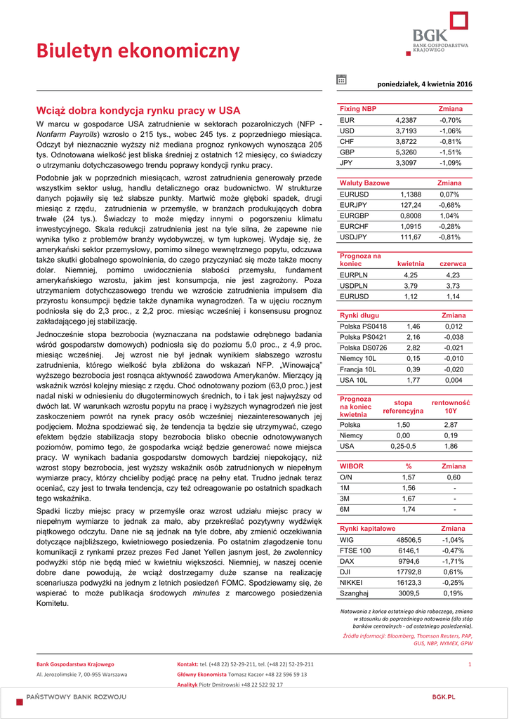 Biuletyn ekonomiczny poniedziałek, 4 kwietnia 2016 Wciąż dobra kondycja rynku pracy w USA W marcu w gospodarce USA zatrudnienie w sektorach pozarolniczych (NFP Nonfarm Payrolls) wzrosło o 215 tys., wobec 245 tys. z poprzedniego miesiąca. Odczyt był nieznacznie wyższy niż mediana prognoz rynkowych wynosząca 205 tys. Odnotowana wielkość jest bliska średniej z ostatnich 12 miesięcy, co świadczy o utrzymaniu dotychczasowego trendu poprawy kondycji rynku pracy. Podobnie jak w poprzednich miesiącach, wzrost zatrudnienia generowały przede wszystkim sektor usług, handlu detalicznego oraz budownictwo. W strukturze danych pojawiły się też słabsze punkty. Martwić może głęboki spadek, drugi miesiąc z rzędu, zatrudnienia w przemyśle, w branżach produkujących dobra trwałe (24 tys.). Świadczy to może między innymi o pogorszeniu klimatu inwestycyjnego. Skala redukcji zatrudnienia jest na tyle silna, że zapewne nie wynika tylko z problemów branży wydobywczej, w tym łupkowej. Wydaje się, że amerykański sektor przemysłowy, pomimo silnego wewnętrznego popytu, odczuwa także skutki globalnego spowolnienia, do czego przyczyniać się może także mocny dolar. Niemniej, pomimo uwidocznienia słabości przemysłu, fundament amerykańskiego wzrostu, jakim jest konsumpcja, nie jest zagrożony. Poza utrzymaniem dotychczasowego trendu we wzroście zatrudnienia impulsem dla przyrostu konsumpcji będzie także dynamika wynagrodzeń. Ta w ujęciu rocznym podniosła się do 2,3 proc., z 2,2 proc. miesiąc wcześniej i konsensusu prognoz zakładającego jej stabilizację. Jednocześnie stopa bezrobocia (wyznaczana na podstawie odrębnego badania wśród gospodarstw domowych) podniosła się do poziomu 5,0 proc., z 4,9 proc. miesiąc wcześniej. Jej wzrost nie był jednak wynikiem słabszego wzrostu zatrudnienia, którego wielkość była zbliżona do wskazań NFP. „Winowajcą” wyższego bezrobocia jest rosnąca aktywność zawodowa Amerykanów. Mierzący ją wskaźnik wzrósł kolejny miesiąc z rzędu. Choć odnotowany poziom (63,0 proc.) jest nadal niski w odniesieniu do długoterminowych średnich, to i tak jest najwyższy od dwóch lat. W warunkach wzrostu popytu na pracę i wyższych wynagrodzeń nie jest zaskoczeniem powrót na rynek pracy osób wcześniej niezainteresowanych jej podjęciem. Można spodziewać się, że tendencja ta będzie się utrzymywać, czego efektem będzie stabilizacja stopy bezrobocia blisko obecnie odnotowywanych poziomów, pomimo tego, że gospodarka wciąż będzie generować nowe miejsca pracy. W wynikach badania gospodarstw domowych bardziej niepokojący, niż wzrost stopy bezrobocia, jest wyższy wskaźnik osób zatrudnionych w niepełnym wymiarze pracy, którzy chcieliby podjąć pracę na pełny etat. Trudno jednak teraz oceniać, czy jest to trwała tendencja, czy też odreagowanie po ostatnich spadkach tego wskaźnika. Spadki liczby miejsc pracy w przemyśle oraz wzrost udziału miejsc pracy w niepełnym wymiarze to jednak za mało, aby przekreślać pozytywny wydźwięk piątkowego odczytu. Dane nie są jednak na tyle dobre, aby zmienić oczekiwania dotyczące najbliższego, kwietniowego posiedzenia. Po ostatnim złagodzenie tonu komunikacji z rynkami przez prezes Fed Janet Yellen jasnym jest, że zwolennicy podwyżki stóp nie będą mieć w kwietniu większości. Niemniej, w naszej ocenie dobre dane powodują, że wciąż dostrzegamy duże szanse na realizację scenariusza podwyżki na jednym z letnich posiedzeń FOMC. Spodziewamy się, że wspierać to może publikacja środowych minutes z marcowego posiedzenia Komitetu. Fixing NBP Zmiana EUR 4,2387 -0,70% USD 3,7193 -1,06% CHF 3,8722 -0,81% GBP 5,3260 -1,51% JPY 3,3097 -1,09% Waluty Bazowe Zmiana EURUSD 1,1388 0,07% EURJPY 127,24 -0,68% EURGBP 0,8008 1,04% EURCHF 1,0915 -0,28% USDJPY 111,67 -0,81% Prognoza na koniec kwietnia czerwca EURPLN 4,25 4,23 USDPLN 3,79 3,73 EURUSD 1,12 1,14 Rynki długu Zmiana Polska PS0418 1,46 0,012 Polska PS0421 2,16 -0,038 Polska DS0726 2,82 -0,021 Niemcy 10L 0,15 -0,010 Francja 10L 0,39 -0,020 USA 10L 1,77 0,004 Prognoza na koniec kwietnia Polska stopa referencyjna rentowność 10Y 1,50 2,87 0,00 0,19 0,25-0,5 1,86 Niemcy USA WIBOR % Zmiana O/N 1,57 0,60 1M 1,56 - 3M 1,67 - 6M 1,74 - Rynki kapitałowe Zmiana WIG 48506,5 -1,04% FTSE 100 6146,1 -0,47% DAX 9794,6 -1,71% DJI 17792,8 0,61% NIKKEI 16123,3 -0,25% Szanghaj 3009,5 0,19% Notowania z końca ostatniego dnia roboczego, zmiana w stosunku do poprzedniego notowania (dla stóp banków centralnych - od ostatniego posiedzenia). Źródła informacji: Bloomberg, Thomson Reuters, PAP, GUS, NBP, NYMEX, GPW Bank Gospodarstwa Krajowego Kontakt: tel. (+48 22) 52-29-211, tel. (+48 22) 52-29-211 Al. Jerozolimskie 7, 00-955 Warszawa Główny Ekonomista Tomasz Kaczor +48 22 596 59 13 Analityk Piotr Dmitrowski +48 22 522 92 17 1 Biuletyn ekonomiczny poniedziałek, 4 kwietnia 2016 PMI najwyżej od 8 miesięcy Piątkowy odczyt PMI dla polskiego przemysłu był kolejnym pozytywnym sygnałem z tego sektora gospodarki. Indeks wzrósł do poziomu 53,8 pkt. w marcu z 52,8 pkt. w lutym. O ile sam jego wzrost, po dobrych publikacjach GUS (SI) oraz KE(ESI), nie jest zaskoczeniem, o tyle skala wzrostu już tak. Trzeba podkreślić, że publikacja za marzec rozwiała wątpliwości pojawiające się przy okazji danych z poprzedniego miesiąca, że za wzrostem PMI mogą stać trudne do uwzględnienia w modelu efekty kalendarza związane z rokiem przestępnym. Wzrost indeksu w marcu wskazuje, że poprawa w poprzednich miesiącach nie była przypadkowa, a najwyższy od lata ubiegłego roku odczyt daje szansę na wiosenne przyspieszenie wzrostu gospodarczego. Struktura danych wskazuje, że za jego wzrostem stoi poprawa większości najważniejszych kategorii, a więc produkcji, nowych zamówień oraz zatrudnienia. Zwłaszcza w ostatniej kategorii poprawa jest szczególnie widoczna, gdyż jest ona na najwyższym od roku poziomie.