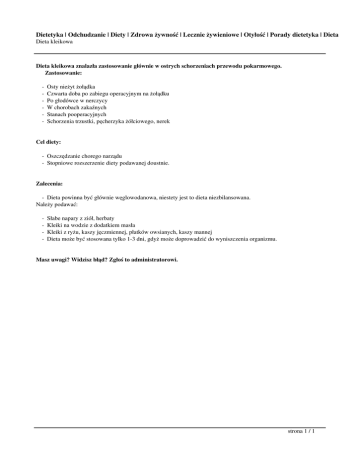 Dietetyka | Odchudzanie | Diety | Zdrowa żywność | Lecznie żywieniowe | Otyłość | Porady dietetyka | Dieta Dieta kleikowa Dieta kleikowa znalazła zastosowanie głównie w ostrych schorzeniach przewodu pokarmowego. Zastosowanie: - Osty nieżyt żołądka Czwarta doba po zabiegu operacyjnym na żołądku Po głodówce w nerczycy W chorobach zakaźnych Stanach pooperacyjnych Schorzenia trzustki, pęcherzyka żółciowego, nerek Cel diety: - Oszczędzanie chorego narządu - Stopniowe rozszerzenie diety podawanej doustnie. Zalecenia: - Dieta powinna być głównie węglowodanowa, niestety jest to dieta niezbilansowana. Należy podawać: - Słabe napary z ziół, herbaty Kleiki na wodzie z dodatkiem masła Kleiki z ryżu, kaszy jęczmiennej, płatków owsianych, kaszy mannej Dieta może być stosowana tylko 1-3 dni, gdyż może doprowadzić do wyniszczenia organizmu. Masz uwagi? Widzisz błąd? Zgłoś to administratorowi. strona 1 / 1