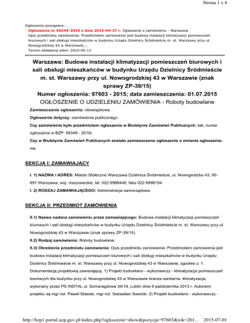 Strona 1 z 4 Ogłoszenie powiązane: Ogłoszenie nr 59349-2015 z dnia 2015-04-27 r. Ogłoszenie o zamówieniu - Warszawa Opis przedmiotu zamówienia: Przedmiotem zamówienia jest budowa instalacji klimatyzacji pomieszczeń biurowych i sali obsługi mieszkańców w budynku Urzędu Dzielnicy Śródmieście m. st. Warszawy przy ul. Nowogrodzkiej 43 w Warszawie,... Termin składania ofert: 2015-05-13 Warszawa: Budowa instalacji klimatyzacji pomieszczeń biurowych i sali obsługi mieszkańców w budynku Urzędu Dzielnicy Śródmieście m. st. Warszawy przy ul. Nowogrodzkiej 43 w Warszawie (znak sprawy ZP-39/15) Numer ogłoszenia: 97603 - 2015; data zamieszczenia: 01.07.2015 OGŁOSZENIE O UDZIELENIU ZAMÓWIENIA - Roboty budowlane Zamieszczanie ogłoszenia: obowiązkowe. Ogłoszenie dotyczy: zamówienia publicznego. Czy zamówienie było przedmiotem ogłoszenia w Biuletynie Zamówień Publicznych: tak, numer ogłoszenia w BZP: 59349 - 2015r. Czy w Biuletynie Zamówień Publicznych zostało zamieszczone ogłoszenie o zmianie ogłoszenia: nie. SEKCJA I: ZAMAWIAJĄCY I. 1) NAZWA I ADRES: Miasto Stołeczne Warszawa Dzielnica Śródmieście, ul. Nowogrodzka 43, 00691 Warszawa, woj. mazowieckie, tel. 022 6998449, faks 022 6998154. I. 2) RODZAJ ZAMAWIAJĄCEGO: Administracja samorządowa. SEKCJA II: PRZEDMIOT ZAMÓWIENIA II.1) Nazwa nadana zamówieniu przez zamawiającego: Budowa instalacji klimatyzacji pomieszczeń biurowych i sali obsługi mieszkańców w budynku Urzędu Dzielnicy Śródmieście m. st. Warszawy przy ul. Nowogrodzkiej 43 w Warszawie (znak sprawy ZP-39/15). II.2) Rodzaj zamówienia: Roboty budowlane. II.3) Określenie przedmiotu zamówienia: Opis przedmiotu zamówienia: Przedmiotem zamówienia jest budowa instalacji klimatyzacji pomieszczeń biurowych i sali obsługi mieszkańców w budynku Urzędu Dzielnicy Śródmieście m. st. Warszawy przy ul. Nowogrodzkiej 43 w Warszawie, zgodnie z: 1. Dokumentacją projektową zawierającą: 1) Projekt budowlano - wykonawczy - klimatyzacja pomieszczeń biurowych dla budynku przy ul. Nowogrodzkiej 43 w Warszawie branża sanitarna, klimatyzacja, wykonany przez PS INSTAL ul. Szmaragdowa 34/19, Lublin dnia 9 października 2013 r. Autorami projektu są mgr inż. Paweł Stasiak, mgr inż. Sebastian Sawicki. 2) Projekt budowlano - wykonawczy - http://bzp1.portal.uzp.gov.pl/index.php?ogloszenie=show&pozycja=97603&rok=201... 2015-07-01 Strona 2 z 4 klimatyzacja pomieszczeń biurowych dla budynku przy ul. Nowogrodzkiej 43 w Warszawie branża elektryczna wykonany przez PS INSTAL ul. Szmaragdowa 34/19, Lublin dnia 9 października 2013 r. Autorami projektu są mgr inż. Piotr Mucha, mgr inż. Paweł Raczyński. 3) Projekt budowlano wykonawczy - klimatyzacja pomieszczeń biurowych dla budynku przy ul. Nowogrodzkiej 43 w Warszawie branża konstrukcyjno budowlana wykonany przez PS INSTAL ul. Szmaragdowa 34/19, Lublin dnia 9 października 2013 r. Autorem projektu jest dr inż. Lech Bieńkowski. 4) Projekt budowlano wykonawczy - klimatyzacja pomieszczeń biurowych dla budynku przy ul. Nowogrodzkiej 43 w Warszawie Informacja BIOZ wykonany przez PS INSTAL ul. Szmaragdowa 34/19, Lublin dnia 9 października 2013 r. Autorzy projektu mgr inż. Paweł Stasiak, mgr inż. Sebastian Sawicki. 5) Przedmiar robót dla klimatyzacji pomieszczeń biurowych dla budynku przy ul. Nowogrodzkiej 43 w Warszawie branża sanitarna wykonany dnia 31 marca 2015 r. przez Pawła Goniprowskiego głównego specjalistę WID dla Dzielnicy Śródmieście na podstawie przedmiaru wykonanego przez PS INSTAL ul. Szmaragdowa 34/19, Lublin. 6) Przedmiar robót dla klimatyzacji pomieszczeń biurowych dla budynku przy ul. Nowogrodzkiej 43 w Warszawie branża elektryczna, wykonany przez PS INSTAL ul. Szmaragdowa 34/19, Lublin dnia 9 października 2013 r. sporządzony przez Pawła Raczyńskiego, sprawdził Piotr Mucha. 7) Przedmiar robót dla klimatyzacji pomieszczeń biurowych dla budynku przy ul. Nowogrodzkiej 43 w Warszawie roboty remontowe i renowacyjne, wykonany przez PS INSTAL ul. Szmaragdowa 34/19, Lublin dnia 7 października 2013 r. sporządzony przez Ireneusza Kopczyńskiego 2. Szczegółowa Specyfikacja techniczna wykonania i odbioru robót budowlanych ST-0 - klimatyzacja pomieszczeń biurowych dla budynku przy ul. Nowogrodzkiej 43 w Warszawie wykonany przez PS INSTAL ul. Szmaragdowa 34/19, Lublin dnia 9 października 2013 r. Autorami opracowania są mgr inż. Paweł Stasiak, mgr inż. Sebastian Sawicki. 3. Szczegółowa Specyfikacja techniczna wykonania i odbioru robót budowlanych ST-1 branża sanitarna, klimatyzacyjna dla klimatyzacji pomieszczeń biurowych dla budynku przy ul. Nowogrodzkiej 43 w Warszawie wykonany przez PS INSTAL ul. Szmaragdowa 34/19, Lublin dnia 9 października 2013 r. Autorami opracowania są mgr inż. Paweł Stasiak, mgr inż. Sebastian Sawicki. 4. Szczegółowa Specyfikacja techniczna wykonania i odbioru robót budowlanych ST-2 branża elektryczna dla klimatyzacji pomieszczeń biurowych dla budynku przy ul. Nowogrodzkiej 43 w Warszawie wykonany przez PS INSTAL ul. Szmaragdowa 34/19, Lublin dnia 9 października 2013 r. Autorami opracowania są mgr inż. Piotr Mucha, mgr inż. Paweł Raczyński. 5. Szczegółowa Specyfikacja techniczna wykonania i odbioru robót budowlanych ST-2 branża budowlana, konstrukcyjna dla klimatyzacji pomieszczeń biurowych dla budynku przy ul. Nowogrodzkiej 43 w Warszawie wykonany przez PS INSTAL ul. Szmaragdowa 34/19, Lublin dnia 9 października 2013 r. Autorem opracowania jest dr inż. Lech Bieńkowski. Ww. opracowania stanowią załącznik nr 7 do SIWZ. Zamawiający dopuszcza rozwiązania równoważne opisanym w dokumentacji projektowej oraz specyfikacji technicznej wykonania i odbioru robót. Wykonawca, który powołuje się na rozwiązania równoważne do opisanych przez Zamawiającego jest obowiązany wykazać, że oferowane przez niego http://bzp1.portal.uzp.gov.pl/index.php?ogloszenie=show&pozycja=97603&rok=201... 2015-07-01 Strona 3 z 4 