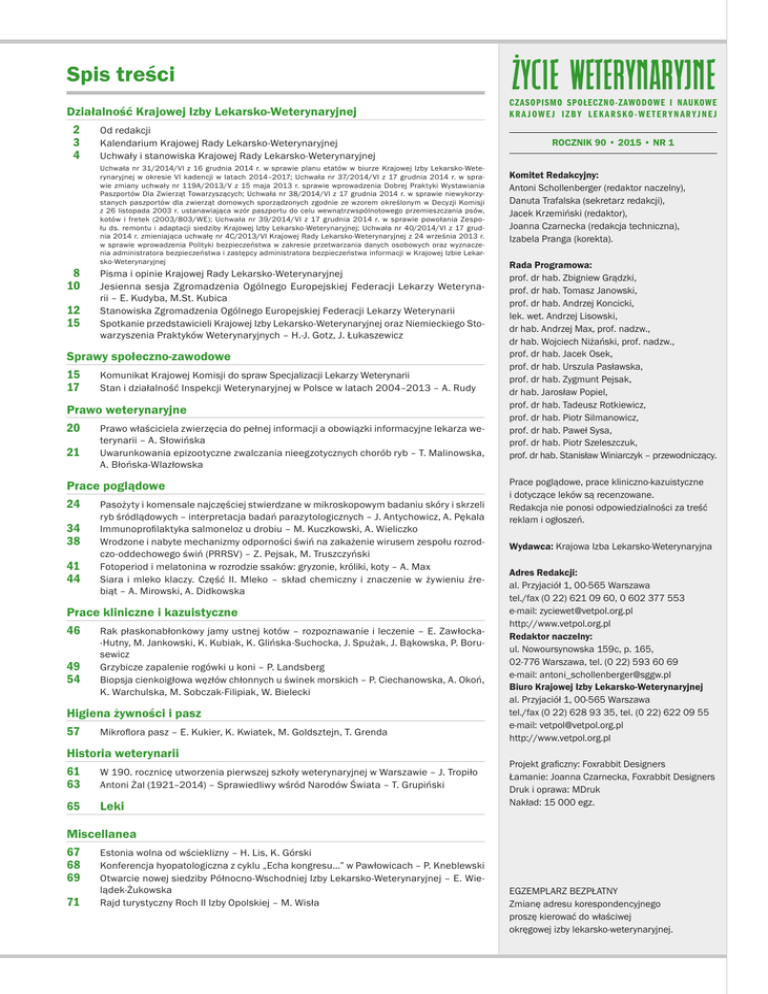 Spis treści Działalność Krajowej Izby Lekarsko-Weterynaryjnej 2Od redakcji 3Kalendarium Krajowej Rady Lekarsko-Weterynaryjnej 4Uchwały i stanowiska Krajowej Rady Lekarsko-Weterynaryjnej chwała nr 31/2014/VI z 16 grudnia 2014 r. w sprawie planu etatów w biurze Krajowej Izby Lekarsko‑WeteU rynaryjnej w okresie VI kadencji w latach 2014–2017; Uchwała nr 37/2014/VI z 17 grudnia 2014 r. w sprawie zmiany uchwały nr 119A/2013/V z 15 maja 2013 r. sprawie wprowadzenia Dobrej Praktyki Wystawiania Paszportów Dla Zwierząt Towarzyszących; Uchwała nr 38/2014/VI z 17 grudnia 2014 r. w sprawie niewykorzystanych paszportów dla zwierząt domowych sporządzonych zgodnie ze wzorem określonym w Decyzji Komisji z 26 listopada 2003 r. ustanawiająca wzór paszportu do celu wewnątrzwspólnotowego przemieszczania psów, kotów i fretek (2003/803/WE); Uchwała nr 39/2014/VI z 17 grudnia 2014 r. w sprawie powołania Zespołu ds. remontu i adaptacji siedziby Krajowej Izby Lekarsko-Weterynaryjnej; Uchwała nr 40/2014/VI z 17 grudnia 2014 r. zmieniająca uchwałę nr 4C/2013/VI Krajowej Rady Lekarsko-Weterynaryjnej z 24 września 2013 r. w sprawie wprowadzenia Polityki bezpieczeństwa w zakresie przetwarzania danych osobowych oraz wyznaczenia administratora bezpieczeństwa i zastępcy administratora bezpieczeństwa informacji w Krajowej Izbie Lekarsko-Weterynaryjnej 8Pisma i opinie Krajowej Rady Lekarsko-Weterynaryjnej 10Jesienna sesja Zgromadzenia Ogólnego Europejskiej Federacji Lekarzy Weterynarii – E. Kudyba, M.St. Kubica 12Stanowiska Zgromadzenia Ogólnego Europejskiej Federacji Lekarzy Weterynarii 15Spotkanie przedstawicieli Krajowej Izby Lekarsko-Weterynaryjnej oraz Niemieckiego Stowarzyszenia Praktyków Weterynaryjnych – H.-J. Gotz, J. Łukaszewicz Sprawy społeczno-zawodowe 15 Komunikat Krajowej Komisji do spraw Specjalizacji Lekarzy Weterynarii 17Stan i działalność Inspekcji Weterynaryjnej w Polsce w latach 2004–2013 – A. Rudy Prawo weterynaryjne 20Prawo właściciela zwierzęcia do pełnej informacji a obowiązki informacyjne lekarza weterynarii – A. Słowińska 21Uwarunkowania epizootyczne zwalczania nieegzotycznych chorób ryb – T. Malinowska, A. Błońska-Wlazłowska Prace poglądowe 24Pasożyty i komensale najczęściej stwierdzane w mikroskopowym badaniu skóry i skrzeli ryb śródlądowych – interpretacja badań parazytologicznych – J. Antychowicz, A. Pękala 34Immunoprofilaktyka salmoneloz u drobiu – M. Kuczkowski, A. Wieliczko 38Wrodzone i nabyte mechanizmy odporności świń na zakażenie wirusem zespołu rozrodczo-oddechowego świń (PRRSV) – Z. Pejsak, M. Truszczyński 41Fotoperiod i melatonina w rozrodzie ssaków: gryzonie, króliki, koty – A. Max 44Siara i mleko klaczy. Część II. Mleko – skład chemiczny i znaczenie w żywieniu źrebiąt – A. Mirowski, A. Didkowska Prace kliniczne i kazuistyczne 46Rak płaskonabłonkowy jamy ustnej kotów – rozpoznawanie i leczenie – E. Zawłocka-Hutny, M. Jankowski, K. Kubiak, K. Glińska‑Suchocka, J. Spużak, J. Bąkowska, P. Borusewicz 49Grzybicze zapalenie rogówki u koni – P. Landsberg 54Biopsja cienkoigłowa węzłów chłonnych u świnek morskich – P. Ciechanowska, A. Okoń, K. Warchulska, M. Sobczak-Filipiak, W. Bielecki Higiena żywności i pasz 57Mikroflora pasz – E. Kukier, K. Kwiatek, M. Goldsztejn, T. Grenda Historia weterynarii 61W 190. rocznicę utworzenia pierwszej szkoły weterynaryjnej w Warszawie – J. Tropiło 63Antoni Żal (1921–2014) – Sprawiedliwy wśród Narodów Świata – T. Grupiński 65Leki CZASOPISMO SPOŁECZNO-ZAWODOWE I NAUKOWE K R A J O W E J I Z B Y L E K A R S K O - W E T E R Y N A R YJ N E J ROCZNIK 90 • 2015 • NR 1 Komitet Redakcyjny: Antoni Schollenberger (redaktor naczelny), Danuta Trafalska (sekretarz redakcji), Jacek Krzemiński (redaktor), Joanna Czarnecka (redakcja techniczna), Izabela Pranga (korekta). Rada Programowa: prof. dr hab. Zbigniew Grądzki, prof. dr hab. Tomasz Janowski, prof. dr hab. Andrzej Koncicki, lek. wet. Andrzej Lisowski, dr hab. Andrzej Max, prof. nadzw., dr hab. Wojciech Niżański, prof. nadzw., prof. dr hab. Jacek Osek, prof. dr hab. Urszula Pasławska, prof. dr hab. Zygmunt Pejsak, dr hab. Jarosław Popiel, prof. dr hab. Tadeusz Rotkiewicz, prof. dr hab. Piotr Silmanowicz, prof. dr hab. Paweł Sysa, prof. dr hab. Piotr Szeleszczuk, prof. dr hab. Stanisław Winiarczyk – przewodniczący. Prace poglądowe, prace kliniczno-kazuistyczne i dotyczące leków są recenzowane. Redakcja nie ponosi odpowiedzialności za treść reklam i ogłoszeń. Wydawca: Krajowa Izba Lekarsko-Weterynaryjna Adres Redakcji: al. Przyjaciół 1, 00-565 Warszawa tel./fax (0 22) 621 09 60, 0 602 377 553 e-mail: [email protected] http://www.vetpol.org.pl Redaktor naczelny: ul. Nowoursynowska 159c, p. 165, 02-776 Warszawa, tel. (0 22) 593 60 69 e-mail: [email protected] Biuro Krajowej Izby Lekarsko-Weterynaryjnej al. Przyjaciół 1, 00-565 Warszawa tel./fax (0 22) 628 93 35, tel. (0 22) 622 09 55 e-mail: [email protected] http://www.vetpol.org.pl Projekt graficzny: Foxrabbit Designers Łamanie: Joanna Czarnecka, Foxrabbit Designers Druk i oprawa: MDruk Nakład: 15 000 egz. Miscellanea 67Estonia wolna od wścieklizny – H. Lis, K. Górski 68Konferencja hyopatologiczna z cyklu „Echa kongresu…” w Pawłowicach – P. Kneblewski 69Otwarcie nowej siedziby Północno‑Wschodniej Izby Lekarsko‑Weterynaryjnej – E. Wielądek-Żukowska 71Rajd turystyczny Roch II Izby Opolskiej – M. Wisła EGZEMPLARZ BEZPŁATNY Zmianę adresu korespondencyjnego proszę kierować do właściwej okręgowej izby lekarsko-weterynaryjnej.
