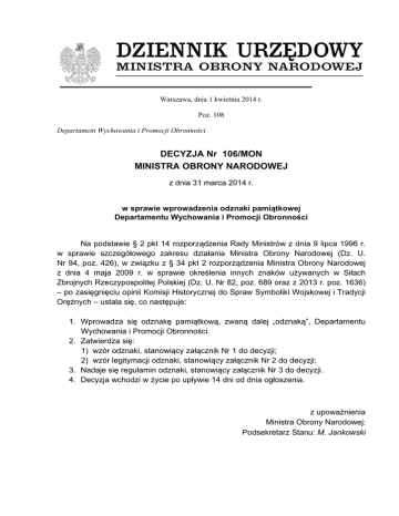 Warszawa, dnia 1 kwietnia 2014 r. Poz. 108 Departament Wychowania i Promocji Obronności DECYZJA Nr 106/MON MINISTRA OBRONY NARODOWEJ z dnia 31 marca 2014 r. w sprawie wprowadzenia odznaki pamiątkowej Departamentu Wychowania i Promocji Obronności Na podstawie § 2 pkt 14 rozporządzenia Rady Ministrów z dnia 9 lipca 1996 r. w sprawie szczegółowego zakresu działania Ministra Obrony Narodowej (Dz. U. Nr 94, poz. 426), w związku z § 34 pkt 2 rozporządzenia Ministra Obrony Narodowej z dnia 4 maja 2009 r. w sprawie określenia innych znaków używanych w Siłach Zbrojnych Rzeczypospolitej Polskiej (Dz. U. Nr 82, poz. 689 oraz z 2013 r. poz. 1636) – po zasięgnięciu opinii Komisji Historycznej do Spraw Symboliki Wojskowej i Tradycji Orężnych – ustala się, co następuje: 1. Wprowadza się odznakę pamiątkową, zwaną dalej „odznaką”, Departamentu Wychowania i Promocji Obronności. 2. Zatwierdza się: 1) wzór odznaki, stanowiący załącznik Nr 1 do decyzji; 2) wzór legitymacji odznaki, stanowiący załącznik Nr 2 do decyzji; 3. Nadaje się regulamin odznaki, stanowiący załącznik Nr 3 do decyzji. 4. Decyzja wchodzi w życie po upływie 14 dni od dnia ogłoszenia. z upoważnienia Ministra Obrony Narodowej: Podsekretarz Stanu: M. Jankowski Załączniki do decyzji Nr 106/MON Ministra Obrony Narodowej z dnia 31.03.2014 r. (poz. 108) Załącznik Nr 1 WZÓR GRAFICZNY ODZNAKI PAMIĄTKOWEJ DEPARTAMENTU WYCHOWANIA I PROMOCJI OBRONNOŚCI Załącznik Nr 2 WZÓR GRAFICZNY LEGITYMACJI ODZNAKI PAMIĄTKOWEJ DEPARTAMENTU WYCHOWANIA I PROMOCJI OBRONNOŚCI DEPARTAMENT WYCHOWANIA I PROMOCJI OBRONNOŚCI ................................................................. (stopień, imię i nazwisko) ma prawo do ODZNAKI PAMIĄTKOWEJ DEPARTAMENTU WYCHOWANIA I PROMOCJI OBRONNOŚCI Legitymacja Nr ............. Rozkaz Nr .............. z dnia ............... DYREKTOR mp. ................................... Załącznik Nr 3 REGULAMIN ODZNAKI PAMIĄTKOWEJ DEPARTAMENTU WYCHOWANIA I PROMOCJI OBRONNOŚCI 1. Odznaka pamiątkowa Departamentu Wychowania i Promocji Obronności, zwana dalej „odznaką” jest znakiem integrującym żołnierzy i pracowników Departamentu Wychowania i Promocji Obronności, zwanego dalej „DWiPO”. Stanowi ona symbol więzi z Departamentem oraz zobowiązanie do wytężonej i wzorowej służby i pracy na rzecz wychowania i promocji obronności oraz godnego reprezentowania urzędu Ministra Obrony Narodowej. 2. Odznaka pamiątkowa składa się z trzech warstw. Pierwszą warstwę stanowi otwarta księga, która symbolizuje mądrość, wiedzę i edukację. Na księgę nałożony jest stylizowany orzeł w koronie, który wzbija się do lotu z kolumny jońskiej, oplecionej wieńcem laurowym. Orzeł w koronie nawiązuje do godła państwowego oraz tradycji oręża polskiego. Kolumna jońska symbolizuje kulturę i sztukę. Wieniec laurowy jest symbolem zwycięstwa i wybitnych osiągnięć. Ostatnią warstwę stanowią skrót nazwy Departamentu Wychowani i Promocji Obronności – „DWiPO”. Całość odznaki jest wykonana z metalu oksydowanego barwy srebrzystej. Korona orła jest złota. 3. Prawo do otrzymania odznaki przysługuje: 1) Dyrektorowi DWiPO, z tytułu objęcia stanowiska służbowego; 2) żołnierzom i pracownikom Departamentu; 3) wyjątkowo – na wniosek Komisji do Spraw Odznaki Pamiątkowej, zwanej dalej „Komisją”, osobom fizycznym i prawnym szczególnie zasłużonym dla DWiPO. 4. Odznakę nadaje Dyrektor DWiPO na wniosek Komisji. Fakt nadania ogłasza się w rozkazie dziennym Dyrektora DWiPO. 5. W skład Komisji wchodzą: 1) przewodniczący: zastępca dyrektora DWiPO; 2) członkowie: a) szefowie oddziałów DWiPO; b) mąż zaufania korpusu oficerów DWiPO; c) przedstawiciel pracowników DWiPO; 3) sekretarz – przedstawiciel komórki organizacyjno-kadrowej DWiPO. 6. Skład imienny Komisji ogłaszany jest w rozkazie dziennym Dyrektora DWiPO. 7. Odznakę wraz z legitymacją wręcza Dyrektor DWiPO lub jego przedstawiciel podczas uroczystej zbiórki z okazji świąt państwowych i wojskowych lub w innych ważnych dla służby okolicznościach. 8. Odznakę nosi się zgodnie z przepisami ubiorczymi żołnierzy Sił Zbrojnych Rzeczypospolitej Polskiej. 9. Odznaka nadawana jest imiennie i może być noszona jedynie przez uhonorowaną osobę. Zabronione jest przekazywanie odznaki innym osobom, darowanie lub sprzedaż osobom trzecim. 10. Posiadaczom odznaki nie przysługują jakiekolwiek prawa czy przywileje z tytułu jej posiadania. 11. Prawo do posiadania odznaki tracą osoby ukarane prawomocnym wyrokiem sądu za przestępstwo, popełnione z winy umyślnej lub niskich pobudek. Ponadto prawo do odznaki, w uzasadnionych przypadkach, tracą żołnierze ukarani za przewinienie dyscyplinarne. 12. Decyzję o pozbawieniu prawa do odznaki podejmuje Dyrektor DWiPO z własnej inicjatywy albo na wniosek Komisji. Od decyzji tej przysługuje prawo odwołania na piśmie do Ministra Obrony Narodowej w terminie 14 dni od dnia zawiadomienia o pozbawieniu prawa do odznaki. Decyzja Ministra Obrony Narodowej jest ostateczna. 13. Jeden egzemplarz odznaki przekazuje się do Muzeum Wojska Polskiego. 14. Koszty wykonania odznaki nie obciążają budżetu resortu obrony narodowej.