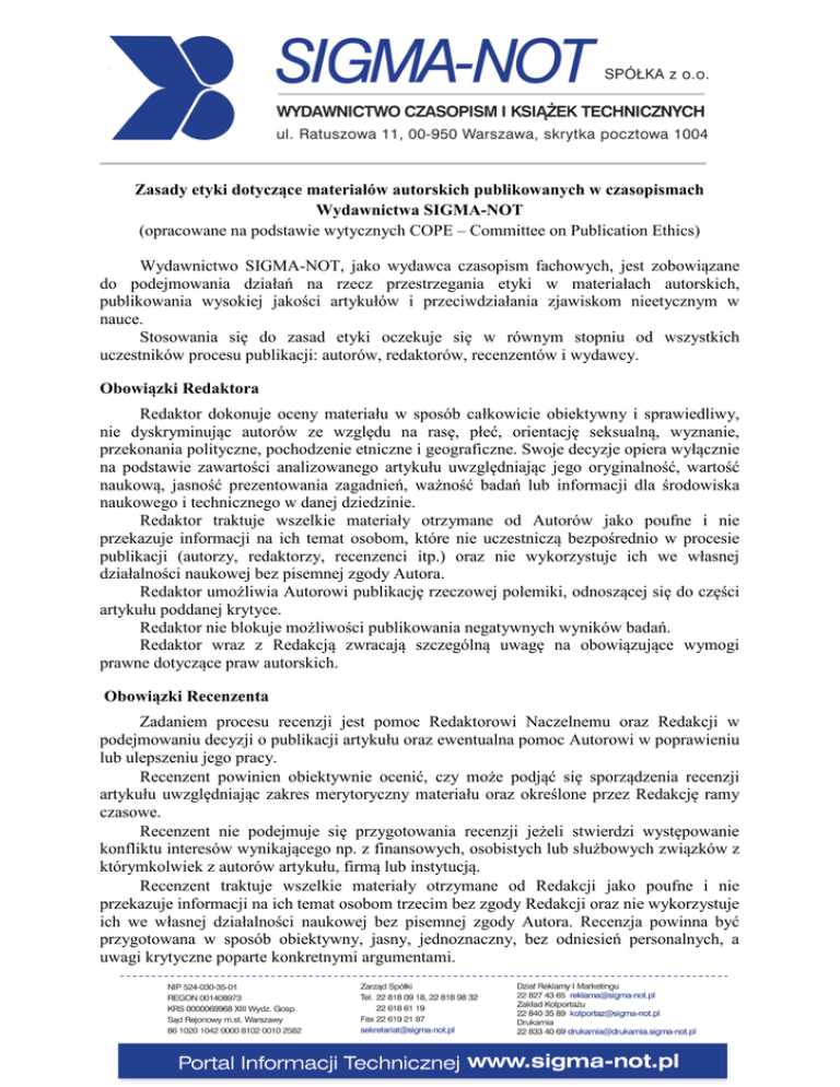 ______________________________________________________________________________________ Zasady etyki dotyczące materiałów autorskich publikowanych w czasopismach Wydawnictwa SIGMA-NOT (opracowane na podstawie wytycznych COPE – Committee on Publication Ethics) Wydawnictwo SIGMA-NOT, jako wydawca czasopism fachowych, jest zobowiązane do podejmowania działań na rzecz przestrzegania etyki w materiałach autorskich, publikowania wysokiej jakości artykułów i przeciwdziałania zjawiskom nieetycznym w nauce. Stosowania się do zasad etyki oczekuje się w równym stopniu od wszystkich uczestników procesu publikacji: autorów, redaktorów, recenzentów i wydawcy. Obowiązki Redaktora Redaktor dokonuje oceny materiału w sposób całkowicie obiektywny i sprawiedliwy, nie dyskryminując autorów ze względu na rasę, płeć, orientację seksualną, wyznanie, przekonania polityczne, pochodzenie etniczne i geograficzne. Swoje decyzje opiera wyłącznie na podstawie zawartości analizowanego artykułu uwzględniając jego oryginalność, wartość naukową, jasność prezentowania zagadnień, ważność badań lub informacji dla środowiska naukowego i technicznego w danej dziedzinie. Redaktor traktuje wszelkie materiały otrzymane od Autorów jako poufne i nie przekazuje informacji na ich temat osobom, które nie uczestniczą bezpośrednio w procesie publikacji (autorzy, redaktorzy, recenzenci itp.) oraz nie wykorzystuje ich we własnej działalności naukowej bez pisemnej zgody Autora. Redaktor umożliwia Autorowi publikację rzeczowej polemiki, odnoszącej się do części artykułu poddanej krytyce. Redaktor nie blokuje możliwości publikowania negatywnych wyników badań. Redaktor wraz z Redakcją zwracają szczególną uwagę na obowiązujące wymogi prawne dotyczące praw autorskich. Obowiązki Recenzenta Zadaniem procesu recenzji jest pomoc Redaktorowi Naczelnemu oraz Redakcji w podejmowaniu decyzji o publikacji artykułu oraz ewentualna pomoc Autorowi w poprawieniu lub ulepszeniu jego pracy. Recenzent powinien obiektywnie ocenić, czy może podjąć się sporządzenia recenzji artykułu uwzględniając zakres merytoryczny materiału oraz określone przez Redakcję ramy czasowe. Recenzent nie podejmuje się przygotowania recenzji jeżeli stwierdzi występowanie konfliktu interesów wynikającego np. z finansowych, osobistych lub służbowych związków z którymkolwiek z autorów artykułu, firmą lub instytucją. Recenzent traktuje wszelkie materiały otrzymane od Redakcji jako poufne i nie przekazuje informacji na ich temat osobom trzecim bez zgody Redakcji oraz nie wykorzystuje ich we własnej działalności naukowej bez pisemnej zgody Autora. Recenzja powinna być przygotowana w sposób obiektywny, jasny, jednoznaczny, bez odniesień personalnych, a uwagi krytyczne poparte konkretnymi argumentami. ___________________ __________________________________________________________________________________________ Recenzent powinien poinformować Redaktora jeżeli stwierdzi występowanie w artykule treści o znaczącym stopniu podobieństwa do występujących w innych publikacjach, które zna. Obowiązki Autora Autor przesyła do Redakcji wyłącznie materiały oryginalne i wcześniej niepublikowane, jednocześnie oświadczając, że przysługuje mu prawo rozporządzania tymi materiałami. Niedopuszczalne jest zgłaszanie artykułów jednocześnie do kilku wydawnictw. Artykuł powinien być przygotowany z uwzględnieniem właściwego cytowania źródeł oraz przedstawiać metody, badania i wyniki w sposób jasny i czytelny, tak by umożliwić prześledzenie toku rozumowania Autora i ewentualne powtórzenie badań przez innych badaczy w danej dziedzinie. Artykuł powinien uwzględniać stan wiedzy w danej dziedzinie, a wyniki badań powinny być szczegółowo i obiektywnie opisane i przeanalizowane. Jeżeli wyniki częściowe zostały wcześniej opublikowane, Autor powinien poinformować o tym fakcie Redaktora i umieścić informację o tym w artykule. Autor oświadcza, że dane badawcze wykorzystane w publikacji nie były fabrykowane lub manipulowane. Autorstwo artykułu jest ograniczone do osób, które miały znaczący wpływ na koncepcję, założenia, metody, prowadzenie badań i interpretację wyników oraz opracowanie merytoryczne artykułu. Wszystkie osoby, które miały znaczący wkład w powstanie artykułu muszą być wymienione jako współautorzy. Autor zgłaszający publikację powinien ujawnić wkład poszczególnych autorów w powstanie publikacji oraz upewnić się, że wszyscy współautorzy akceptują zgłoszenie artykułu do czasopisma oraz ostateczną wersję artykułu. Autor powinien zawiadomić Redakcję o zauważonych istotnych błędach w swojej publikacji i współdziałać z Redaktorem w celu ich poprawienia lub sprostowania. Autor powinien przechowywać źródłowe dane badawcze w celu ewentualnego udostępnienia ich na prośbę Redakcji lub uprawnionych instytucji. Autor potwierdza w uzasadnionym przypadku, że wszystkie badania przeprowadzone zostały z poszanowaniem zasad etycznych oraz formalnych obowiązujących w danej dziedzinie nauki (np. zgoda komisji bioetycznej). Autor powinien poinformować o źródłach finansowania publikacji, wkładzie instytucji naukowo-badawczych, stowarzyszeń i innych podmiotów (financial disclosure) oraz o ewentualnych konfliktach interesów, które mogą wiązać się z publikacją artykułu. Postępowanie w sytuacji stwierdzenia nieetycznych praktyk W sytuacji gdy zachodzi podejrzenie nierzetelności w opublikowanym lub zgłoszonym artykule, w szczególności dotyczącej zjawiska plagiatu, „ghostwriting” lub „guest authorship”, Redaktor podejmuje działania w celu wyjaśnieniu sprawy, przy czym w pierwszej kolejności prosi o ustosunkowanie się Autora. W przypadku potwierdzonej nierzetelności znacząco naruszającej zasady etyki Redaktor podejmuje dalsze kroki, do których może należeć m.in. opublikowanie in