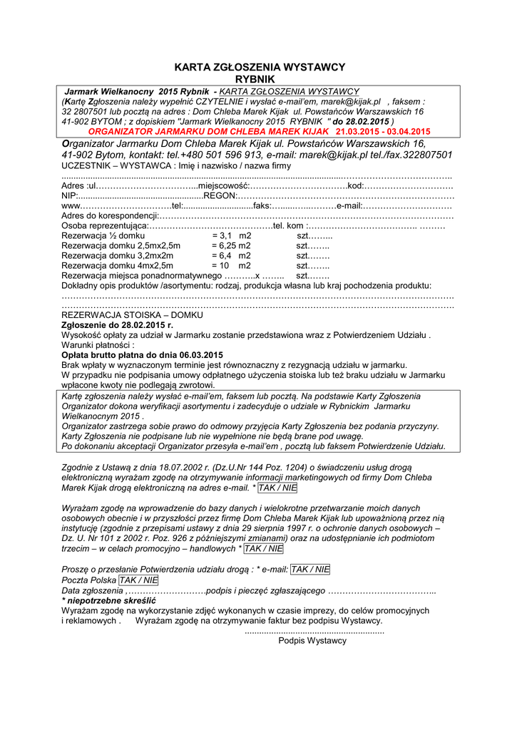KARTA ZGŁOSZENIA WYSTAWCY RYBNIK Jarmark Wielkanocny 2015 Rybnik - KARTA ZGŁOSZENIA WYSTAWCY (Kartę Zgłoszenia należy wypełnić CZYTELNIE i wysłać e-mail’em, [email protected] , faksem : 32 2807501 lub pocztą na adres : Dom Chleba Marek Kijak ul. Powstańców Warszawskich 16 41-902 BYTOM ; z dopiskiem "Jarmark Wielkanocny 2015 RYBNIK " do 28.02.2015 ) ORGANIZATOR JARMARKU DOM CHLEBA MAREK KIJAK 21.03.2015 - 03.04.2015 Organizator Jarmarku Dom Chleba Marek Kijak ul. Powstańców Warszawskich 16, 41-902 Bytom, kontakt: tel.+480 501 596 913, e-mail: [email protected] tel./fax.322807501 UCZESTNIK – WYSTAWCA : Imię i nazwisko / nazwa firmy .....................................................................................................................……………………………….. Adres :ul……………………………...miejscowość:…………………………….kod:…………………………. NIP:....................................................REGON:………………………………………………………………… www.………………………….tel:.............................faks:…......…...………e-mail:…………………………. Adres do korespondencji:………………………………………………………………………………………… Osoba reprezentująca:…………………………………….tel. kom :……………………………….. ……… Rezerwacja ½ domku = 3,1 m2 szt……... Rezerwacja domku 2,5mx2,5m = 6,25 m2 szt…….. Rezerwacja domku 3,2mx2m = 6,4 m2 szt.……. Rezerwacja domku 4mx2,5m = 10 m2 szt…….. Rezerwacja miejsca ponadnormatywnego ………..x …….. szt.……. Dokładny opis produktów /asortymentu: rodzaj, produkcja własna lub kraj pochodzenia produktu: ………………………………………………………………………………………………………………………. ………………………………………………………………………………………………………………………. REZERWACJA STOISKA – DOMKU Zgłoszenie do 28.02.2015 r. Wysokość opłaty za udział w Jarmarku zostanie przedstawiona wraz z Potwierdzeniem Udziału . Warunki płatności : Opłata brutto płatna do dnia 06.03.2015 Brak wpłaty w wyznaczonym terminie jest równoznaczny z rezygnacją udziału w jarmarku. W przypadku nie podpisania umowy odpłatnego użyczenia stoiska lub też braku udziału w Jarmarku wpłacone kwoty nie podlegają zwrotowi. Kartę zgłoszenia należy wysłać e-mail’em, faksem lub pocztą. Na podstawie Karty Zgłoszenia Organizator dokona weryfikacji asortymentu i zadecyduje o udziale w Rybnickim Jarmarku Wielkanocnym 2015 . Organizator zastrzega sobie prawo do odmowy przyjęcia Karty Zgłoszenia bez podania przyczyny. Karty Zgłoszenia nie podpisane lub nie wypełnione nie będą brane pod uwagę. Po dokonaniu akceptacji Organizator przesyła e-mail’em , pocztą lub faksem Potwierdzenie Udziału. Zgodnie z Ustawą z dnia 18.07.2002 r. (Dz.U.Nr 144 Poz. 1204) o świadczeniu usług drogą elektroniczną wyrażam zgodę na otrzymywanie informacji marketingowych od firmy Dom Chleba Marek Kijak drogą elektroniczną na adres e-mail. * TAK / NIE Wyrażam zgodę na wprowadzenie do bazy danych i wielokrotne przetwarzanie moich danych osobowych obecnie i w przyszłości przez firmę Dom Chleba Marek Kijak lub upoważnioną przez nią instytucję (zgodnie z przepisami ustawy z dnia 29 sierpnia 1997 r. o ochronie danych osobowych – Dz. U. Nr 101 z 2002 r. Poz. 926 z późniejszymi zmianami) oraz na udostępnianie ich podmiotom trzecim – w celach promocyjno – handlowych * TAK / NIE Proszę o przesłanie Potwierdzenia udziału drogą : * e-mail: TAK / NIE Poczta Polska TAK / NIE Data zgłoszenia ,………………………podpis i pieczęć zgłaszającego ……………………………….. * niepotrzebne skreślić Wyrażam zgodę na wykorzystanie zdjęć wykonanych w czasie imprezy, do celów promocyjnych i reklamowych . Wyrażam zgodę na otrzymywanie faktur bez podpisu Wystawcy. .......................................................... Podpis Wystawcy