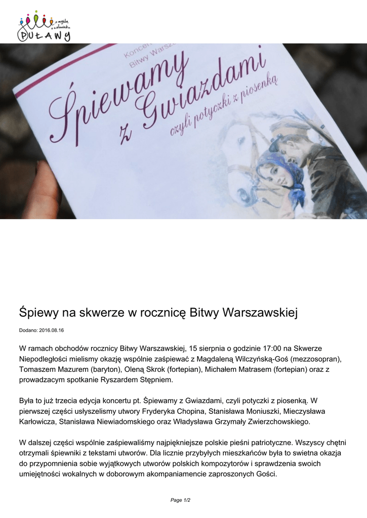 Śpiewy na skwerze w rocznicę Bitwy Warszawskiej Dodano: 2016.08.16 W ramach obchodów rocznicy Bitwy Warszawskiej, 15 sierpnia o godzinie 17:00 na Skwerze Niepodległości mielismy okazję wspólnie zaśpiewać z Magdaleną Wilczyńską-Goś (mezzosopran), Tomaszem Mazurem (baryton), Oleną Skrok (fortepian), Michałem Matrasem (fortepian) oraz z prowadzacym spotkanie Ryszardem Stępniem. Była to już trzecia edycja koncertu pt. Śpiewamy z Gwiazdami, czyli potyczki z piosenką. W pierwszej części usłyszelismy utwory Fryderyka Chopina, Stanisława Moniuszki, Mieczysława Karłowicza, Stanisława Niewiadomskiego oraz Władysława Grzymały Zwierzchowskiego. W dalszej części wspólnie zaśpiewaliśmy najpiękniejsze polskie pieśni patriotyczne. Wszyscy chętni otrzymali śpiewniki z tekstami utworów. Dla licznie przybyłych mieszkańców była to swietna okazja do przypomnienia sobie wyjątkowych utworów polskich kompozytorów i sprawdzenia swoich umiejętności wokalnych w doborowym akompaniamencie zaproszonych Gości. Page 1/2 Źródło: Page 2/2