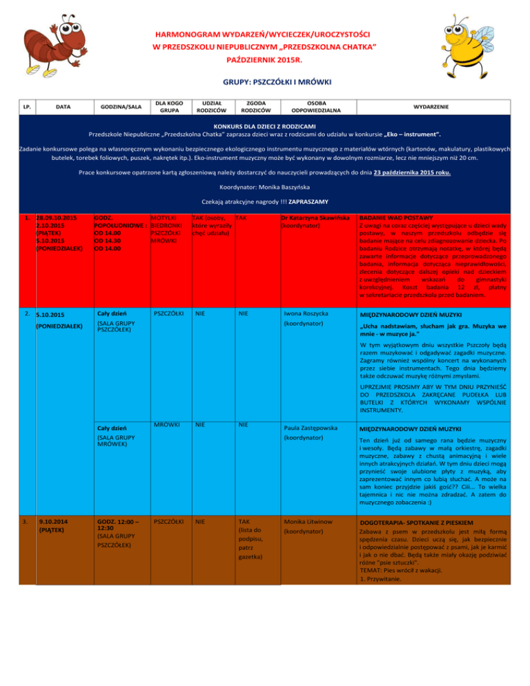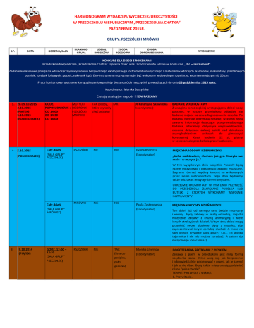 HARMONOGRAM WYDARZEŃ/WYCIECZEK/UROCZYSTOŚCI W PRZEDSZKOLU NIEPUBLICZNYM „PRZEDSZKOLNA CHATKA” PAŹDZIERNIK 2015R. GRUPY: PSZCZÓŁKI I MRÓWKI LP. DATA GODZINA/SALA DLA KOGO GRUPA UDZIAŁ RODZICÓW ZGODA RODZICÓW OSOBA ODPOWIEDZIALNA WYDARZENIE KONKURS DLA DZIECI Z RODZICAMI Przedszkole Niepubliczne „Przedszkolna Chatka” zaprasza dzieci wraz z rodzicami do udziału w konkursie „Eko – instrument”. Zadanie konkursowe polega na własnoręcznym wykonaniu bezpiecznego ekologicznego instrumentu muzycznego z materiałów wtórnych (kartonów, makulatury, plastikowych butelek, torebek foliowych, puszek, nakrętek itp.). Eko-instrument muzyczny może być wykonany w dowolnym rozmiarze, lecz nie mniejszym niż 20 cm. Prace konkursowe opatrzone kartą zgłoszeniową należy dostarczyć do nauczycieli prowadzących do dnia 23 października 2015 roku. Koordynator: Monika Baszyńska Czekają atrakcyjne nagrody !!! ZAPRASZAMY 1. 28.09.10.2015 2.10.2015 (PIĄTEK) 5.10.2015 (PONIEDZIAŁEK) 2. 5.10.2015 (PONIEDZIAŁEK) GODZ. POPOŁUDNIOWE : OD 14.00 OD 14.30 OD 14.00 Cały dzień MOTYLKI BIEDRONKI PSZCZÓŁKI MRÓWKI PSZCZÓŁKI TAK (osoby, TAK które wyraziły chęć udziału) NIE NIE (SALA GRUPY PSZCZÓŁEK) Dr Katarzyna Skawińska (koordynator) BADANIE WAD POSTAWY Z uwagi na coraz częściej występujące u dzieci wady postawy, w naszym przedszkolu odbędzie się badanie mające na celu zdiagnozowanie dziecka. Po badaniu Rodzice otrzymają notatkę, w której będą zawarte informacje dotyczące przeprowadzonego badania, informacja dotycząca nieprawidłowości, zlecenia dotyczące dalszej opieki nad dzieckiem z uwzględnieniem wskazań do gimnastyki korekcyjnej. Koszt badania 12 zł, płatny w sekretariacie przedszkola przed badaniem. Iwona Roszycka MIĘDZYNARODOWY DZIEŃ MUZYKI (koordynator) „Ucha nadstawiam, słucham jak gra. Muzyka we mnie - w muzyce ja." W tym wyjątkowym dniu wszystkie Pszczoły będą razem muzykować i odgadywać zagadki muzyczne. Zagramy również wspólny koncert na wykonanych przez siebie instrumentach. Tego dnia będziemy także odczuwać muzykę różnymi zmysłami. UPRZEJMIE PROSIMY ABY W TYM DNIU PRZYNIEŚĆ DO PRZEDSZKOLA ZAKRĘCANE PUDEŁKA LUB BUTELKI Z KTÓRYCH WYKONAMY WSPÓLNIE INSTRUMENTY. Cały dzień MRÓWKI NIE NIE (SALA GRUPY MRÓWEK) 3. 9.10.2014 (PIĄTEK) GODZ. 12:00 – 12:30 (SALA GRUPY PSZCZÓŁEK) PSZCZÓŁKI NIE TAK (lista do podpisu, patrz gazetka) Paula Zastępowska MIĘDZYNARODOWY DZIEŃ MUZYKI (koordynator) Ten dzień już od samego rana będzie muzyczny i wesoły. Będą zabawy w małą orkiestrę, zagadki muzyczne, zabawy z chustą animacyjną i wiele innych atrakcyjnych działań. W tym dniu dzieci mogą przynieść swoje ulubione płyty z muzyką, aby zaprezentować innym co lubią słuchać. A może na sam koniec przyjdzie jakiś gość?? Ciii... To wielka tajemnica i nic nie można zdradzać. A zatem do muzycznego zobaczenia :) Monika Litwinow DOGOTERAPIA- SPOTKANIE Z PIESKIEM Zabawa z psem w przedszkolu jest miłą formą spędzenia czasu. Dzieci uczą się, jak bezpiecznie i odpowiedzialnie postępować z psami, jak je karmić i jak o nie dbać. Będą także miały okazję podziwiać różne "psie sztuczki". TEMAT: Pies wrócił z wakacji. 1. Przywitanie. (koordynator) 4. 13.10.2015 (WTOREK) GODZ. 12:30 13:00 (SALA GRUPY MRÓWEK) MRÓWKI NIE TAK (lista do podpisu, patrz gazetka) 2. Przypomnienie zasad bezpiecznego kontaktu z psem. 3. Zabawa z psem - przybijanie piąteczki i tańczenie. 4. Przypomnienie najbardziej ulubionych sztuczek. 5. Gdzie pies mógł być na wakacjach? pocztówka z wakacji. 6. Zabawa z psem - tunele. 7. Pożegnanie. PROSIMY O PODPISANIE ZGODY NA UDZIAŁ W ZAJĘCIACH Z DOGOTERAPII. GODZ. 15.3016.15 SALA GRUPY MOTYLKI BIEDRONKI PSZCZÓŁKI MRÓWKI TAK TAK Paula Zastępowska (lista do (koordynator) podpisu, patrz gazetka) decyduje kolejność zgłoszeń WARSZTAT PEDAGOGIZUJĄCY DLA RODZICÓW PT. „WZMACNIANIE POCZUCIA WŁASNEJ WARTOŚCI – DROGĄ ROZWOJU” Istotą wychowywania dzieci, czymś, dzięki czemu nasze dzieci dzień w dzień przynoszą nam radość, jest sztuka porozumiewania się. Dzieci nie są przedmiotami. Dzieci myślą, czują, obserwują i naśladują nas dorosłych. Jeżeli będziemy mieli z nimi dobry kontakt, wzrośnie zarówno ich, jak i nasz szacunek do samych siebie. Z różnych powodów nasze dzieci mogą mieć niższe albo wyższe poczucie własnej wartości. Na warsztatach dowiemy się jak pomóc naszemu dziecku, aby wzmocniło swoją samoocenę. Dowiemy się jakich zwrotów unikać, aby przypadkowo nie obniżyć poczucia własnej wartości. RODZICÓW CHĘTNYCH DO UDZIAŁU W WARSZTATCH PROSIMY O WPISANIE SIĘ NA LISTĘ. DRODZY RODZICE, PAMIĘTAJCIE, ABY ZABRAĆ ZE SOBĄ OBUWIE ZMIENNE. WARSZTATY DLA RODZICÓW BEZ DZIECI 5. 14.10.2015 (ŚRODA) GODZ. 9:00 MOTYLKI BIEDRONKI PSZCZÓŁKI MRÓWKI 6. 15.10.2015 (CZWARTEK) GODZ. 11.00 SALA GRUPY PSZCZÓŁEK PSZCZÓŁKI 7. 16.10.2015 (PIĄTEK) GODZ. 11.00 SALA GRUPY MRÓWEK MRÓWKI 8. 15.10.2015 (CZWATEK) GODZ. 15.3016.15 SALA GRUPY PSZCZÓŁEK MOTYLKI NIE NIE STUDIO FOTOGRAFICZNE ZDJĘCIA W PRZEDSZKOLU Nasze dzieci wezmą udział w jesiennej sesji fotograficznej. Zdjęcia będą dostępne do wglądu dla wszystkich po wykonaniu usługi i to Wy, Drodzy Rodzice, zadecydujecie wówczas czy kupić zdjęcia czy nie. Zdjęcia które nie zostaną kupione są niszczone. NIE NIE TAK TAK Barbara Piotrowska (lista do (koordynator) podpisu, patrz gazetka) decyduje kolejność zgłoszeń BIEDRONKI PSZCZÓŁKI MRÓWKI Monika Baszyńska (koordynator) I SPOTKANIE W RAMACH PROGRAMU PT. „KUCHCIKOWO NA ŚWIECIE” W tym miesiącu wybierzemy się do słonecznej Hiszpanii ☺ U nas lato dobiegło końca, ale możemy je przedłużyć dodając troszeczkę słońca do naszego posiłku. Nasze śniadanie będzie w słonecznych kolorach, a to nam zapewnią pomarańcze, mandarynki, a także inne owoce, które wszystkie razem wymieszane stworzą hiszpańską s